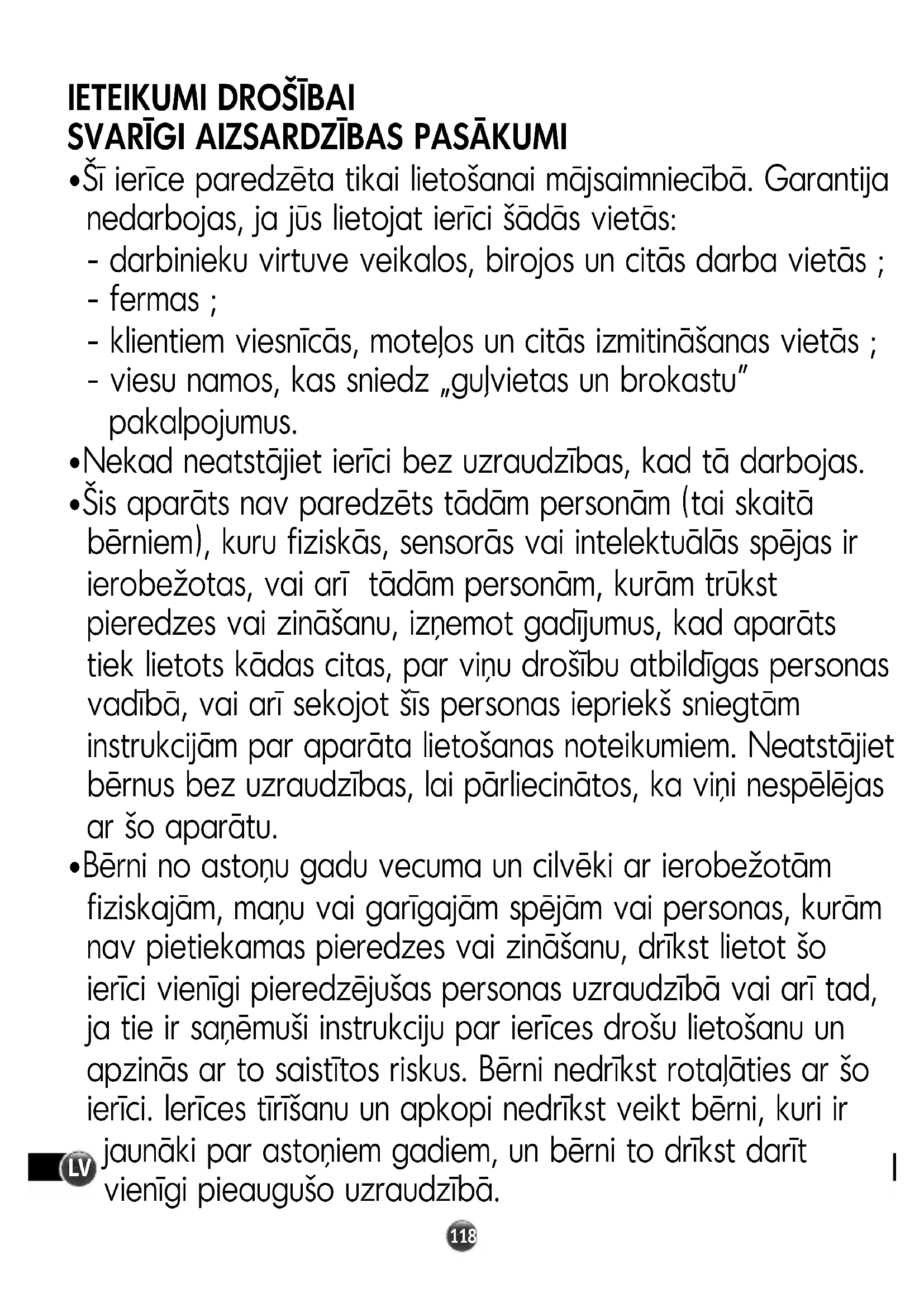 - Bērni no astoņu gadu vecuma un cilvēki ar ierobežotām fiziskajām, maņu vai garīgajām spējām vai personas, kurām nav pietiekamas pieredzes vai zināšanu, drīkst lietot šo ierīci vienīgi pieredzējušas personas uzraudzībā vai arī tad, ja tie ir saņēmuši instrukciju par ierīces drošu lietošanu un apzinās ar to saistītos riskus. Bērni nedrīkst rotaļāties ar šo ierīci. Ierīces tīrīšanu un apkopi nedrīkst veikt bērni, kuri ir jaunāki par astoņiem gadiem, un bērni to drīkst darīt vienīgi pieaugušo uzraudzībā.