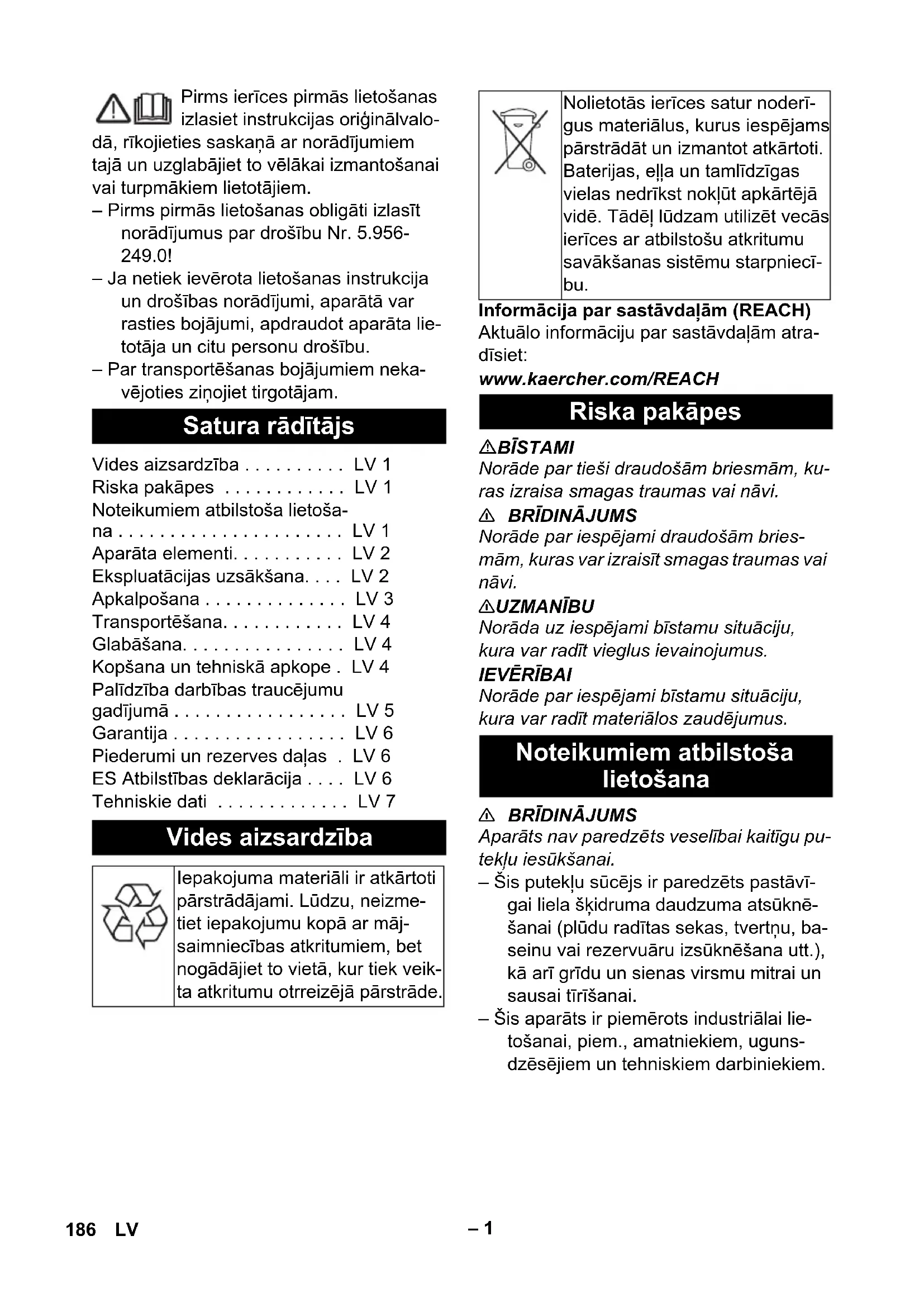 Aparāts nav paredzē ts veselībai kaitīgu pu- tekļu iesūkšanai. – Šis putekļu sūcējs ir paredzēts pastāvī- gai liela šķidruma daudzuma atsūknē- šanai (plūdu radītas sekas, tvertņu, ba- seinu vai rezervuāru izsūknēšana utt.), kā arī grīdu un sienas virsmu mitrai un sausai tīrīšanai. – Šis aparāts ir piemērots industriālai lie- tošanai, piem., amatniekiem, uguns- dzēsējiem un tehniskiem darbiniekiem. Satura rādītājs Vides aizsardzība . . . . . . . . . . LV 1 Riska pakāpes . . . . . . . . . . . . LV 1 Noteikumiem atbilstoša lietoša- na . . . . . . . . . . . . . . . . . . . . . . LV 1 Aparāta elementi. . . . . . . . . . . LV 2 Ekspluatācijas uzsākšana. . . . LV 2 Apkalpošana . . . . . . . . . . . . . . LV 3 Transportēšana. . . . . . . . . . . . LV 4 Glabāšana. . . . . . . . . . . . . . . . LV 4 Kopšana un tehniskā apkope . LV 4 Palīdzība darbības traucējumu gadījumā . . . . . . . . . . . . . . . . . LV 5 Garantija . . . . . . . . . . . . . . . . . LV 6 Piederumi un rezerves daļas . LV 6 ES Atbilstības deklarācija . . . . LV 6 Tehniskie dati . . . . . . . . . . . . . LV 7 Vides aizsardzība Iepakojuma materiāli ir atkārtoti pārstrādājami. Lūdzu, neizme- tiet iepakojumu kopā ar māj- saimniecības atkritumiem, bet nogādājiet to vietā, kur tiek veik- ta atkritumu otrreizējā pārstrāde. Nolietotās ierīces satur noderī- gus materiālus, kurus iespējams pārstrādāt un izmantot atkārtoti. Baterijas, eļļa un tamlīdzīgas vielas nedrīkst nokļūt apkārtējā vidē. Tādēļ lūdzam utilizēt vecās ierīces ar atbilstošu atkritumu savākšanas sistēmu starpniecī- bu. Riska pakāpes Noteikumiem atbilstoša lietošana 186 LV– 2 1 Pludiņš 2 Tīkla kabelis 3 Ierīces kontaktdakša 4 Sūkšanas šļūtene 5 Sūkšanas galviņas fiksators 6 Netīrumu tvertne 7 Atsūknēšanas sūkņa kabeļa turētājs 8 Noslēgplāksne 9 Vadrullīšu stiprinājums 10 Vadrullītis 11 Sprausla grīdas tīrīšanai 12 Grīdas sprauslas augstuma regulēšana 13 Sūkšanas caurule 14 Sūkšanas uzgalis 15 Sūkšanas galviņa 16 Atsūknēšanas sūknis 17 Atsūknēšanas sūkņa uzmavuzgrieznis 18 Rokturis aparāta pārnēsāšanai 19 Filtra pārsegs 20 Vadāmais rokturis 21 Līkums 22 Atsūknēšanas sūkņa pludiņa slēdzis 23 Priekšfiltrs 24 Atsūknēšanas sūkņa kontaktdakša 25 Slēdzis "Atsūknēšanas sūknis IZSL." 26 Kontaktligzda 27 Slēdzis "Atsūknēšanas sūknis IESL." 28 Galvenais slēdzis 29 Gaisa izplūdes filtrs 30 Lielo netīrumu filtrs/plakani salocītais filtrs 31 Noteces šļūtene 32 Noslēgvāciņš (GEKA-C savienojums) 33 Kabeļa āķis 34 Datu plāksnīte Aparātu iespējams lietot 3 darbības režīmos: 1 Mitrā sūkšana ar atsūknēšanas sūkni 2 Mitrā sūkšana bez atsūknēšanas sūkņa 3 Sausā sūkšana Norāde: mitrā sūkšana ir iespējama arī tad, ja atsūknēšanas sūknis ir izslēgts vai de- montēts. Par atsūknēšanas sūkņa demon- tāžu lasiet nodaļā "Sausā sūkšana". Attēls Demontējiet suku strēmeles. Iemontējiet gumijas mēlītes. Norāde: gumijas mēlīšu rievotajai malai jā- būt vērstai uz ārpusi. Attēls Atbloķēt un noņemt sūkšanas galviņu. Izņemt papīra/flīsa filtra maisiņu virzie- nā uz aizmuguri. Uzlikt un nofiksēt sūkšanas galviņu. – Uzsūcot slapjus netīrumus, papīra vai flīsa filtra maisiņš vienmēr ir jāizņem. Attēls Atbloķēt un noņemt sūkšanas galviņu. Izņemiet membrānas filtru. Uzlikt un nofiksēt sūkšanas galviņu. – Uzsūcot slapjus netīrumus, membrā- nas filtrs vienmēr ir jāizņem. Atveriet filtra pārsegu. Izņemt plakani salocīto filtru. Ielieciet lielo netīrumu filtru. Aizveriet filtra pārsegu, tam dzirdami ir jānofiksējas. Attēls Noņemiet noslēgvāciņu (GEKA-C sa- vienojums). Pieslēdziet atsūknēšanas šļūteni (no- minālais diametrs 3/4" vai lielāks). Attēls Izlejiet netīro ūdeni pa noteces šļūteni.