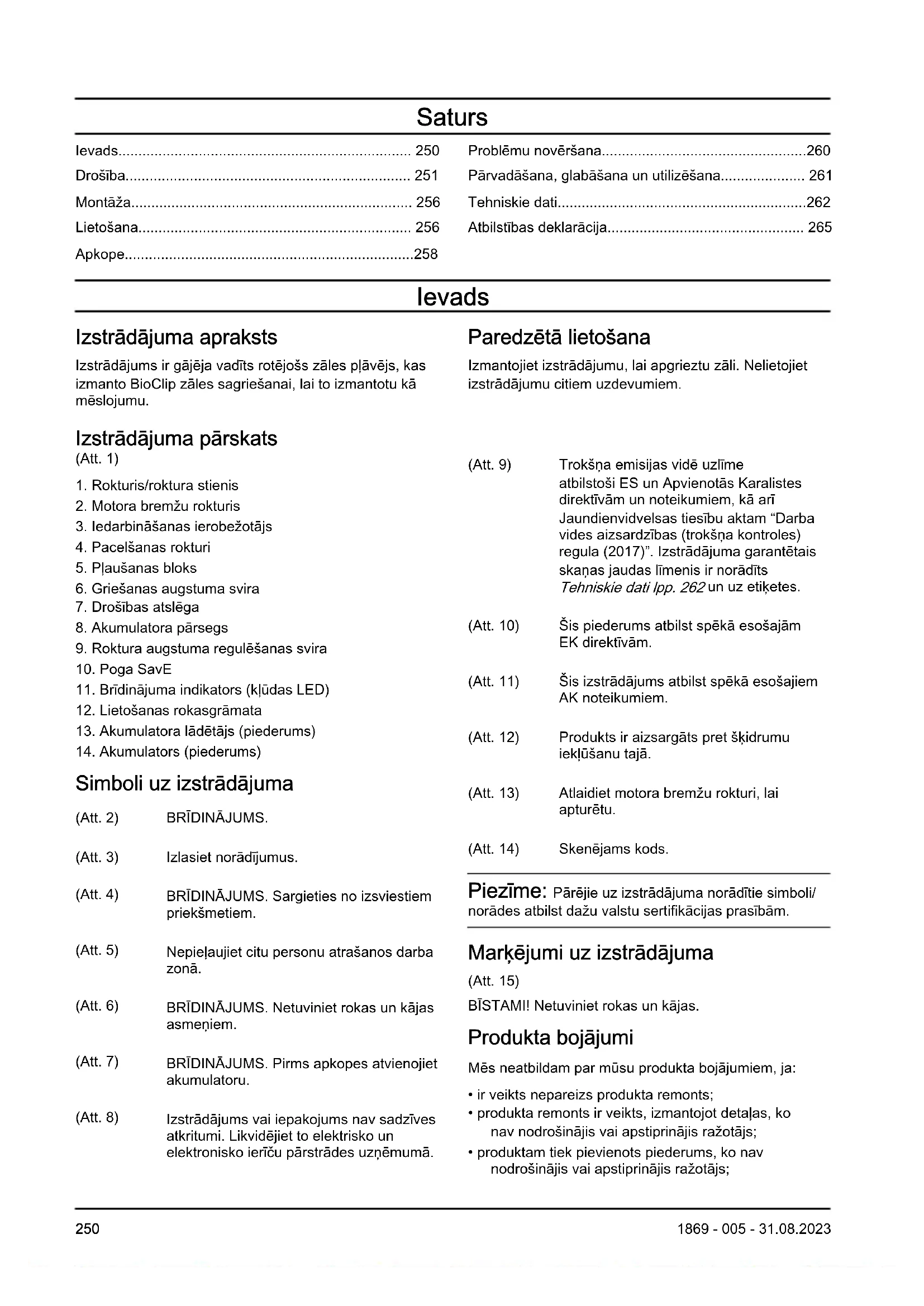 Simboli uz izstrādājuma (Att. 2) BRĪDINĀJUMS. (Att. 3) Izlasiet norādījumus. (Att. 4) BRĪDINĀJUMS. Sargieties no izsviestiem priekšmetiem. (Att. 5) Nepieļaujiet citu personu atrašanos darba zonā. (Att. 6) BRĪDINĀJUMS. Netuviniet rokas un kājas asmeņiem. (Att. 7) BRĪDINĀJUMS. Pirms apkopes atvienojiet akumulatoru. (Att. 8) Izstrādājums vai iepakojums nav sadzīves atkritumi. Likvidējiet to elektrisko un elektronisko ierīču pārstrādes uzņēmumā. (Att. 9) Trokšņa emisijas vidē uzlīme atbilstoši ES un Apvienotās Karalistes direktīvām un noteikumiem, kā arī Jaundienvidvelsas tiesību aktam “Darba vides aizsardzības(trokšņa kontroles) regula(2017)”. Izstrādājuma garantētais skaņas jaudas līmenis ir norādīts Tehniskie dati lpp. 262 un uz etiķetes. (Att. 10) Šis piederums atbilst spēkā esošajām EKdirektīvām. (Att. 11) Šis izstrādājums atbilst spēkā esošajiem AK noteikumiem. (Att. 12) Produkts ir aizsargāts pret šķidrumu iekļūšanu tajā. (Att. 13) Atlaidiet motora bremžu rokturi, lai apturētu. (Att. 14) Skenējams kods. Piezīme: Pārējie uz izstrādājuma norādītie simboli/ norādes atbilst dažu valstu sertifikācijas prasībām. Marķējumi uz izstrādājuma (Att. 15) BĪSTAMI! Netuviniet rokas un kājas. Produkta bojājumi Mēs neatbildam par mūsu produkta bojājumiem, ja: