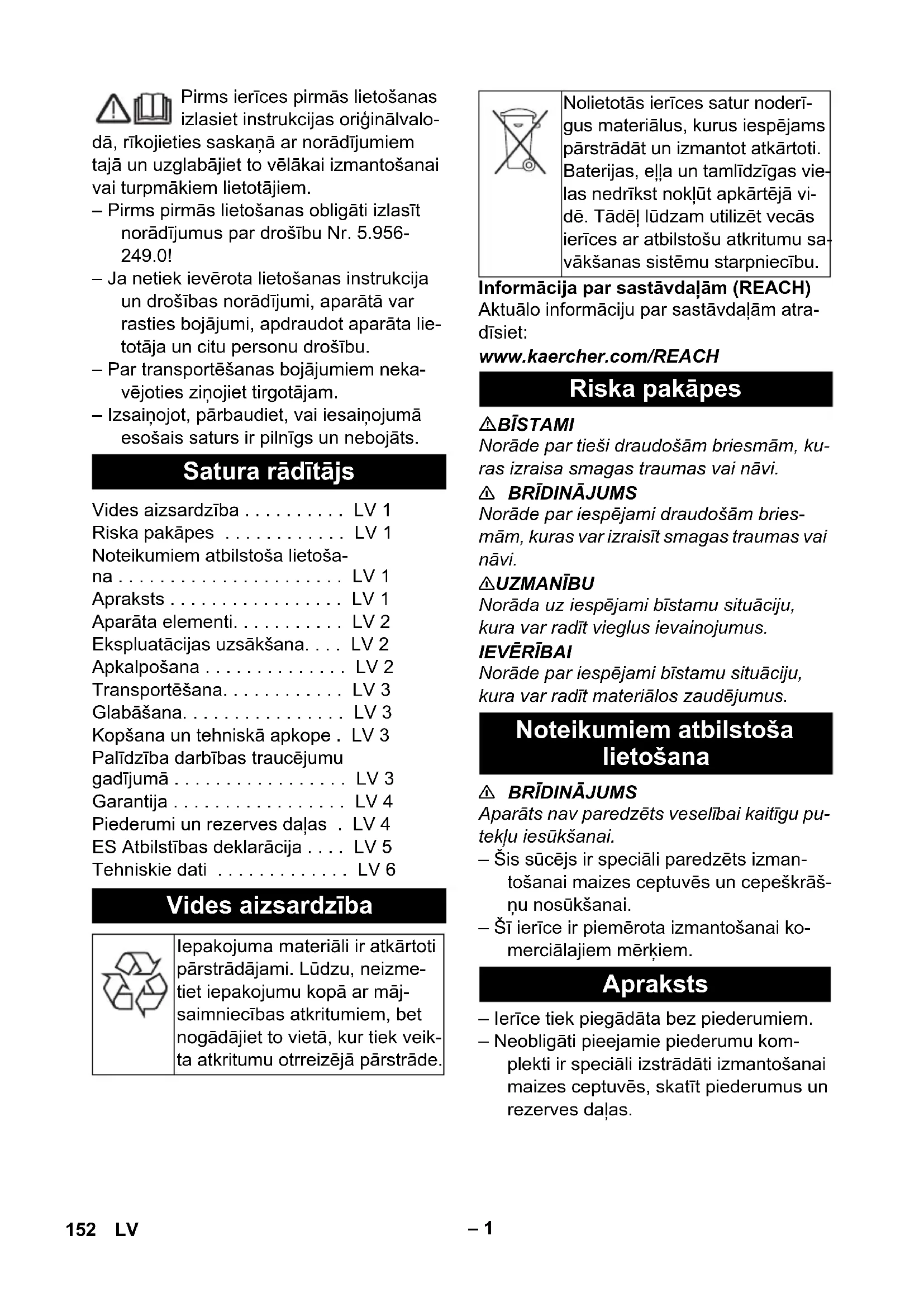 Detaili nr.: Kaabli pikkus EU 6.650-591.0 7,5 m 151ET– 1 Pirms ierīces pirmās lietošanas izlasiet instrukcijas oriģinālvalo- dā, rīkojieties saskaņā ar norādījumiem tajā un uzglabājiet to vēlākai izmantošanai vai turpmākiem lietotājiem. – Pirms pirmās lietošanas obligāti izlasīt norādījumus par drošību Nr. 5.956- 249.0! – Ja netiek ievērota lietošanas instrukcija un drošības norādījumi, aparātā var rasties bojājumi, apdraudot aparāta lie- totāja un citu personu drošību. – Par transportēšanas bojājumiem neka- vējoties ziņojiet tirgotājam. – Izsaiņojot, pārbaudiet, vai iesaiņojumā esošais saturs ir pilnīgs un nebojāts. Informācija par sastāvdaļām (REACH) Aktuālo informāciju par sastāvdaļām atra- dīsiet: www.kaercher.com/REACH BĪSTAMI Norāde par tieši draudošām briesmām, ku- ras izraisa smagas traumas vai nāvi.
