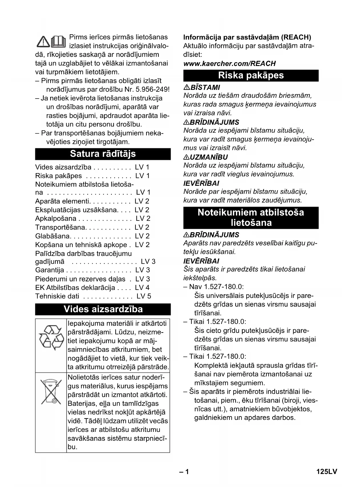 Šis aparāts ir paredzēts tikai lietošanai iekštelpās. – Nav 1.527-180.0: Šis universālais putekļusūcējs ir pare- dzēts grīdas un sienas virsmu sausajai tīrīšanai. – Tikai 1.527-180.0: Šis cieto grīdu putekļusūcējs ir pare- dzēts grīdas un sienas virsmu sausajai tīrīšanai. – Tikai 1.527-180.0: Komplektā iekļautā sprausla grīdas tīrī- šanai nav piemērota izmantošanai uz mīkstajiem segumiem. – Šis aparāts ir piemērots industriālai lie- tošanai, piem., ēku tīrīšanai (biroji, vies- nīcas utt.), amatniekiem būvobjektos, galdniekiem un apdares darbos. Satura rādītājs Vides aizsardzība . . . . . . . . . . LV 1 Riska pakāpes . . . . . . . . . . . . LV 1 Noteikumiem atbilstoša lietoša- na . . . . . . . . . . . . . . . . . . . . . . LV 1 Aparāta elementi. . . . . . . . . . . LV 2 Ekspluatācijas uzsākšana. . . . LV 2 Apkalpošana . . . . . . . . . . . . . . LV 2 Transportēšana. . . . . . . . . . . . LV 2 Glabāšana. . . . . . . . . . . . . . . . LV 2 Kopšana un tehniskā apkope . LV 2 Palīdzība darbības traucējumu gadījumā . . . . . . . . . . . . . . . . . LV 3 Garantija . . . . . . . . . . . . . . . . . LV 3 Piederumi un rezerves daļas . LV 3 EK Atbilstības deklarācija . . . . LV 4 Tehniskie dati . . . . . . . . . . . . . LV 5 Vides aizsardzība Iepakojuma materiāli ir atkārtoti pārstrādājami. Lūdzu, neizme- tiet iepakojumu kopā ar māj- saimniecības atkritumiem, bet nogādājiet to vietā, kur tiek veik- ta atkritumu otrreizējā pārstrāde. Nolietotās ierīces satur noderī- gus materiālus, kurus iespējams pārstrādāt un izmantot atkārtoti. Baterijas, eļļa un tamlīdzīgas vielas nedrīkst nokļūt apkārtējā vidē. Tādēļ lūdzam utilizēt vecās ierīces ar atbilstošu atkritumu savākšanas sistēmu starpniecī- bu. Riska pakāpes Noteikumiem atbilstoša lietošana 125LV– 2 1Flīsa filtra maisiņš 2Sūkšanas uzgalis 3Sūkšanas šļūtene 4 Datu plāksnīte 5 Rokturis aparāta pārnēsāšanai 6Šļūtenes turētājs 7 Kabeļa turētājs 8Tīkla kabelis 9Sūkšanas galviņa 10 Sūkšanas galviņas fiksators 11 Vadrullītis 12 Netīrumu tvertne 13 Galvenais slēdzis 14 Pārslēgs "Cieta virsma/paklājs" (atkarībā no aprīkojuma) 15 Sprausla grīdas tīrīšanai 16 Sūkšanas caurule 17 Sūkšanas jaudas regulators (bezpa- kāpju) (atkarībā no aprīkojuma) 18 Līkums 19 Galvenais filtrelements 20 Motora aizsargfiltrs 1 Darbs ar filtra maisiņu 2 Izmantošana bez filtra maisiņa Pārbaudiet, vai aparātā ir ievietots gal- venais filtrelements. Atbloķēt un noņemt sūkšanas galviņu. Izņemiet galveno filtrelementu. Uzlikt flīsa filtra maisiņu. Ievietojiet galveno filtrelementu. Uzlikt un nofiksēt sūkšanas galviņu. Pievienojiet kontaktspraudni kontakt- ligzdai. Ieslēdziet aparāta galveno slēdzi. Nav 1.527-180.0: Pārslēdziet grīdas sprauslas pārslēgu uz cietu virsmu vai uz paklāju. Tikai ProT 200: Ar sūkšanas jaudas regulatoru noregu- lējiet sūkšanas jaudu (bezpakāpju). Veiciet tīrīšanu. Izslēdziet aparāta galveno slē dzi. Izņemt tīkla kontaktdakšu. Iztukšojiet tvertni. Aparātu no ārpuses un no iekšpuses iz- tīriet, to nosūcot un notīrot ar mitru lupa- tiņu. 몇 UZMANĪBU Savainošanās un bojājumu risks! Trans- portējot ņemiet vērā aparāta svaru. Transportējot automašīnā, saskaņā ar spēkā esošajām direktīvām nodrošiniet aparātu pret izslīdēšanu un apgāšanos. 몇 UZMANĪBU Savainošanās un bojājumu risks! Uzglabā- jot ņemiet vērā aparāta svaru. Šo aparātu drīkst uzglabā t tikai iekštelpās. BĪSTAMI Pirms visiem darbiem ar ierīci, izslēdziet ie- rīci un atvienojiet tīkla kontaktdakšu. Vajadzības gadījumā galveno filtrele- mentu (mazgājams) izskalojiet zem ūdens strūklas.