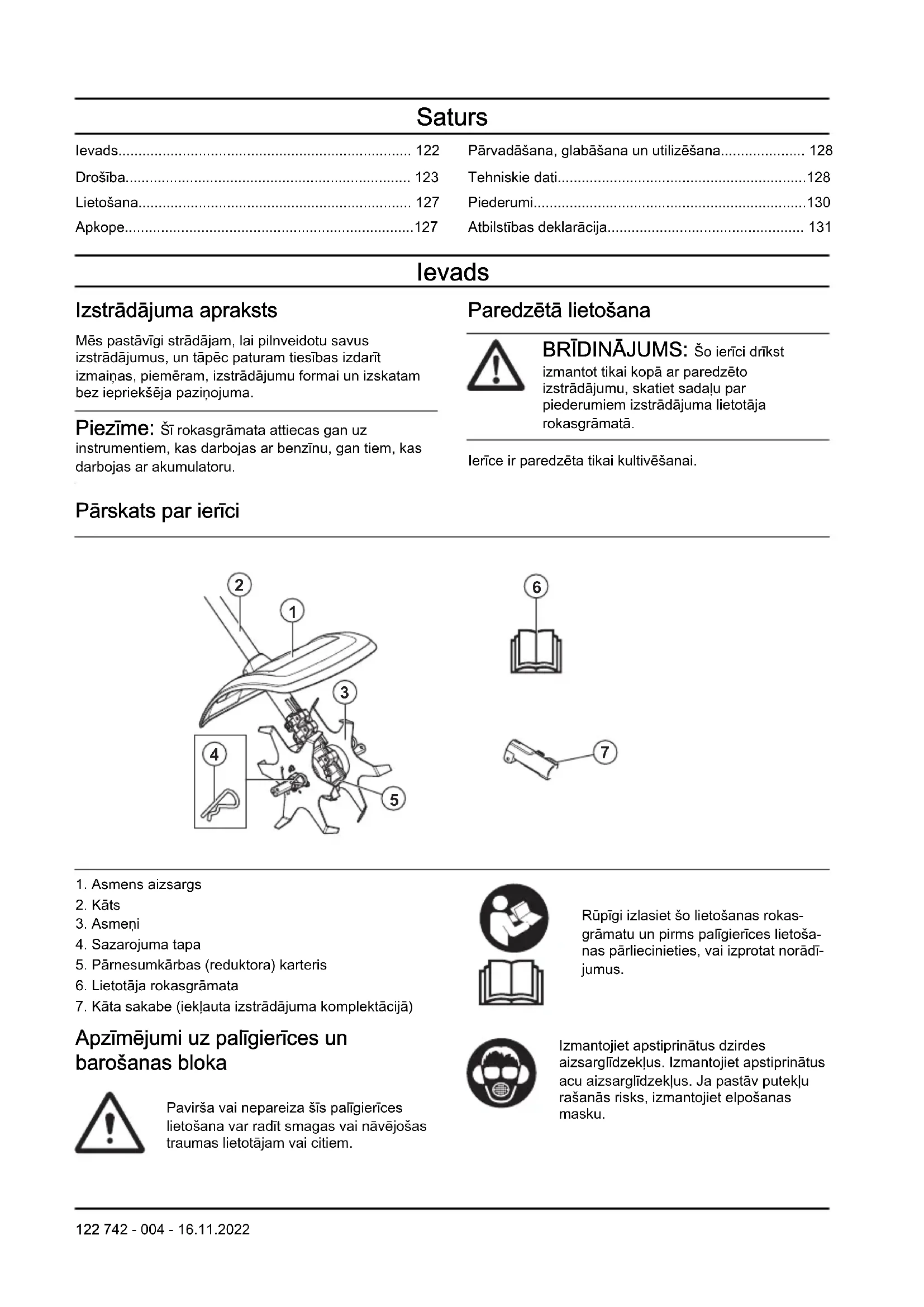 - Atbilstības deklarācija Ievads Izstrādājuma apraksts Mēs pastāvīgi strādājam, lai pilnveidotu savus izstrādājumus, un tāpēc paturam tiesības izdarīt izmaiņas, piemēram, izstrādājumu formai un izskatam bez iepriekšēja paziņojuma. Piezīme: Šī rokasgrāmata attiecas gan uz instrumentiem, kas darbojas ar benzīnu, gan tiem, kas darbojas ar akumulatoru. Paredzētā lietošana BRĪDINĀJUMS: Šo ierīci drīkst izmantot tikai kopā ar paredzēto izstrādājumu, skatiet sadaļu par piederumiem izstrādājuma lietotāja rokasgrāmatā. Ierīce ir paredzēta tikai kultivēšanai. Pārskats par ierīci p. 131