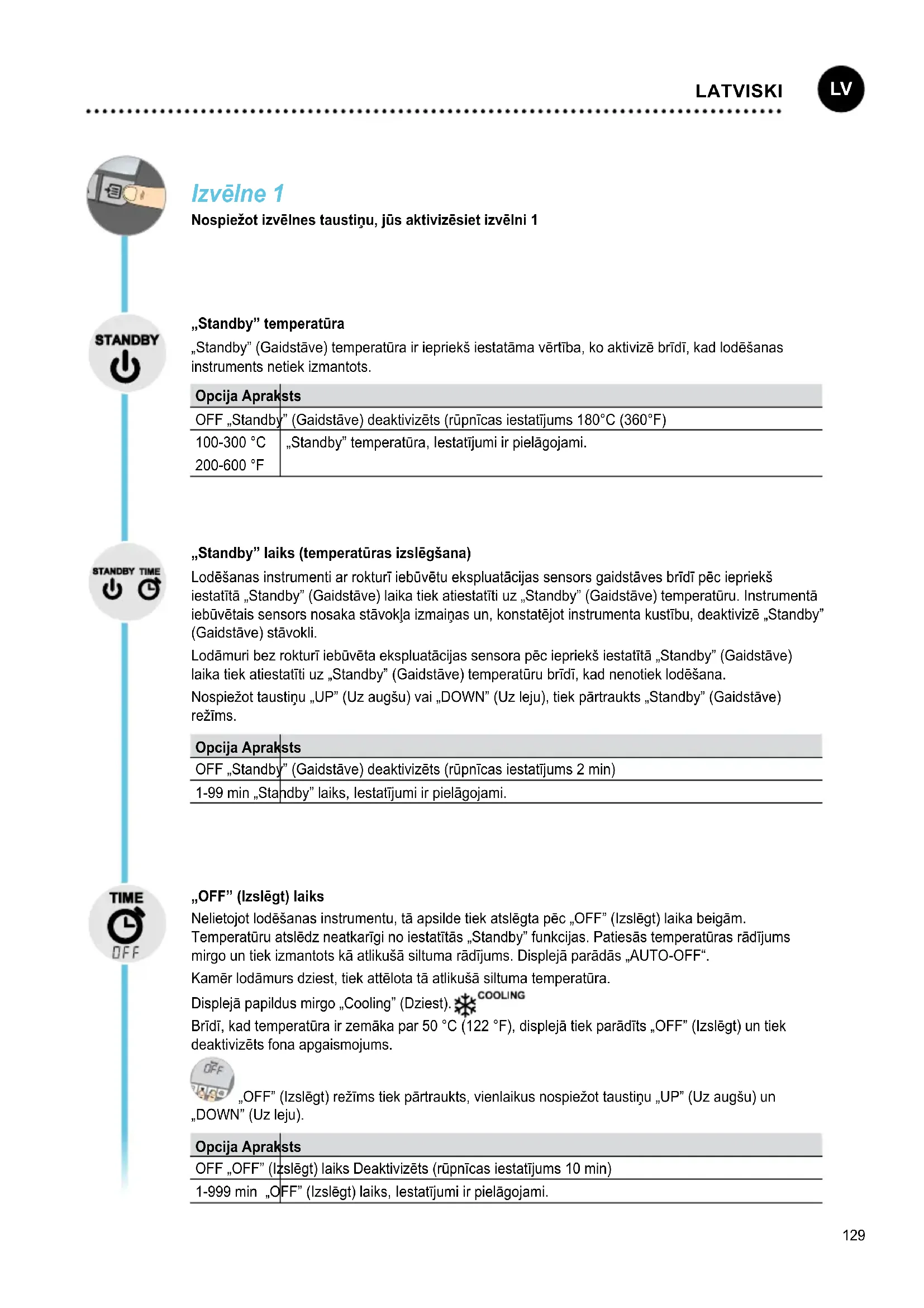 EESTI129 Izvēlne 1 Nospiežot izvēlnes taustiņu, jūs aktivizēsiet izvēlni 1 „Standby” temperatūra „Standby” (Gaidstāve) temperatūra ir iepriekš iestatāma vērtība, ko aktivizē brīdī, kad lodēšanas instruments netiek izmantots. Opcija Apraksts OFF „Standby” (Gaidstāve) deaktivizēts (rūpnīcas iestatījums 180°C (360°F) 100-300 °C 200-600 °F „Standby” temperatūra, Iestatījumi ir pielāgojami. „Standby” laiks (temperatūras izslēgana) Lodēšanas instrumenti ar rokturī iebūvētu ekspluatācijas sensors gaidstāves brīdī pēc iepriekš iestatītā „Standby” (Gaidstāve) laika tiek atiestatīti uz „Standby” (Gaidstāve) temperatūru. Instrumentā iebūvētais sensors nosaka stāvokļa izmaiņas un, konstatējot instrumenta kustību, deaktivizē „Standby” (Gaidstāve) stāvokli. Lodāmuri bez rokturī iebūvēta ekspluatācijas sensora pēc iepriekš iestatītā „Standby” (Gaidstāve) laika tiek atiestatīti uz „Standby” (Gaidstāve) temperatūru brīdī, kad nenotiek lodēšana. Nospiežot taustiņu „UP” (Uz augšu) vai „DOWN” (Uz leju), tiek pārtraukts „Standby” (Gaidstāve) režīms. Opcija Apraksts OFF „Standby” (Gaidstāve) deaktivizēts (rūpnīcas iestatījums 2 min) 1-99 min „Standby” laiks, Iestatījumi ir pielāgojami. „OFF” (Izslēgt) laiks Nelietojot lodēšanas instrumentu, tā apsilde tiek atslēgta pēc „OFF” (Izslēgt) laika beigām. Temperatūru atslēdz neatkarīgi no iestatītās „Standby” funkcijas. Patiesās temperatūras rādījums mirgo un tiek izmantots kā atlikušā siltuma rādījums. Displejā parādās „AUTO-OFF“. Kamēr lodāmurs dziest, tiek attēlota tā atlikušā siltuma temperatūra. Displejā papildus mirgo „Cooling” (Dziest). Brīdī, kad temperatūra ir zemāka par 50 °C (122 °F), displejā tiek parādīts „OFF” (Izslēgt) un tiek deaktivizēts fona apgaismojums. „OFF” (Izslēgt) režīms tiek pārtraukts, vienlaikus nospiežot taustiņu „UP” (Uz augšu) un „DOWN” (Uz leju). Opcija Apraksts OFF „OFF” (Izslēgt) laiks Deaktivizēts (rūpnīcas iestatījums 10 min) 1-999 min „OFF” (Izslēgt) laiks, Iestatījumi ir pielāgojami.