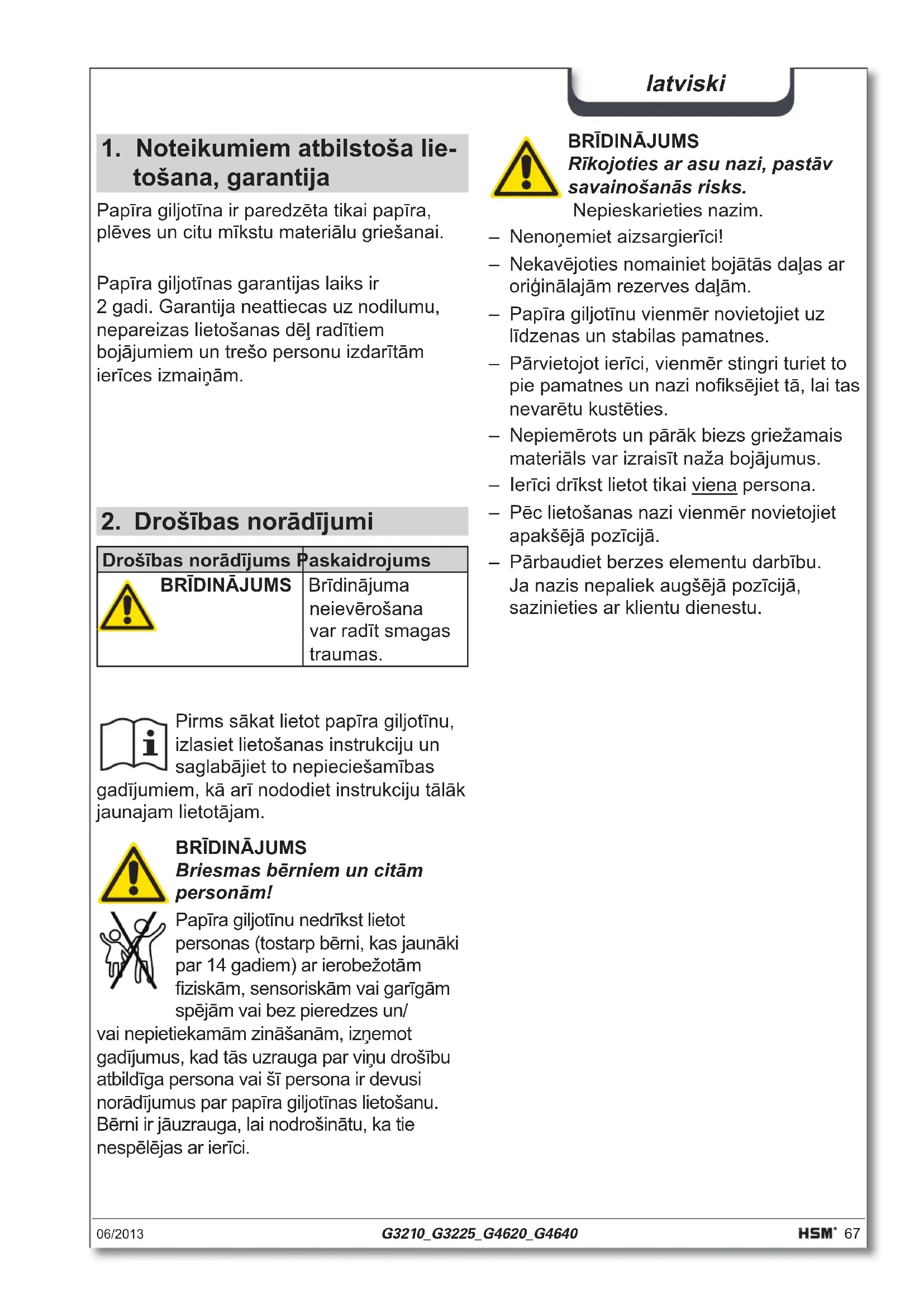 Rīkojoties ar asu nazi, pastāv savainošanās risks. Nepieskarieties nazim. – Nenoņemiet aizsargierīci! – Nekavējoties nomainiet bojātās daļas ar oriģinālajām rezerves daļām. – Papīra giljotīnu vienmēr novietojiet uz līdzenas un stabilas pamatnes. – Pārvietojot ierīci, vienmēr stingri turiet to pie pamatnes un nazi nofi ksējiet tā, lai tas nevarētu kustēties. – Nepiemērots un pārāk biezs griežamais materiāls var izraisīt naža bojājumus. – Ierīci drīkst lietot tikai viena persona. – Pēc lietošanas nazi vienmēr novietojiet apakšējā pozīcijā. – P ārbaudiet berzes elementu darbību. Ja nazis nepaliek augšējā pozīcijā, sazinieties ar klientu dienestu.68 G3210_G3225_G4620_G4640 06/2013 latviski