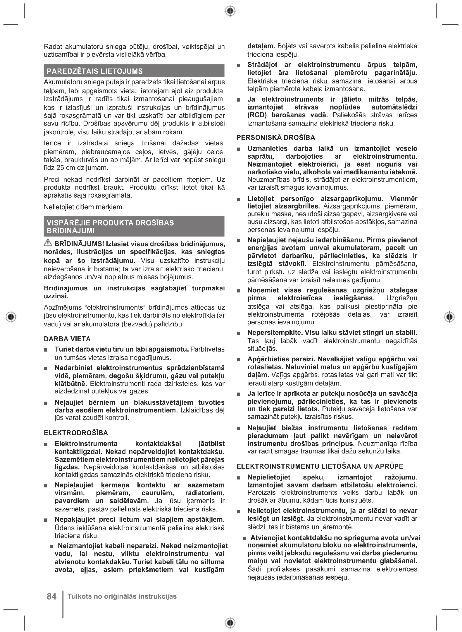 Tulkots no oriģinālās instrukcijas■ Glabājiet neizmantotus elektroinstrumentus bērniem nepieejamās vietās un neļaujiet neapmācītām personām darboties ar elektroinstrumentiem. Elektroinstrumenti ir bīstami neapmācītu personu rokās. ■ Uzturiet elektroinstrumentus un to aksesuārus kārtībā. Pārbaudiet kustīgo detaļu savienojumu pareizību, detaļu berzi un citus apstākļus, kas var ietekmēt elektroinstrumenta darbu. Ja elektroinstruments ir bojāts, pirms lietošanas veiciet tā remontu. Daudzus negadījumus izraisa slikti apkopti elektroinstrumenti. ■ Turiet griezējrīkus asus un tīrus. Pareizi apkopti griezējinstrumenti ar asām griezējšķautnēm retāk pielīp un ir vieglāk vadāmi. ■ Izmantojiet elektroierīci, piederumus, darbinstrumentus u.c. saskaņā ar šiem norādījumiem, ņemiet vērā darba apstākļus un veicamo darbu. Elektroinstrumenta izmantošana neparedzētu darbību veikšanai var radīt bīstamu situāciju. ■ Rokturiem un citām satverošām virsmām ir jābūt sausām, tīrām un bez eļļas un smērvielu plankumiem. Negaidītās situācijās slideni rokturi un slidena satvēriena virsmas padara darbarīka lietošanu nedrošu un nekontrolējamu. AR AKUMULATORU DARBINĀMU IERĪČU LIETOŠANA