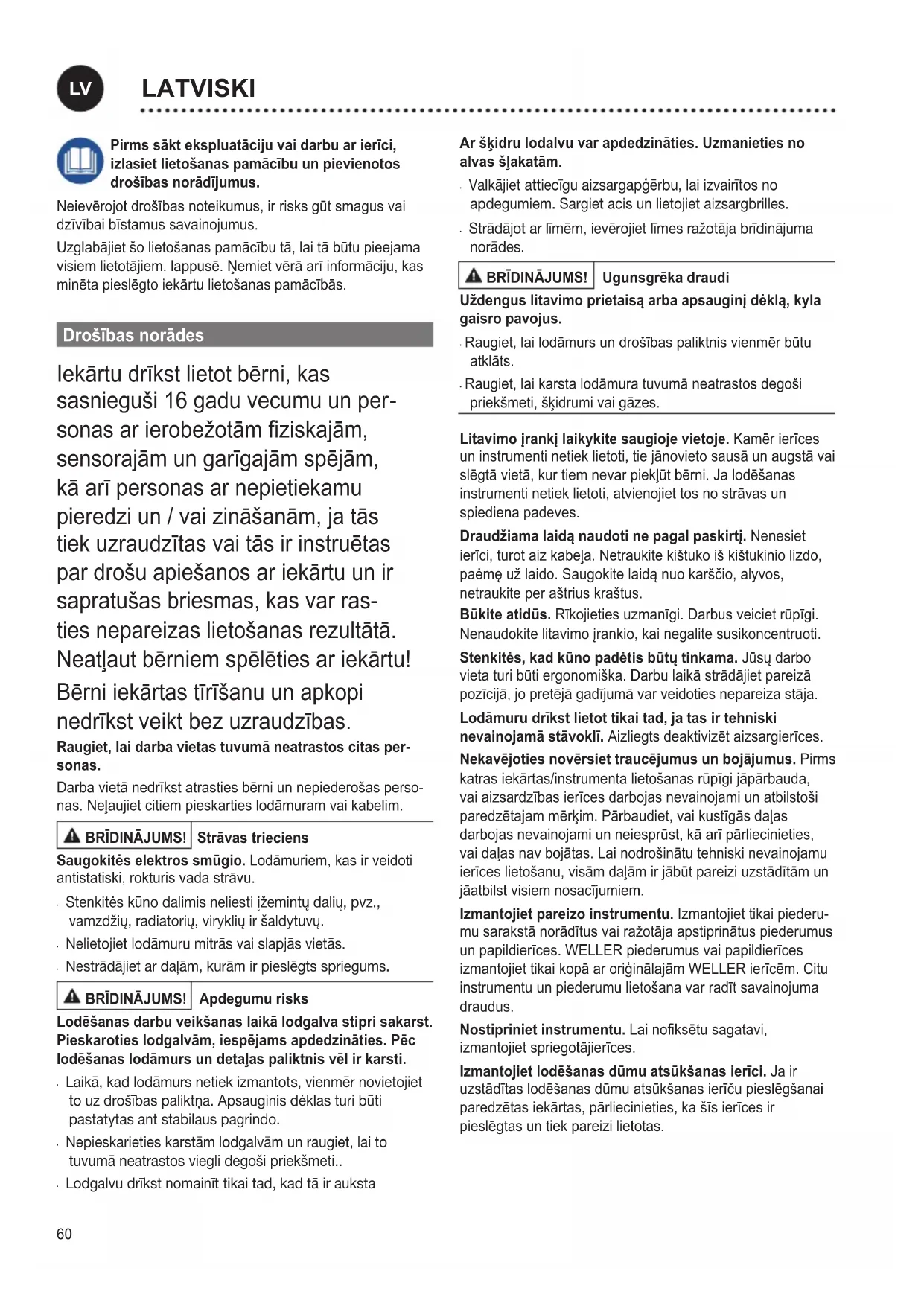 - Raugiet, lai karsta lodāmura tuvumā neatrastos degoši priekšmeti, šķidrumi vai gāzes. Litavimo įrankį laikykite saugioje vietoje. Kamēr ierīces un instrumenti netiek lietoti, tie jānovieto sausā un augstā vai slēgtā vietā, kur tiem nevar piekļūt bērni. Ja lodēšanas instrumenti netiek lietoti, atvienojiet tos no strāvas un spiediena padeves. Draudžiama laidą naudoti ne pagal paskirtį. Nenesiet ierīci, turot aiz kabeļa. Netraukite kištuko iš kištukinio lizdo, paėmę už laido. Saugokite laidą nuo karščio, alyvos, netraukite per aštrius kraštus. Būkite atidūs. Rīkojieties uzmanīgi. Darbus veiciet rūpīgi. Nenaudokite litavimo įrankio, kai negalite susikoncentruoti. Stenkitės, kad kūno padėtis būtų tinkama. Jūsų darbo vieta turi būti ergonomiška. Darbu laikā strādājiet pareizā pozīcijā, jo pretējā gadījumā var veidoties nepareiza stāja. Lodāmuru drīkst lietot tikai tad, ja tas ir tehniski nevainojamā stāvoklī. Aizliegts deaktivizēt aizsargierīces. Nekavējoties novērsiet traucējumus un bojājumus. Pirms katras iekārtas/instrumenta lietošanas rūpīgi jāpārbauda, vai aizsardzības ierīces darbojas nevainojami un atbilstoši paredzētajam mērķim. Pārbaudiet, vai kustīgās daļas darbojas nevainojami un neiesprūst, kā arī pārliecinieties, vai daļas nav bojātas. Lai nodrošinātu tehniski nevainojamu ierīces lietošanu, visām daļām ir jābūt pareizi uzstādītām un jāatbilst visiem nosacījumiem. Izmantojiet pareizo instrumentu. Izmantojiet tikai piederu- mu sarakstā norādītus vai ražotāja apstiprinātus piederumus un papildierīces. WELLER piederumus vai papildierīces izmantojiet tikai kopā ar oriģinālajām WELLER ierīcēm. Citu instrumentu un piederumu lietošana var radīt savainojuma draudus. Nostipriniet instrumentu. Lai noksētu sagatavi, izmantojiet spriegotājierīces. Izmantojiet lodēšanas dūmu atsūkšanas ierīci. Ja ir uzstādītas lodēšanas dūmu atsūkšanas ierīču pieslēgšanai paredzētas iekārtas, pārliecinieties, ka šīs ierīces ir pieslēgtas un tiek pareizi lietotas.