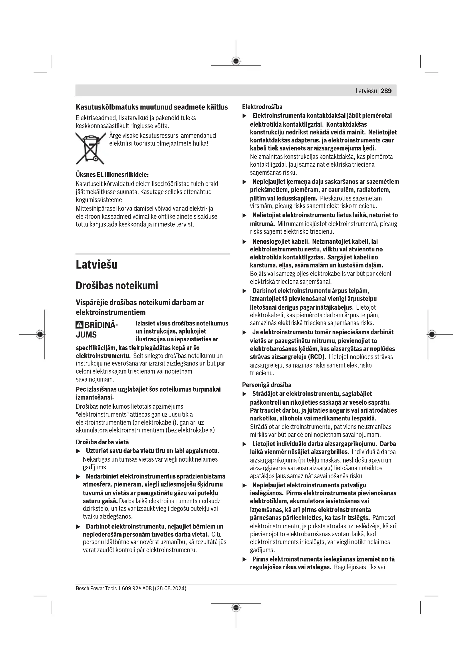 kg 14,1 14,1 Aizsardzības klase /II /II Piemērotu zāģa asmeņu izmēri Zāģa asmens diametrs mm 216 216 Pamatnes plāksnes biezums mm 1,3−1,8 1,3−1,8 Maks. zāģējuma platums mm 3,3 3,3 Centrālā atvēruma diametrs mm 30 30 A) Svars bez elektrotīkla pieslēguma kabeļa un elektrotīkla kontaktdakšas Parametri ir sniegti nominālajam spriegumam [U] 230 V. Elektroinstrumentiem, kas paredzēti zemākam spriegumam vai ir modificēti atbilstoši nacionālajiem standartiem, šie parametri var atšķirties. Pieļaujamie apstrādājamā priekšmeta izmēri (skatīt „Pieļaujamie apstrādājamā priekšmeta izmēri“, Lappuse297) Vērtības var atšķirties atkarībā no konkrētā izstrādājuma un izmantošanas vai apkārtējās vides apstākļiem. Plašāku informāciju skatiet vietnē www.bosch-professional.com/wac. Informācija par troksni Trokšņa emisijas vērtības ir noteiktas atbilstīgi standartamEN62841-3-9. 3601M190..: Elektroinstrumenta radītā trokšņa pēc raksturlīknes Aizsvērtās tipiskās vērtības ir šādas: skaņas spiediena līmenis91 dB(A); skaņas jaudas līmenis 104dB(A). Mērījumu nenoteiktība K=3dB. Lietojiet dzirdes aizsarglīdzekļus! 3601M1906.: Pēc A raksturlīknes izsvērtie elektroinstrumenta radītā trokšņa parametri tipiskā gadījumā ir šādi: skaņas spiediena līmenis 90 dB(A); skaņas jaudas līmenis 103 dB(A). Mērījumu nenoteiktība K=3dB. Lietojiet dzirdes aizsarglīdzekļus! Šajā pamācībā norādītais trokšņa līmenis ir izmērīts atbilstoši standartā noteiktajai procedūrai un var tikt izmantots elektroinstrumentu savstarpējai salīdzināšanai. To Bosch Power Tools 1 609 92A A0B | (28.08.2024)294 | Latviešu var izmantot arī trokšņa radītās papildu slodzes iepriekšējai novērtēšanai. Šeit norādītais vibrācijas līmenis ir attiecināms uz elektroinstrumenta galvenajiem pielietojuma veidiem. Ja elektroinstruments tiek lietots netipiskiem mērķiem, kopā ar netipiskiem darbinstrumentiem vai nav vajadzīgajā veidā apkalpots, tā radītā trokšņa līmenis var atšķirties no šeit norādītās vērtības. Tas var ievērojami palielināt trokšņa radīto papildu slodzi kopējam darba laika posmam. Lai precīzi izvērtētu trokšņa radīto papildu slodzi zināmam darba laika posmam, jāņem vērā arī laiks, kad elektroinstruments ir izslēgts vai arī darbojas, taču faktiski netiek izmantots paredzētā darba veikšanai. Tas var ievērojami samazināt trokšņa radīto papildu slodzi kopējam darba laika posmam. Montāža u Nepieļaujiet elektroinstrumenta patvaļīgu ieslēgšanos. Elektroinstrumenta montāžas un apkalpošanas laikā tā elektrokabeļa kontaktdakša nedrīkst būt pievienota pie elektrotīkla kontaktligzdas. Piegādes komplekts Lūdzu, ievērojiet piegādes apjoma aprakstu lietošanas instrukcijas sākumā. Pirms lietojat elektroinstrumentu pirmo reizi, pārliecinieties, ka tā piegādes komplektā ietilpst visas tālāk norādītās daļas: – Paneļzāģis ar tajā iestiprinātu zāģa asmeni – Skrūvspīles (7) – Zāģēšanas galda pagarinājums (3) ar stiprinājumu komplektu (2fiksācijas skrūves (2), 2krustrievas skrūves kā nodrošinājums pret izvilkšanu) – Sešstūra stieņatslēga/krustrievas skrūvgriezis (35) Norāde: pārbaudiet, vai elektroinstruments nav bojāts. Pirms turpināt lietot elektroinstrumentu, rūpīgi pārbaudiet, vai tā aizsargierīces un daļas ar nelieliem bojājumiem funkcionē pareizi un bez traucējumiem. Pārbaudiet, vai elektroinstrumenta kustīgās daļas netraucēti pārvietojas un nav iespīlētas un vai kāda no daļām nav bojāta. Ikvienai daļai jābūt pareizi montētai un jāatbilst paredzētajiem nosacījumiem, tādējādi nodrošinot pareizu elektroinstrumenta darbību. Bojātās aizsargierīces vai daļas nekavējoties jānomaina vai kvalificēti jāizremontē pilnvarotā remonta darbnīcā. Zāģēšanas galda pagarinājuma montāža (skatietattēluA) Zāģēšanas galdu ar pagarinātāja (3) palīdzību var pagarināt virzienā pa kreisi vai pa labi. – Līdz galam iebīdiet zāģēšanas galda pagarinātājus (3) šim nolūkam paredzētajos zāģēšanas galda urbumos. – Sagāziet elektroinstrumentu uz sāniem, lai varētu ieskrūvēt divas kopā ar to piegādātās krustrievas skrūves, kas paredzētas kā nodrošinājums pret izvilkšanu. Ieskrūvējiet krustrievas skrūves šim nolūkam paredzētajos zāģēšanas galda pagarinātāju (3) vītņurbumos un pievelciet tās ar krustrievas skrūvgriezi (35). – Atgāziet elektroinstrumentu atpakaļ un ieskrūvējiet fiksējošās skrūves (2), kas paredzētas zāģēšanas galda pagarinātāju (3) fiksēšanai, šim nolūkam izveidotajos zāģēšanas galda (22) vītņurbumos. Stacionāra vai pusstacionāra montāža u Lai varētu droši strādāt ar elektroinstrumentu, tas pirms lietošanas jānostiprina uz līdzenas un stabilas virsmas (piemēram, uz darba galda). Montāža uz darba virsmas (attēls B1) – Nostipriniet elektroinstrumentu uz darba virsmas, lietojot piemērotus skrūvju savienojumus. Stiprināšanai izmantojiet urbumus (1). Montāža uz Bosch darba galda Pateicoties kājām ar regulējamu garumu, Bosch darba galds GTA nodrošina elektroinstrumentu ar atbalstu uz jebkuras virsmas. Darba galda izvelkamie balsti ir izmantojami garāku apstrādājamo priekšmetu atbalstīšanai. u Izlasiet visus darba galdam pievienotos drošības noteikumus un lietošanas norādījumus. Drošības noteikumu un lietošanas norādījumu neievērošana var kļūt par cēloni elektriskā trieciena saņemšanai, kā arī izraisīt aizdegšanos vai radīt smagu savainojumu. u Pirms elektroinstrumenta nostiprināšanas pareizi samontējiet darba galdu. Pareiza galda uzbūve ir svarīga, lai nepieļautu tā sabrukšanu. – Pirms elektroinstrumenta nostiprināšanas uz darba galda pārvietojiet tā darbinstrumenta galvu transporta stāvoklī. Pusstacionāra uzstādīšana