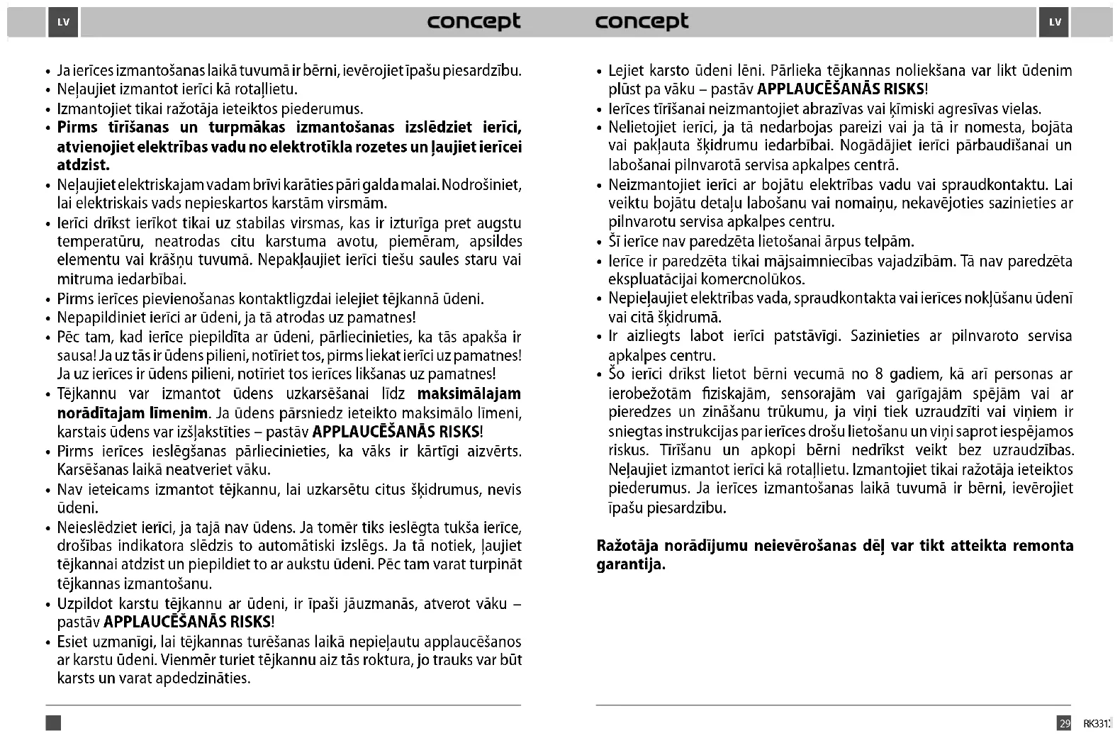- Polietilēna (PE) maisiņus nododiet otrreizējai pārstrādei paredzēto materiālu savākšanas punktā. Ierīces otrreizējā pārstrāde tās kalpošanas laika beigās Šī ierīce ir marķēta saskaņā ar Eiropas Parlamenta un Padomes Direktīvu 2012/19/ES par elektrisko un elektronisko iekārtu atkritumiem (EEIA). Simbols uz izstrādājuma vai tā iepakojuma norāda, ka šis izstrādājums nepieder sadzīves atkritumiem. Tas jānogādā elektrisko un elektronisko iekārtu otrreizējās pārstrādes savākšanas punktā. Nodrošinot šā izstrādājuma pareizu iznīcināšanu, tiks novērsta nelabvēlīga ietekme uz vidi un cilvēku veselību, ko var izraisīt nepareiza ierīces iznīcināšana. Iznīcināšana jāveic saskaņā ar noteikumiem par atkritumu apstrādi. Lai iegūtu papildu informāciju par šīs ierīces otrreizēju pārstrādi, lūdzu, sazinieties ar vietējās pašvaldības sadzīves atkritumu iznīcināšanas dienestu vai veikalu, kurā iegādājāties izstrādājumu. Šis izstrādājums atbilst visām piemērojamo ES direktīvu pamatprasībām. Izmaiņas tekstā, konstrukcijā un tehniskajās specifikācijās var tikt veiktas bez iepriekšēja brīdinājuma, un mēs paturam tiesības veikt šīs izmaiņas. Acknowledgment Thank you for purchasing a Concept product. We hope you will be satisfied with our product throughout its service life. Please study the entire Operating Manual carefully before you start using the product. Keep the manual in a safe place for future reference. Make sure other people using the product are familiar with these instructions. Technical parameters Voltage 220–240 V ~ 50/60 Hz Input 2 200 W Capacity 1.7 l