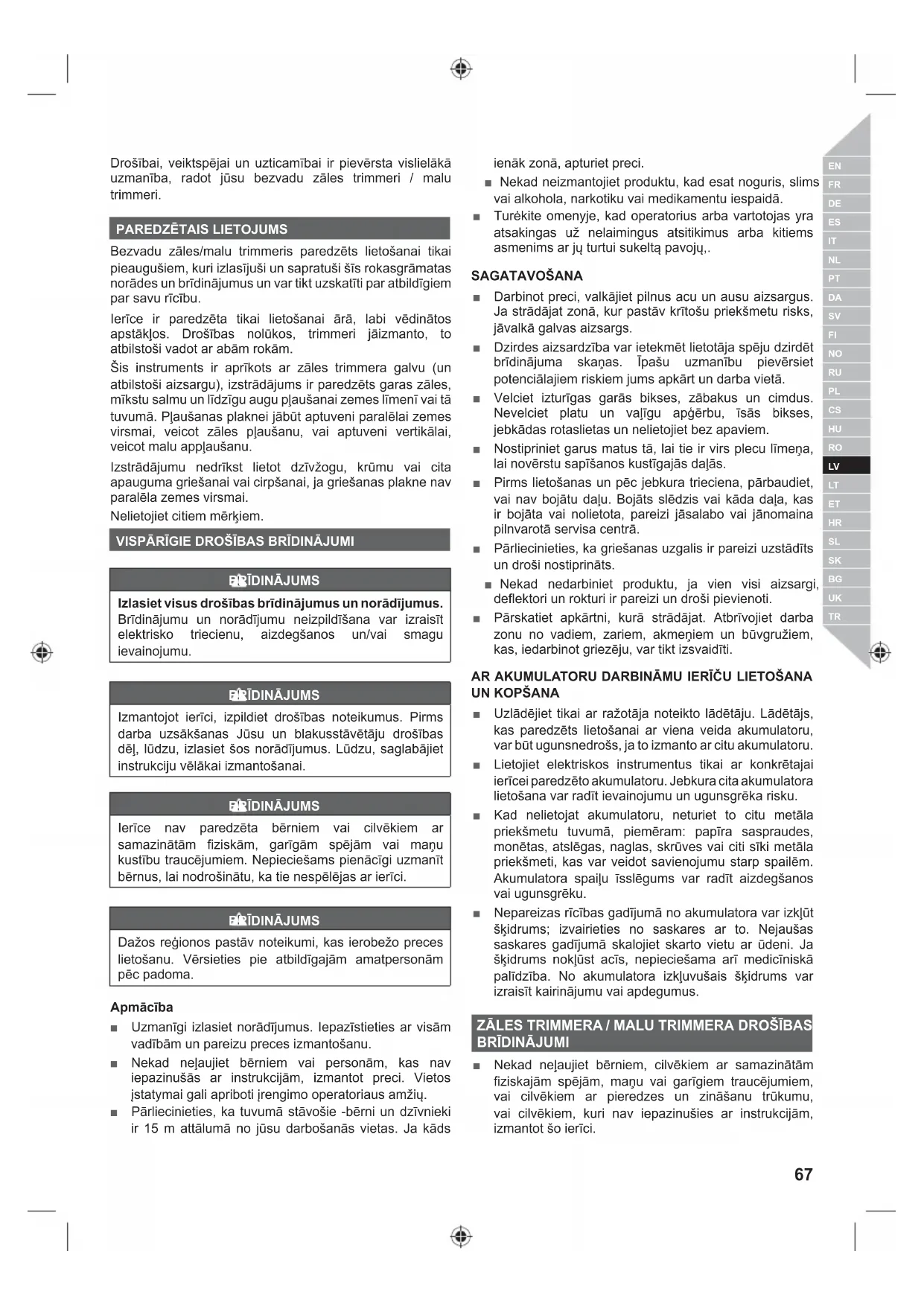 ■ Uzlādējiet tikai ar ražotāja noteikto lādētāju. Lādētājs, kas paredzēts lietošanai ar viena veida akumulatoru, var būt ugunsnedrošs, ja to izmanto ar citu akumulatoru. ■ Lietojiet elektriskos instrumentus tikai ar konkrētajai ierīcei paredzēto akumulatoru. Jebkura cita akumulatora lietošana var radīt ievainojumu un ugunsgrēka risku. ■ Kad nelietojat akumulatoru, neturiet to citu metāla priekšmetu tuvumā, piemēram: papīra saspraudes, monētas, atslēgas, naglas, skrūves vai citi sīki metāla priekšmeti, kas var veidot savienojumu starp spailēm. Akumulatora spaiļu īsslēgums var radīt aizdegšanos vai ugunsgrēku. ■ Nepareizas rīcības gadījumā no akumulatora var izkļūt šķidrums; izvairieties no saskares ar to. Nejaušas saskares gadījumā skalojiet skarto vietu ar ūdeni. Ja šķidrums nokļūst acīs, nepieciešama arī medicīniskā palīdzība. No akumulatora izkļuvušais šķidrums var izraisīt kairinājumu vai apdegumus. ZĀLES TRIMMERA / MALU TRIMMERA DROŠĪBAS