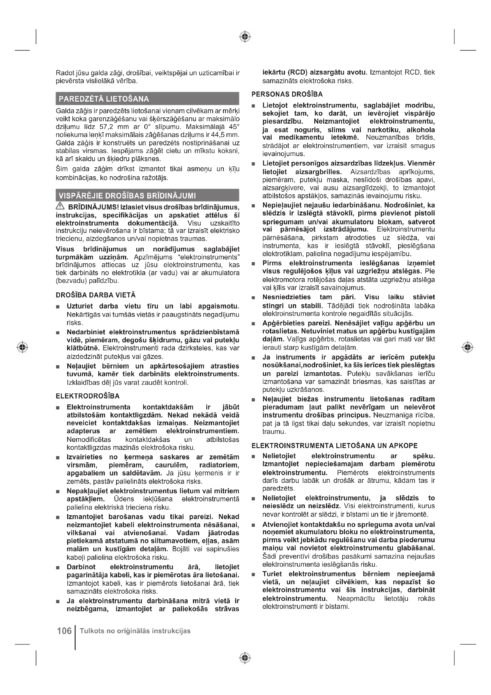 Tulkots no oriģinālās instrukcijas■ Uzturiet elektroinstrumentus un to aksesuārus kārtībā. Pārbaudiet kustīgo daļu taisnumu vai saskari, jebkādus detaļu vai uzstādīšanas kronšteinu bojājumus vai plīsumus un jebkādus citus apstākļus, kas var ietekmēt elektroinstrumenta atbilstošu darbību. Ja instruments ir bojāts, pirms lietošanas veiciet tā remontu. Daudzus negadījumus izraisa slikti uzturēti elektroinstrumenti. ■ Uzturiet griezējinstrumentus asus un tīrus. Pareizi uzturēti griezējinstrumentiem ar asu griezējasmeni ir mazāka iespēja ieķerties, tos ir vieglāk vadīt. ■ Izmantojiet elektroinstrumentu, aksesuārus, instrumentu uzgaļus utml. saskaņā ar šīm norādēm un ņemot vērā darba apstākļus un veicamā darba specifiku. Izmantojot elektroinstrumentu darbībās, kas nav paredzētas, var rasties bīstama situācija. ■ Uzturiet rokturus un satveršanas virsmas sausas un tīras, arī no eļļas un smērvielām. Slideni rokturi un satvēriena virsmas nenodrošina drošu apiešanos un instrumenta vadību neparedzētās situācijās.