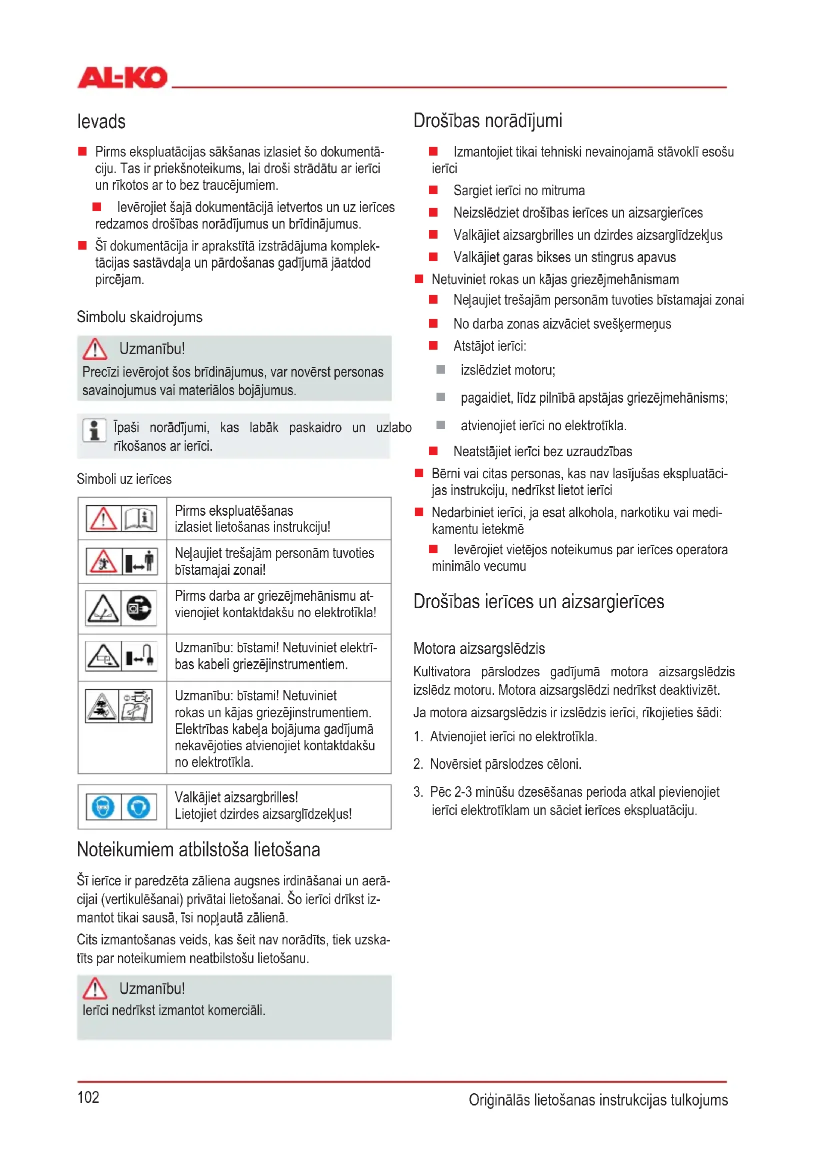 EÜ vastavusdeklaratsioon ET Sellegateatame,etseetoode,misonmeiepooltsellesversioonisturustatud,vastabEÜ-direktiividele,EÜ-ohutusstan- darditelejatootespetsiilistelenormidele.ToodeõhutajatSeerianumberG1401405TootjaAL-KOGeräteGmbH Ichenhauser Str. 14 89359 KOETZ DEUTSCHLANDEsindajaAndreas Hedrich Ichenhauser Str. 14 89359 KOETZ DEUTSCHLAND Tüüp 32.5 VE Basic Care Classic EÜ-direktiivid2006/42/EG 2014/30/EU 2000/14/EG 2011/65/EU 2014/35/EUKooskõlla viidud normidEN 60335-1:2002+A1+A11+A12+A2+A13EN 13684+A3 EN 60335-2-92Müratase mõõdetud / tagatudEN ISO 374498 / 99 dB(A) Vastavushindamine2000/14/EG Lisa VKötz,01.07.2016WolfgangHergeth,ManagingDirector102 Oriģinālās lietošanas instrukcijas tulkojums Ievads Pirmsekspluatācijassākšanasizlasietšodokumentā- ciju.Tasirpriekšnoteikums,laidrošistrādātuarierīci unrīkotosartobeztraucējumiem. Ievērojietšajādokumentācijāietvertosunuzierīces redzamosdrošībasnorādījumusunbrīdinājumus. Šīdokumentācijairaprakstītāizstrādājumakomplek- tācijassastāvdaļaunpārdošanasgadījumājāatdod pircējam. Simboluskaidrojums Uzmanību! Precīziievērojotšosbrīdinājumus,varnovērstpersonas savainojumusvaimateriālosbojājumus. Īpaši norādījumi, kas labāk paskaidro un uzlabo rīkošanosarierīci. Simboliuzierīces Pirmsekspluatēšanas izlasiet lietošanas instrukciju! Neļaujiettrešajāmpersonāmtuvoties bīstamajaizonai! Pirmsdarbaargriezējmehānismuat- vienojietkontaktdakšunoelektrotīkla! Uzmanību:bīstami!Netuvinietelektrī- baskabeligriezējinstrumentiem. Uzmanību:bīstami!Netuviniet rokasunkājasgriezējinstrumentiem. Elektrībaskabeļabojājumagadījumā nekavējotiesatvienojietkontaktdakšu noelektrotīkla. Valkājietaizsargbrilles! Lietojietdzirdesaizsarglīdzekļus! Noteikumiematbilstošalietošana Šīierīceirparedzētazālienaaugsnesirdināšanaiunaerā- cijai(vertikulēšanai)privātailietošanai.Šoierīcidrīkstiz- mantottikaisausā,īsinopļautāzālienā. Citsizmantošanasveids,kasšeitnavnorādīts,tiekuzska- tītsparnoteikumiemneatbilstošulietošanu. Uzmanību! Ierīcinedrīkstizmantotkomerciāli. Drošībasnorādījumi Izmantojiettikaitehniskinevainojamāstāvoklīesošu ierīci Sargietierīcinomitruma Neizslēdzietdrošībasierīcesunaizsargierīces Valkājietaizsargbrillesundzirdesaizsarglīdzekļus Valkājietgarasbiksesunstingrusapavus Netuviniet rokas unkājasgriezējmehānismam Neļaujiettrešajāmpersonāmtuvotiesbīstamajaizonai Nodarbazonasaizvācietsvešķermeņus Atstājotierīci: izslēdzietmotoru; pagaidiet,līdzpilnībāapstājasgriezējmehānisms; atvienojietierīcinoelektrotīkla. Neatstājietierīcibezuzraudzības Bērnivaicitaspersonas,kasnavlasījušasekspluatāci- jasinstrukciju,nedrīkstlietotierīci Nedarbinietierīci,jaesatalkohola,narkotikuvaimedi- kamentuietekmē Ievērojietvietējosnoteikumusparierīcesoperatora minimālovecumu Drošībasierīcesunaizsargierīces Motoraaizsargslēdzis Kultivatora pārslodzes gadījumā motora aizsargslēdzis izslēdzmotoru.Motoraaizsargslēdzinedrīkstdeaktivizēt. Jamotoraaizsargslēdzisirizslēdzisierīci,rīkojietiesšādi: