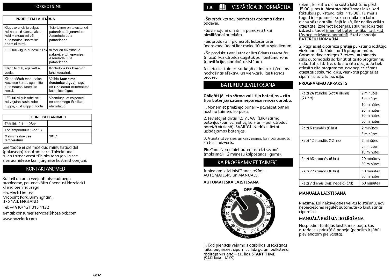 Vārsts atveras un aizveras, kad baterijas tiek pirmo reizi ievietotas, tomēr vairs nedarbojas, kad tiek veikta manuālā vai automātiskā laistīšana. Jūsu Select taimeris ir noteicis, ka bateriju uzlādes līmenis ir pārāk zems. Nomainiet ar jaunām baterijām. Gaismas diode mirgo sarkanā krāsā. Jūsu Select taimeris ir noteicis, ka bateriju uzlādes līmenis ir pārāk zems. Nomainiet ar jaunām baterijām. Vārsts darbojas, tomēr ūdens netek. Pārliecinieties, ka ir atvērts ūdens krāns. Vārsts darbojas manuālā režīmā, bet automātiskā laistīšana nedarbojas. Atlasiet sākuma laiku, kā aprakstīts sadaļā „Automātiskā laistīšana”. Kad es nospiežu tūlītējās laistīšanas pogu, gaismas diode mirgo zaļā krāsā, tomēr vārsts nedarbojas. Pārliecinieties, ka priekšējais panelis pilnībā pieguļ korpusam. TEHNISKIE DATI Darba spiediens 0,1–10 bāri Darba temperatūra 1–55 °C Maksimālā ūdens temperatūra 30°C Šis produkts nav paredzēts lietošanai temperatūrā zem nulles. Ziemas mēnešos izlaidiet taimerī atlikušo ūdeni un uzglabājiet to telpās līdz nākamajai laistīšanas sezonai. KONTAKTINFORMĀCIJA Ja rodas jebkādas problēmas ar ūdens regulatoru, sazinieties ar Hozelock klientu apkalpošanas dienestu. Hozelock Limited Midpoint Park, Birmingham,