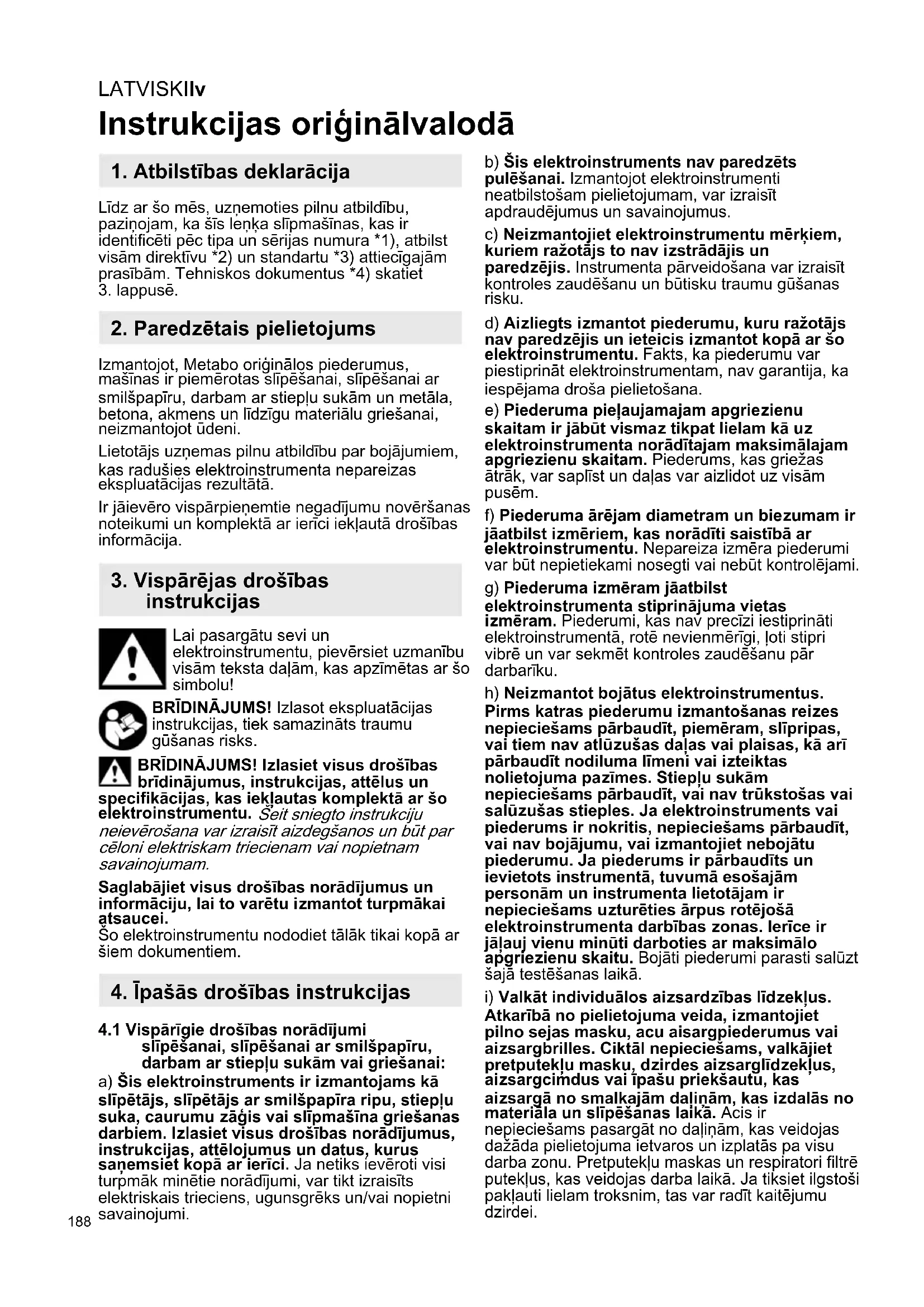 Izmantojot, Metabo oriģinālos piederumus, mašīnas ir piemērotas slīpēšanai, slīpēšanai ar smilšpapīru, darbam ar stiepļu sukām un metāla, betona, akmens un līdzīgu materiālu griešanai, neizmantojot ūdeni. Lietotājs uzņemas pilnu atbildību par bojājumiem, kas radušies elektroinstrumenta nepareizas ekspluatācijas rezultātā. Ir jāievēro vispārpieņemtie negadījumu novēršanas noteikumi un komplektā ar ierīci iekļautā drošības informācija. Lai pasargātu sevi un elektroinstrumentu, pievērsiet uzmanību visām teksta daļām, kas apzīmētas ar šo simbolu! BRĪDINĀJUMS! Izlasot ekspluatācijas instrukcijas, tiek samazināts traumu gūšanas risks. BRĪDINĀJUMS! Izlasiet visus drošības brīdinājumus, instrukcijas, attēlus un specifikācijas, kas iekļautas komplektā ar šo elektroinstrumentu. Šeit sniegto instrukciju neievērošana var izraisīt aizdegšanos un būt par cēloni elektriskam triecienam vai nopietnam savainojumam. Saglabājiet visus drošības norādījumus un informāciju, lai to varētu izmantot turpmākai atsaucei. Šo elektroinstrumentu nododiet tālāk tikai kopā ar šiem dokumentiem.