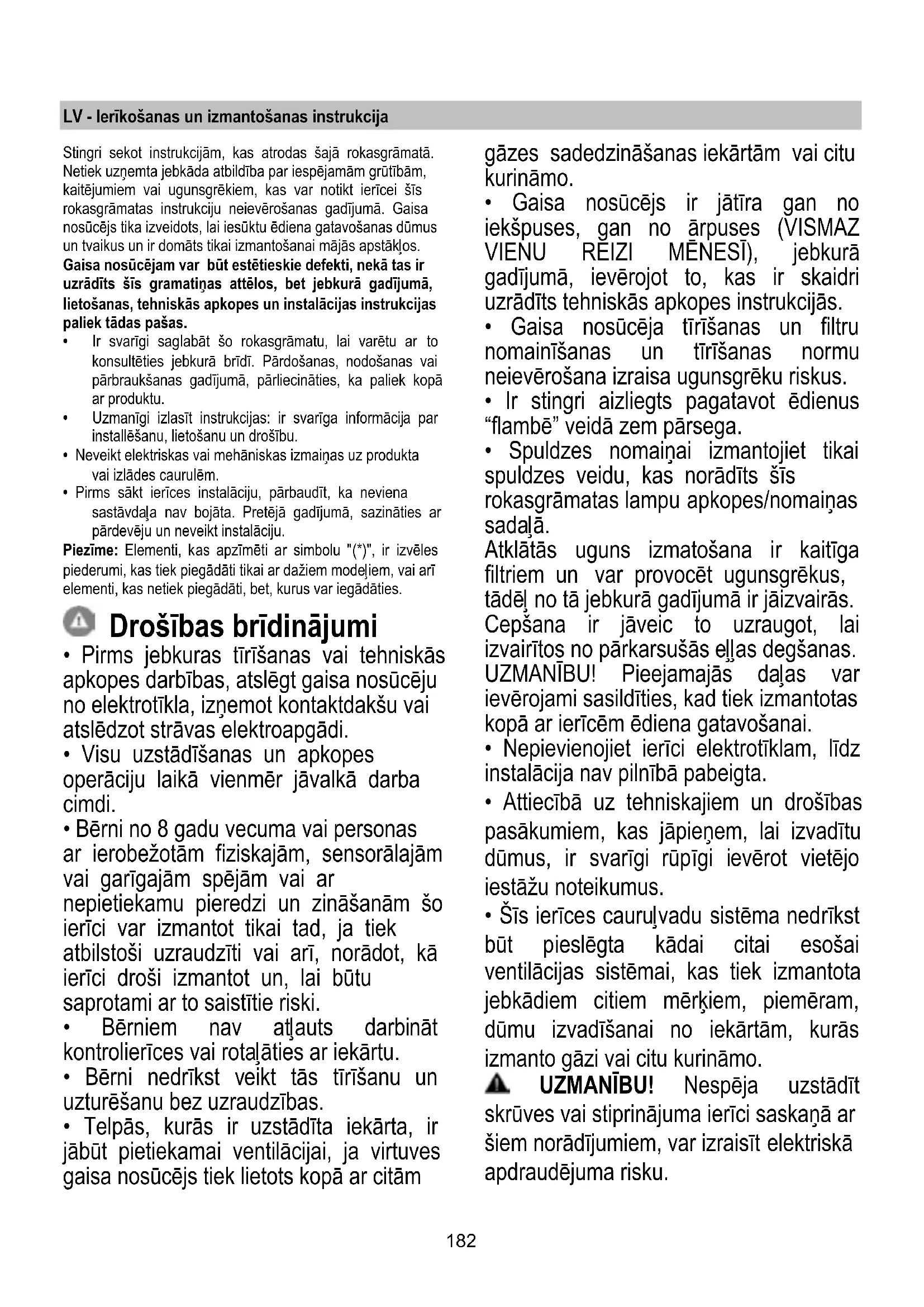 - Spuldzes nomaiņai izmantojiet tikai spuldzes veidu, kas norādīts šīs rokasgrāmatas lampu apkopes/nomaiņas sadaļā. Atklātās uguns izmatošana ir kaitīga filtriem un var provocēt ugunsgrēkus, tādēļ no tā jebkurā gadījumā ir jāizvairās. Cepšana ir jāveic to uzraugot, lai izvairītos no pārkarsušās eļļas degšanas. UZMANĪBU! Pieejamajās daļas var ievērojami sasildīties, kad tiek izmantotas kopā ar ierīcēm ēdiena gatavošanai.