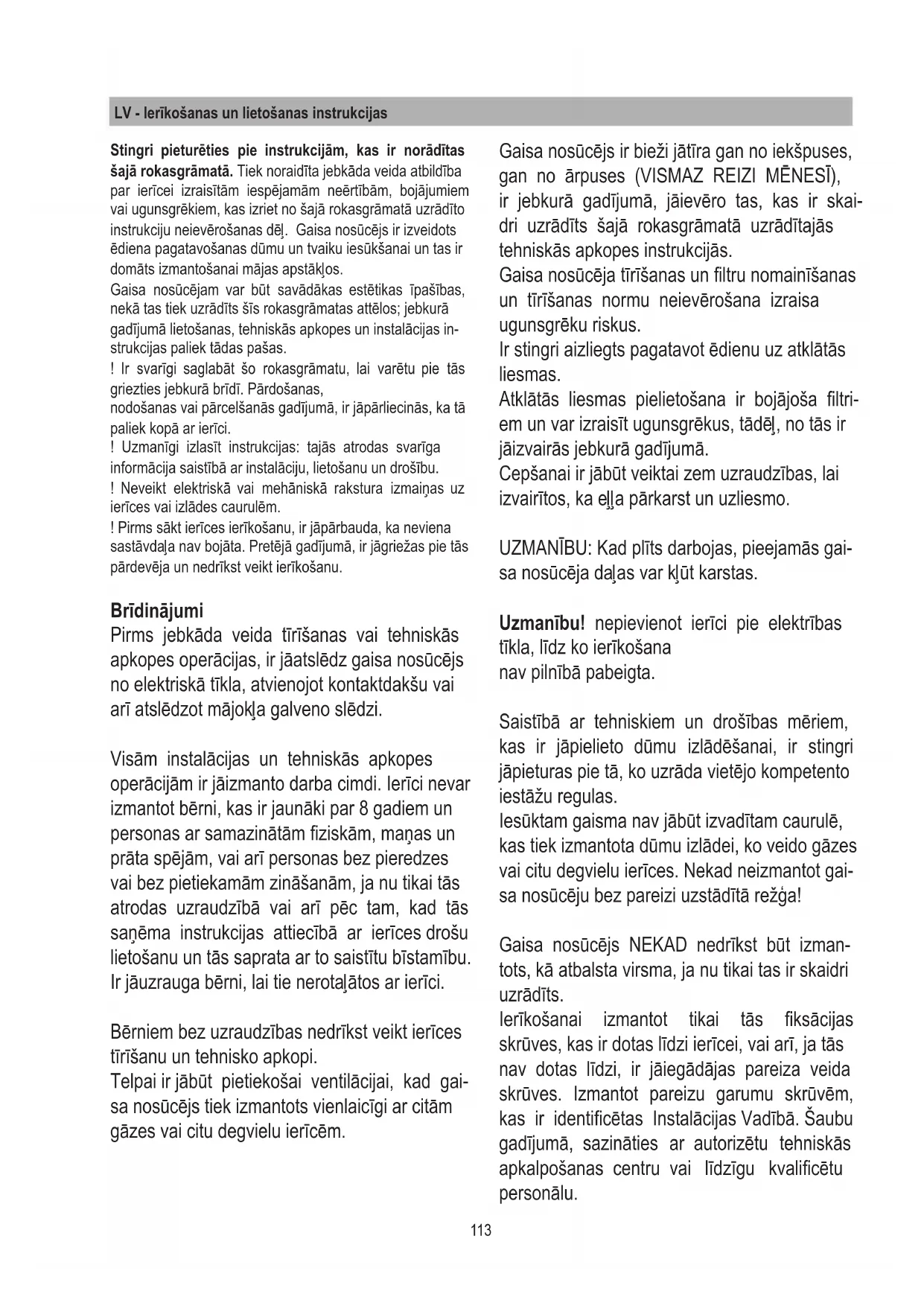 Riebalų ltras Sulaiko kepant ar verdant į orą patenkančių riebalų daleles. Filtrą valykite kartą per mėnesį (arba kai nurodo ltrų prisoti- nimo indikacijos sistema, jei ji yra turimame modelyje). Valy- kite švelniais valikliais rankomis arba plaukite indaplovėje žemoje temperatūroje trumpu ciklu. Plaunant indaplovėje, metalinis riebalų ltras gali prarasti spalvą, bet jo ltravimo savybės išlieka nepakitusios. Aktyviosios anglies ltras (tik ltravimo modelyje) Naikina nemalonius kvapus, atsirandančius gaminant maistą. Anglies ltras prisisotina naudojant ilgą laiką, priklausomai nuo viryklės rūšies ir riebalų ltro valymo reguliarumo. Bet kuriuo atveju kasetę reikia keisti ne dažniau kaip kas keturis mėnesius. Išėmus riebalų ltrus, galima įdėti anglies ltrus (8 pav.).113 LV - Ierīkošanas un lietošanas instrukcijas Stingri pieturēties pie instrukcijām, kas ir norādītas šajā rokasgrāmatā. Tiek noraidīta jebkāda veida atbildība par ierīcei izraisītām iespējamām neērtībām, bojājumiem vai ugunsgrēkiem, kas izriet no šajā rokasgrāmatā uzrādīto instrukciju neievērošanas dēļ. Gaisa nosūcējs ir izveidots ēdiena pagatavošanas dūmu un tvaiku iesūkšanai un tas ir domāts izmantošanai mājas apstākļos. Gaisa nosūcējam var būt savādākas estētikas īpašības, nekā tas tiek uzrādīts šīs rokasgrāmatas attēlos; jebkurā gadījumā lietošanas, tehniskās apkopes un instalācijas in- strukcijas paliek tādas pašas. ! Ir svarīgi saglabāt šo rokasgrāmatu, lai varētu pie tās griezties jebkurā brīdī. Pārdošanas, nodošanas vai pārcelšanās gadījumā, ir jāpārliecinās, ka tā paliek kopā ar ierīci. ! Uzmanīgi izlasīt instrukcijas: tajās atrodas svarīga informācija saistībā ar instalāciju, lietošanu un drošību. ! Neveikt elektriskā vai mehāniskā rakstura izmaiņas uz ierīces vai izlādes caurulēm. ! Pirms sākt ierīces ierīkošanu, ir jāpārbauda, ka neviena sastāvdaļa nav bojāta. Pretējā gadījumā, ir jāgriežas pie tās pārdevēja un nedrīkst veikt ierīkošanu. Brīdinājumi Pirms jebkāda veida tīrīšanas vai tehniskās apkopes operācijas, ir jāatslēdz gaisa nosūcējs no elektriskā tīkla, atvienojot kontaktdakšu vai arī atslēdzot mājokļa galveno slēdzi. Visām instalācijas un tehniskās apkopes operācijām ir jāizmanto darba cimdi. Ierīci nevar izmantot bērni, kas ir jaunāki par 8 gadiem un personas ar samazinātām ziskām, maņas un prāta spējām, vai arī personas bez pieredzes vai bez pietiekamām zināšanām, ja nu tikai tās atrodas uzraudzībā vai arī pēc tam, kad tās saņēma instrukcijas attiecībā ar ierīces drošu lietošanu un tās saprata ar to saistītu bīstamību. Ir jāuzrauga bērni, lai tie nerotaļātos ar ierīci. Bērniem bez uzraudzības nedrīkst veikt ierīces tīrīšanu un tehnisko apkopi. Telpai ir jābūt pietiekošai ventilācijai, kad gai- sa nosūcējs tiek izmantots vienlaicīgi ar citām gāzes vai citu degvielu ierīcēm. Gaisa nosūcējs ir bieži jātīra gan no iekšpuses, gan no ārpuses (VISMAZ REIZI MĒNESĪ), ir jebkurā gadījumā, jāievēro tas, kas ir skai- dri uzrādīts šajā rokasgrāmatā uzrādītajās tehniskās apkopes instrukcijās. Gaisa nosūcēja tīrīšanas un ltru nomainīšanas un tīrīšanas normu neievērošana izraisa ugunsgrēku riskus. Ir stingri aizliegts pagatavot ēdienu uz atklātās liesmas. Atklātās liesmas pielietošana ir bojājoša ltri- em un var izraisīt ugunsgrēkus, tādēļ, no tās ir jāizvairās jebkurā gadījumā. Cepšanai ir jābūt veiktai zem uzraudzības, lai izvairītos, ka eļļa pārkarst un uzliesmo. UZMANĪBU: Kad plīts darbojas, pieejamās gai- sa nosūcēja daļas var kļūt karstas. Uzmanību! nepievienot ierīci pie elektrības tīkla, līdz ko ierīkošana nav pilnībā pabeigta. Saistībā ar tehniskiem un drošības mēriem, kas ir jāpielieto dūmu izlādēšanai, ir stingri jāpieturas pie tā, ko uzrāda vietējo kompetento iestāžu regulas. Iesūktam gaisma nav jābūt izvadītam caurulē, kas tiek izmantota dūmu izlādei, ko veido gāzes vai citu degvielu ierīces. Nekad neizmantot gai- sa nosūcēju bez pareizi uzstādītā režģa! Gaisa nosūcējs NEKAD nedrīkst būt izman- tots, kā atbalsta virsma, ja nu tikai tas ir skaidri uzrādīts. Ierīkošanai izmantot tikai tās ksācijas skrūves, kas ir dotas līdzi ierīcei, vai arī, ja tās nav dotas līdzi, ir jāiegādājas pareiza veida skrūves. Izmantot pareizu garumu skrūvēm, kas ir identicētas Instalācijas Vadībā. Šaubu gadījumā, sazināties ar autorizētu tehniskās apkalpošanas centru vai līdzīgu kvalicētu personālu.114 UZMANĪBU! Skrūvju un piestiprināšanas ierīču neierīkošana saskaņā ar šīm instrukcijām, var izraisīt elektriskās dabas riskus. Tiek noraidīta jebkāda veida atbildība par ierīcei izraisītām iespējamām neērtībām, kas izriet no šajā rokasgrāmatā uzrādīto instrukciju neievērošanas dēļ. Vēloties pastāvīgi uzlabot mūsu produktus, mēs paturam tiesības veikt visa veida izmaiņas to tehniskām, funkcionālām vai estētiskām īpašībām, kas izriet no to evolūcijas. Versi- jas ar ārējo dzinēju gadījumā, normālai gaisa nosūcēja darbībai, ir nepieciešams izmantot tāda paša ražotāja iesūkšanas grupu (ārējais dzinējs). Šī ierīce ir atzīmēta saskaņā ar Eiropas Direktīvu 2012/19/EC, Waste Electrical and Electronic Equipment (WEEE). Pārliecinoties, ka šis pro- dukts tiek apsaimniekots pareizā veidā, lietotājs palīdz novērst potenciālas negatīvas sekas apkārtējai videi un veselībai. Simbols uz produkta vai tā pavadības dokumentācijā norāda, ka šim produktam nav jābūt iznīcinātam, kā mājokļa atkritumam, bet gan tas ir jānogādā uz attiecīgo elektrisko un elektronisko ierīču savākšanas centru. Ir jāatbrīvojas no tā, sekojot vietējām normām saistībā ar 