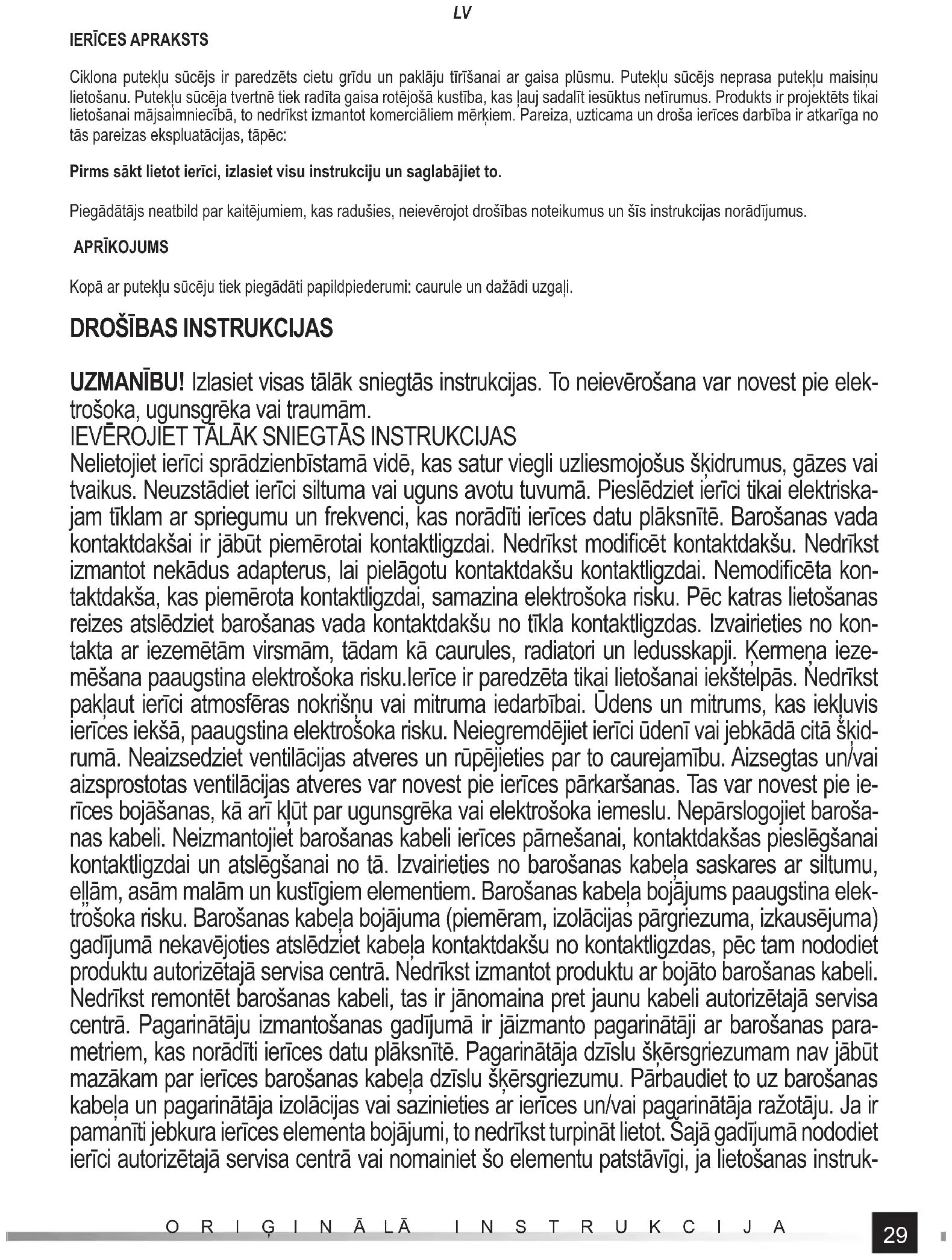 Ciklona putekļu sūcējs ir paredzēts cietu grīdu un paklāju tīrīšanai ar gaisa plūsmu. Putekļu sūcējs neprasa putekļu maisiņu lietošanu. Putekļu sūcēja tvertnē tiek radīta gaisa rotējošā kustība, kas ļauj sadalīt iesūktus netīrumus. Produkts ir projektēts tikai lietošanai mājsaimniecībā, to nedrīkst izmantot komerciāliem mērķiem. Pareiza, uzticama un droša ierīces darbība ir atkarīga no tās pareizas ekspluatācijas, tāpēc: Pirms sākt lietot ierīci, izlasiet visu instrukciju un saglabājiet to. Piegād ātājs neatbild par kaitējumiem, kas radušies, neievērojot drošības noteikumus un šīs instrukcijas norādījumus. APRĪKOJUMS Kopā ar putekļu sūcēju tiek piegādāti papildpiederumi: caurule un dažādi uzgaļi.