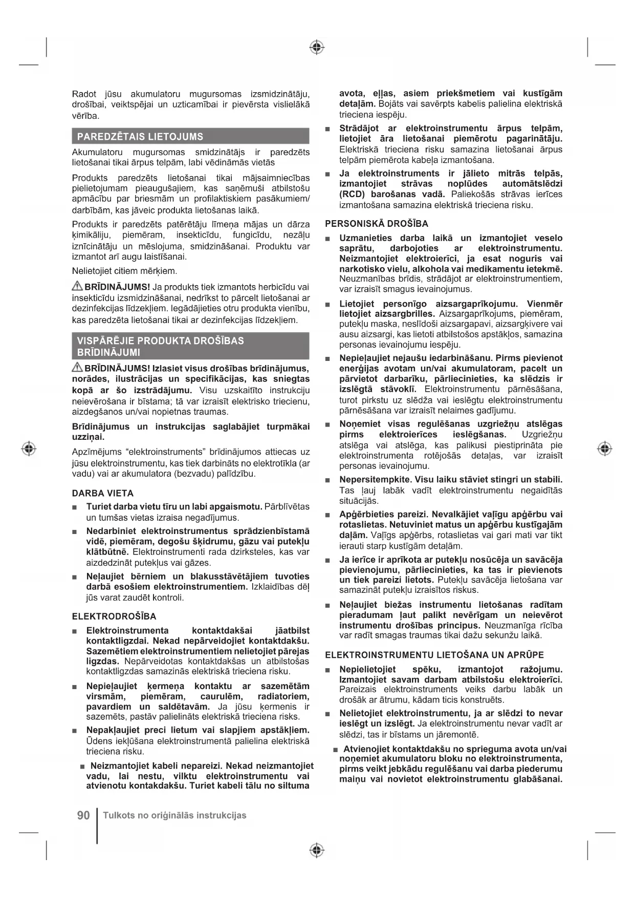 ■ Uzmanīgi izlasiet norādījumus. Iepazīstieties ar visām vadībām un pareizu preces izmantošanu. ■ Nekad neļaujiet bērniem, cilvēkiem ar samazinātām fiziskajām spējām, maņu vai garīgiem traucējumiem, vai cilvēkiem ar pieredzes un zināšanu trūkumu, vai cilvēkiem, kuri nav iepazinušies ar instrukcijām, izmantot šo ierīci. ■ Produktu ir jāizmanto tikai ar mugursomas izsmidzinātājiem paredzētiem augu aizsardzības līdzekļiem, kurus apstiprinājušas vietējās/valsts uzraugošās institūcijas. ■ Ievērojiet ķimikāliju ražotāja norādes attiecībā uz aizsarglīdzekļiem. ■ Lai samazinātu negadījumu un produkta bojājumu risku nekad nelietojiet ar: ● uzliesmojošiem šķidrumiem ● viskoziem vai lipīgiem šķidrumiem ● sārmainām vai korozīvām ķimikālijām ● šķidrumiem, kas karstāki par 50°C ■ Nesmidziniet vietās, kur ir dzirksteles, liesmas vai citi aizdegšanās avoti. ■ Nekad nelietojiet ierīci, ja ir bojāti aizsargi vai pārsegi vai arī drošības ierīces neatrodas vietā. Nekad neizmantojiet nepilnīgu vai pārveidotu produktu. Bojāta, nepilnīga vai pārveidota produkta izmantošana var izraisīt bīstamu situāciju. ■ Nesmidziniet cilvēku vai dzīvnieku virzienā. Izvairieties no smidzināšanas vējainās dienās. Smidzināšanas materiāli nejauši var tikt uzpūsti uz augiem vai priekšmetiem, kurus nevajag apsmidzināt. Vienmēr smidziniet vēja virzienā. ■ Negadījumu vai saplīšanas gadījumā nekavējoties izslēdziet un noņemiet akumulatora bloku. Neizmantojiet izstrādājumu līdz tas nav pilnībā pārbaudīts pilnvarotā servisa centrā. ■ Ja no sprauslas nenotiek izsmidzināšana vai strūklas lielums ir samazinājies, iespējams, ka aizsprostojusies šļūtenes vai roktura sistēma. Noskalojiet un notīriet visas šļūtenes un roktura sistēmas daļas (izsmidzinātāja pistoli, filtru tvertnē, pistoles pagarinājumu, šļūteni) ar tīru ūdeni. Nekad neizpūtiet sprauslas vai citas detaļas ar muti. ■ Izvairieties no saskarsmes ar augu aizsardzības līdzekļiem. Nekavējoties nomainiet apģērbu, ja tas piesūcies ar augu apstrādes ķimikālijām. Smidzināšanas materiālus netuviniet acīm. Ja smidzināšanas materiāli nonāk saskarē ar acīm, nekavējoties mazgājiet tās ar tīru ūdeni. Ja kairinājums saglabājas, nekavējoties meklējiet medicīnisko palīdzību.92 Tulkots no oriģinālās instrukcijas ■ Smidzināšanas materiāli var būt kaitīgi, ja tiek ieelpoti, norīti vai nonāk saskarē ar ādu vai acīm. Valkājiet atbilstošu aizsargājošu apģērbu un aprīkojumu, kad: ● uzpildot smidzinātāja tvertni ar izsmidzināšanas materiāliem ● veicot izsmidzināšanu ● veicot regulēšanu ● nolejot un tīrot izsmidzinātāja tvertni ● mainot izsmidzināmos materiālus ● veicot produkta apkopi ■ Pirms produkta izmantošanas vienmēr pārbaudiet un novērsiet noplūdes. ■ Pirms katras lietošanas rūpīgi pārbaudiet produkta iekšpusi, ārpusi un komponentus. Pārbaudiet, vai šļūtenēm nav plaisu un nolietojuma, noplūžu, sprauslu nosprostojumu, vai daļas nav pazudušas vai bojātas. Ja izstrādājums ir bojāts, pirms lietošanas nepieciešams remonts. Daudzus negadījumus izraisa izstrādājumi, kuriem nav pienācīgi veikta apkope. ■ Ņemiet vērā jebkādus apdraudējumus, ko rada ķimikāliju šķīdumi. Vienmēr ievērojiet ķimikāliju ražotāja norādes par lietošanu, rīkošanos un glabāšanu. ■ Neizmantojiet produktu ar jebkādiem materiāliem, kuru bīstamība nav zināma. ■ Pirms produkta lietošanas pārliecinieties, vai smidzināšanas stienis ir stingri pievienots sprauslas stieņa rokturim. Ja nepieciešams, izmantojiet knaibles, lai smidzināšanas stieni nostiprinātu pie smidzināšanas stieņa roktura. ■ Pareizi uzskrūvējiet un pievelciet smidzinātāja tvertnes vāku pēc šķidruma ieliešanas tvertnē. ■ Pēc ilgstošas uzglabāšanas vai pēc ziemas, veiciet produkta skalošanu, smidzinot tīru ūdeni. Pārbaudiet vai nav kādas noplūdes vai plaisas. ■ Vienmēr ievērojiet ķīmiskās vielas ražotāja lietošanas, tīrīšanas un glabāšanas norādes, kas ir nodrukātas uz produkta marķējuma. Ķīmiskas vielas jāglabā bērniem nepieejamā vietā. ■ Lai samazinātu uzliesmošanas vai eksplozijas risku, neizmantojiet produktu ar uzliesmojošiem šķīdumiem, piemēram, benzīnu vai citas ķimikālijas ar uzliesmošanas temperatūru, kas mazāka par 55°C. ■ Izmantojiet produktu tikai apkārtējās vides temperatūras diapazonā no 0°C un 40°C. ■ Glabājiet produktu vietā, kurā apkārtējās vides temperatūra ir starp 0°C un 40°C. ■ Ilgstoša preces lietošana var radīt ievainojumus vai pasliktināt jau esošos. Izmantojot jebkuru produktu ilgāku laika posmu, nodrošiniet, ka tiek ņemti regulāri pārtraukumi.