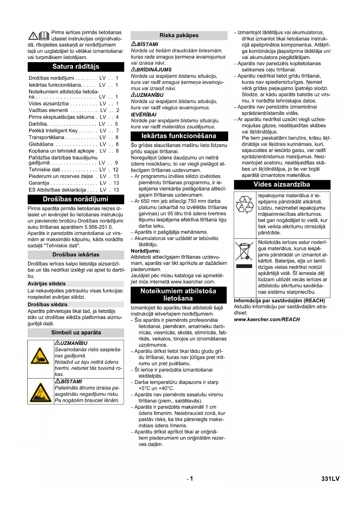 Chairman of the Board of Management Director Regulatory Affairs & Certification 330 ET- 1 Pirms ierīces pirmās lietošanas izlasiet instrukcijas oriģinālvalo- dā, rīkojieties saskaņā ar norādījumiem tajā un uzglabājiet to vēlākai izmantošanai vai turpmākiem lietotājiem. Pirms aparāta pirmās lietošanas reizes iz- lasiet un ievērojiet šo lietošanas instrukciju un pievienoto brošūru Drošības norādījumi suku tīrīšanas aparātiem 5.956-251.0. Aparāts ir paredzēts izmantošanai uz virs- mām ar maksimālo kāpumu, kāds norādīts sadaļā "Tehniskie dati". Drošības ierīces kalpo lietotāja aizsardzī- bai un tās nedrīkst izslēgt vai apiet to darbī- bu. Lai nekavējoties pārtrauktu visas funkcijas: nospiediet avārijas slēdzi. Aparāts pārvietojas tikai tad, ja lietotājs stāv uz drošības slēdža platformas aizmu- gurējā daļā. BĪSTAMI Norāda uz tiešām draudošām briesmām, kuras rada smagus ķermeņa ievainojumus vai izraisa nāvi.