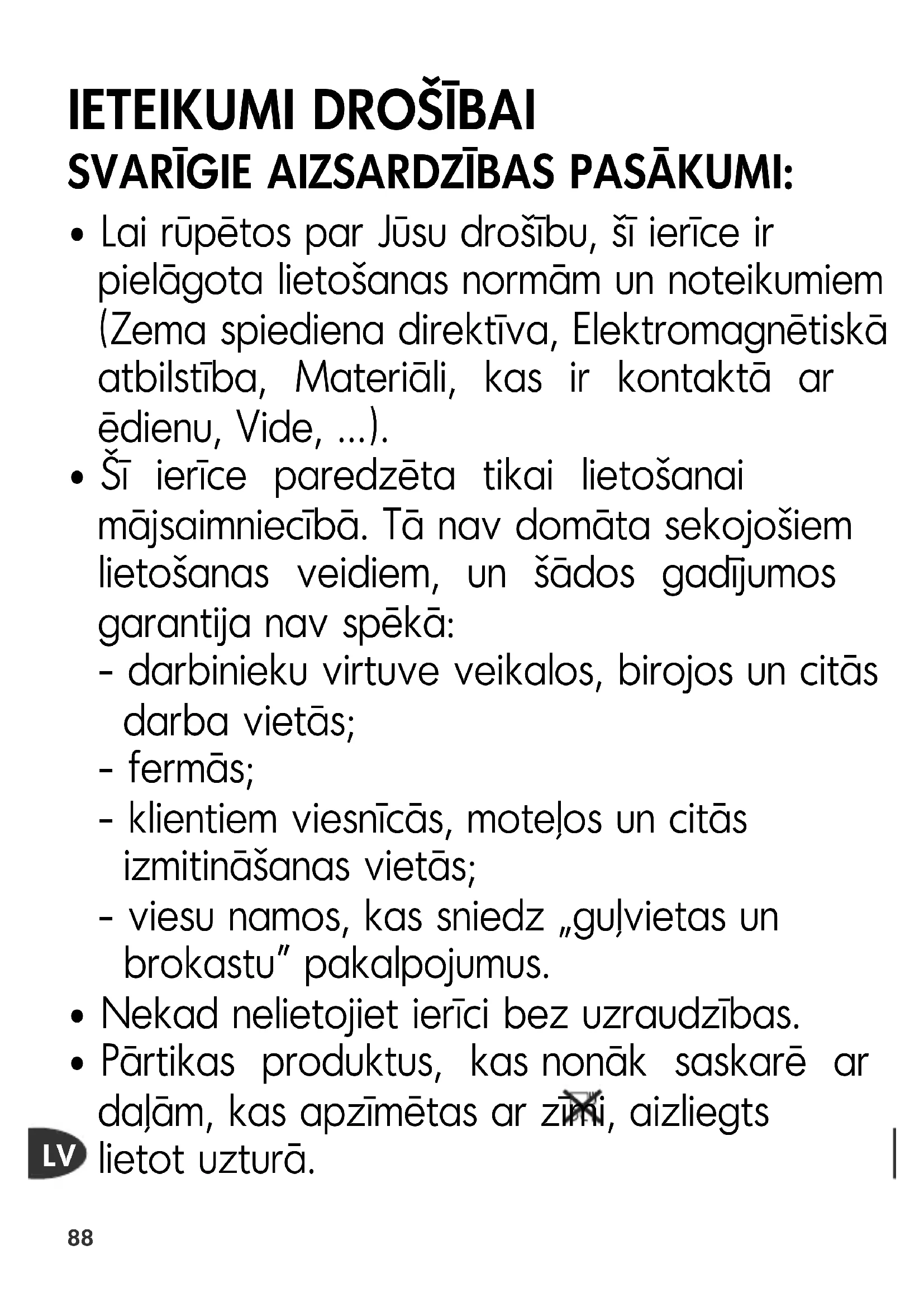 - Šī ierīce paredzēta tikai lietošanai mājsaimniecībā. Tā nav domāta sekojošiem lietošanas veidiem, un šādos gadījumos garantija nav spēkā: - darbinieku virtuve veikalos, birojos un citās darba vietās; - fermās; - klientiem viesnīcās, moteļos un citās izmitināšanas vietās; - viesu namos, kas sniedz „guļvietas un brokastu” pakalpojumus.