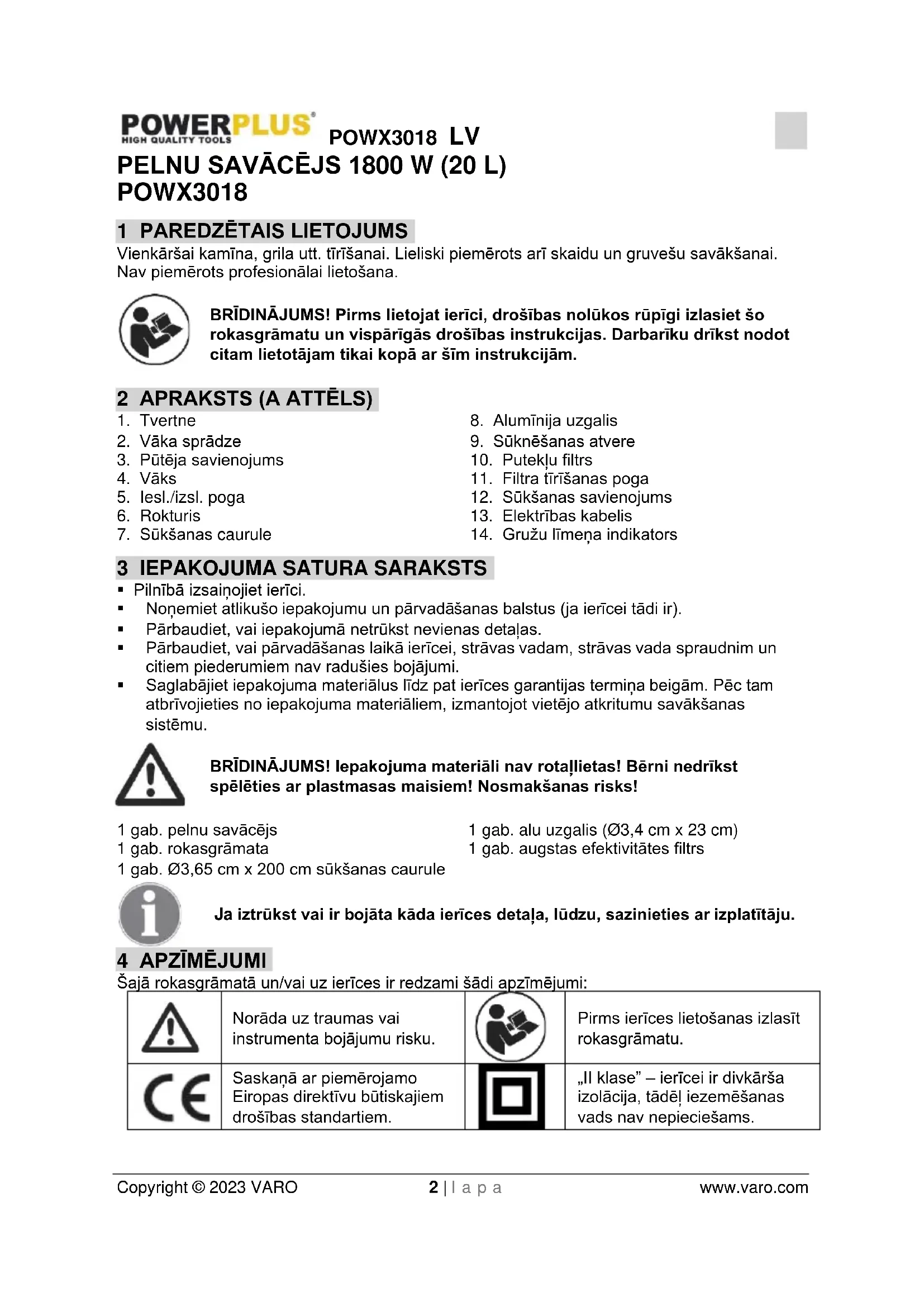 -Pārbaudiet elektrības ligzdu. -Ieslēdziet ierīci. Zudusi sūkšanas jauda -Ierīce aizsērējusi. -Putekļu filtram nepieciešama tīrīšana. -Gružu tvertne nav pareizi novietota. -Filtrs ir aizsegts. -Noņemiet šķērsli. -Iztīriet putekļu filtru. -No jauna pievienojiet ierīces gružu tvertni. -Iztīriet putekļu filtru. 11 TEHNISKIE DATI Modeļa Nr. POWX3018 Nominālais spriegums 220-240 V Nominālā frekvence 50 Hz Nominālā jauda 1800 W Aizsardzības klase klase II Maks. pelnu temperatūra 40 °C Tvertnes tilpums 20 l Kabeļa garums 5 m Sūkšanas jauda 18 kPa Sprauslas diametrs 34 mm Caurules diametrs 36,5 mm Filtra tips Augstas efektivitātes filtrs Uzgaļa materiāls Alumīnijs Elektromotora tips Ar ogles sukām Tvertnes diametrs 295 mm Tvertnes augstums 285 mm Caurules garums 2 mPOWX3018 LV Copyright © 2023 VARO 7 | l a p a www.varo.com 12 GARANTIJA