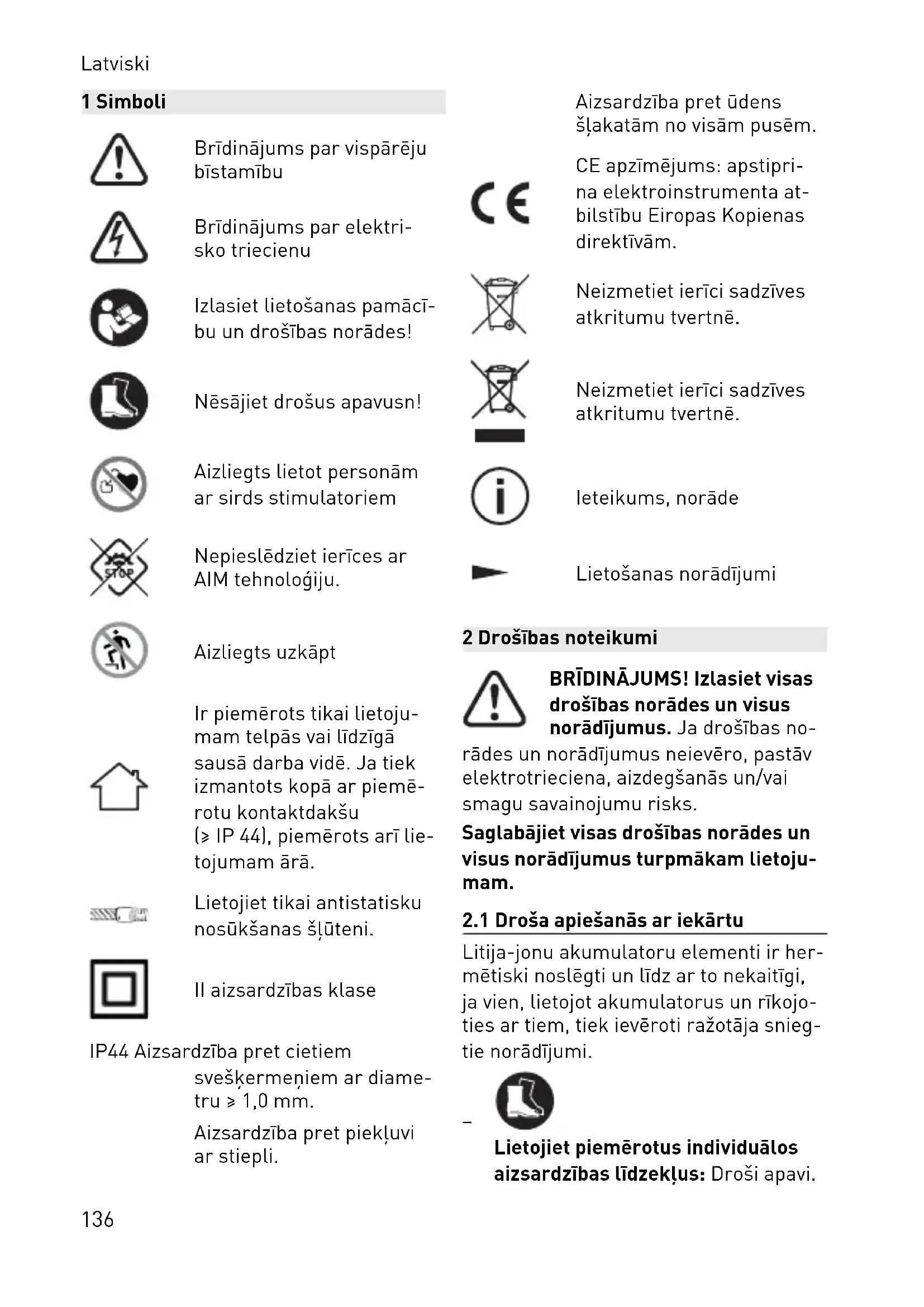 – No bojātajiem akumulatoriem var izplūst šķidrums. Šajā gadījumā pārtrauciet ierīces lietošanu un uti lizējiet bojāto akumulatoru pareizā veidā. – Akumulatoru aizdegšanās gasījju mā dzēsiet uguni ar ūdeni. Ja ie spējams, pilnīgi aplejiet ierīci ar ūdeni Zvaniet ugunsdzēsējiem un informējiet viņus par to, ka deg liti ja-jonu akumulatori. – No bojāta vai nepareizi lietota aku mulatora var izplūst tvaiki. Šie tvai ki var kairināt elpceļus. Nodrošiniet svaigu gaisu un sūdzību gadījumā griezieties pie ārsta. – Nepareizi lietojot akumulatoru, no tā var izplūst šķidrais elektrolīts. Nepieļaujiet tā nonākšanu uz ādas. Ja šķidrais elektrolīts ir nejauši sa skāries ar ādu, noskalojiet to ar ūdeni. Ja šķidrums ir iekļuvis acīs, griezieties pie ārsta. No akumula tora izplūdušais šķidrums var kairi nāt vai apdedzināt ādu.