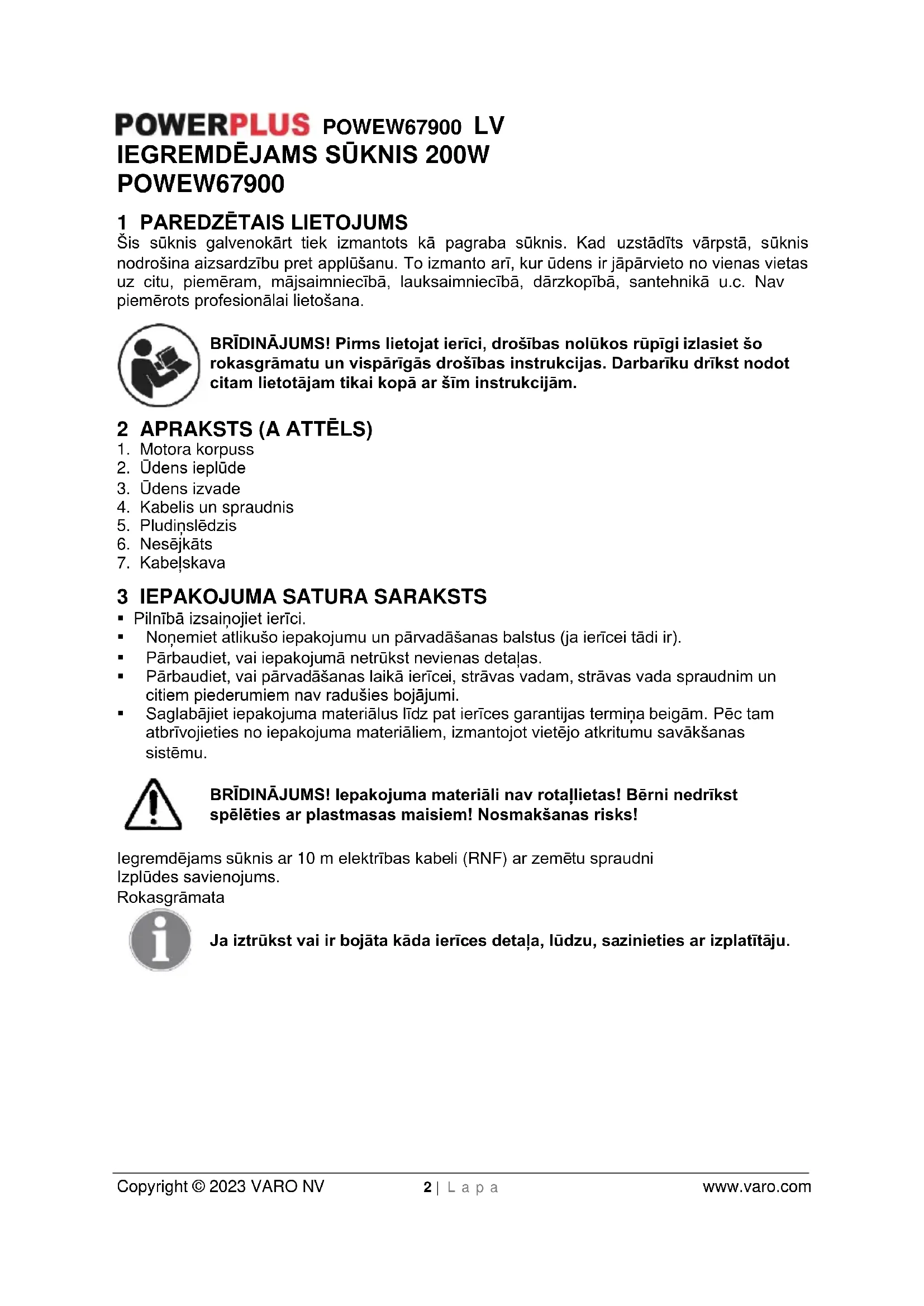 EN61000-3-3 : 2013 Tehniskās dokumentācijas glabātājs : Philippe Vankerkhove, VARO – Vic. Van Rompuy N.V. Apakšā parakstījusies persona rīkojas uzņēmuma izpilddirektora vārdā, Ludo Mertens Regulējošo jautājumu birojs –– atbilstības nodaļas vadītājs 06/12/2022, Lier - BelgiumPOWEW67900 LT Copyright © 2023 VARO NV P u s l a p i s | 1 www.varo.com 1 SKIRTA NAUDOTI ........................................................................... 2
