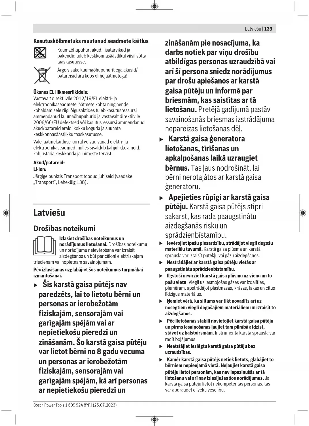 Akumulators Bosch pārdod akumulatora karstā gaisa pūtēju arī bez akumulatora. Tas, vai Jūsu karstā gaisa pūtēja piegādes komplektācijā ir iekļauts akumulators, ir norādīts uz iepakojuma. Akumulatora uzlāde u Izmantojiet tikai tehniskajos datos norādītās uzlādes ierīces. Vienīgi šīs uzlādes ierīces ir piemērotas jūsu karstā gaisa pūtējā izmantotā litija-jonu akumulatora uzlādei. Norāde: atbilstoši starptautiskajiem kravu pārvadāšanas noteikumiem litija jonu akumulatori tiek piegādāti daļēji uzlādētā stāvoklī. Lai nodrošinātu pilnu akumulatora jaudu, pirms pirmās lietošanas reizes pilnībā uzlādējiet akumulatoru. Akumulatora ielikšana u Ievietojot akumulatoru, nelietojiet pārāk lielu spēku. Akumulators ir konstruēts tā, ka gaisa pūtējā to var ievietot tikai pareizā stāvoklī. Ievietojiet uzlādēto akumulatoru akumulatora stiprinājumā, līdz tas tiek nofiksēts. Elektroniskās elementu aizsardzības ["Electronic Cell Protection (ECP)"] funkcija aizsargā litija jonu akumulatoru pret dziļo izlādi. Ja akumulators ir izlādējies, aizsardzības ierīce izslēdz karstā gaisa pūtēju. Akumulatora izņemšana Lai izņemtu akumulatoru, nospiediet akumulatora atbrīvošanas taustiņu un izvelciet akumulatoru. Nedarbojieties ar spēku. Akumulatora uzlādes pakāpes indikators Piezīme: ne visiem akumulatoru tipiem ir uzlādes līmeņa indikators. Akumulatora uzlādes pakāpes indikatora zaļās LED diodes parāda akumulatora uzlādes pakāpi. Vadoties no drošības apsvērumiem, uzlādes pakāpe ir nolasāma, tikai kamēr karstā gaisa pūtējs nedarbojas. Lai nolasītu akumulatora uzlādes pakāpi, nospiediet akumulatora uzlādes pakāpes nolasīšanas taustiņu vai . Tas iespējams arī tad, ja akumulators ir izņemts no elektroinstrumenta. Ja pēc akumulatora uzlādes pakāpes nolasīšanas taustiņa nospiešanas neiedegas neviena no uzlādes pakāpes indikatora LED diodēm, tas nozīmē, ka akumulators ir bojāts un to nepieciešams nomainīt. Akumulatora tips GBA 18V... LED Uzlādes līmenis Pastāvīgi deg 3zaļas LED diodes 60–100% Pastāvīgi deg 2zaļas LED diodes 30–60% Pastāvīgi deg 1zaļa LED diode 5–30% Mirgo 1zaļa LED diode 0–5% Akumulatora tips ProCORE18V... LED Uzlādes līmenis Pastāvīgi deg 5zaļas LED diodes 80–100% Pastāvīgi deg 4zaļas LED diodes 60–80% Pastāvīgi deg 3zaļas LED diodes 40–60% Pastāvīgi deg 2zaļas LED diodes 20–40% Pastāvīgi deg 1zaļa LED diode 5–20% Mirgo 1zaļa LED diode 0–5% Bosch Power Tools 1 609 92A 8YR | (25.07.2023)142 | Latviešu Pareiza apiešanās ar akumulatoru Sargājiet akumulatoru no mitruma un ūdens. Uzglabājiet akumulatoru pie temperatūras no −20°C līdz 50°C. Neatstājiet akumulatoru karstumā, piemēram, vasaras laikā neatstājiet to automašīnā. Laiku pa laikam iztīriet akumulatora ventilācijas atvērumus ar mīkstu, tīru un sausu otu. Ja manāmi samazinās instrumenta darbības laiks starp akumulatora uzlādēm, tas norāda, ka akumulators ir nolietojies un to nepieciešams nomainīt. Ievērojiet norādījumus par atbrīvošanos no nolietotajiem izstrādājumiem. Lietošana Ekspluatācijas sākšana u Pirms piederumu maiņas vai karstā gaisa pūtēja novietošanas glabāšanā izņemiet akumulatoru. Šis drošības pasākums ļaus novērst elektroinstrumenta patvaļīgu ieslēgšanos. Dūmu veidošanās, pirmo reizi iedarbinot instrumentu Rūpnīcā metāla virsmas ir pārklātas ar korozijas aizsargkārtu. Šī aizsargkārta iztvaiko pirmajā palaišanas reizē. Ražošanas procesā karstā gaisa pūtējs var sprauslas(1) krāsu izmaiņas. Tie nav bojājumi un neietekmē karstā gaisa pūtēja darbību. Jaudas līmeņa izvēle Izmantojot jaudas līmeņa regulatoru(3), jūs varat iestatīt vienu no diviem jaudas līmeņiem. Pēc pārslēgšanās īsi iemirgojas LED darba gaisma: – Līmenis 300°C Izmantojot šo līmeni, jūs varat, piemēram, atkausēt ūdensvada caurules vai apstrādāt termosarūkošās šļūtenes. Pēc ieslēgšanas attiecīgā temperatūra tiek sasniegta ātrāk nekā 6 s. Izmantojot pilnībā uzlādētu 8Ah akumulatoru, darbības laiks ir 21 min. – Līmenis 500°C Izmantojot šo līmeni, jūs varat, piemēram, noņemt lakas. Uzsilšanas ilgums ir atkarīgs no mērījumiem telpas temperatūrā. Ieslēgšana Lai ieslēgtu, vispirms nospiediet atbloķēšanas slēdzi(4) un papildus arī ieslēdzēju/izslēdzēju(5). Pēc ieslēgšanās jūs varat atlaist atbloķēšanas slēdzi(4), un turpmāk darbības laikā atbloķēšanas slēdzis(4) vairs nav jānospiež. Ieslēdzot karstā gaisa pūtēju, ieslēdzas LED darba lampa(6), kas izgaismo visu darba zonu. Izslēgšana Lai izslēgtu elektroinstrumentu, atlaidiet ieslēdzēju/ izslēdzēju(5). Novietojiet karstā gaisa pūtēju uz akumulatora(8), lai ļautu tam atdzist. Aizsardzība pret atkārtotu ieslēgšanos Ja darbības laikā akumulators(8) tiek atvienots no karstā gaisa pūtēja un pēc tam atkal ievietots, nospiežot ieslēdzēju/ izslēdzēju(5), aizsardzība pret atkārtotu ieslēgšanos tiek aktivizēta. LED darba lampa(6) sāk mirgot, un karstā gaisa pūtējs neieslēdzas. Atlaidiet ieslēdzēju/izslēdzēju(5) un pēc tam ieslēdziet karstā gaisa pūtēju, rīkojoties kā parasti. Akumulatora pārkaršana aizsardzība Ja darbības laikā akumulators(8) kļūst pārāk karsts, jauda tiek samazināta. LED darba lampa(6) lēnām mirgo, kamēr ir nospiests ieslēdzējs/izslēdzējs(5). Ja turpināt lietot karstā gaisa pūtēju un akumulatora temperatūra turpina augt, karstā gaisa pūtējs pats izslēdzas. Samazināta jauda Karstā gaisa pūtējs ir saderīgs ar visiem pieejamajiem Bosch Professional 18 V akumulatoriem. Lietojot karstā gaisa pūtēju ar akumulatoriem, kas ir mazāki par ieteiktajām 4Ah, līmenī 500°C karstā gaisa pūtējs nespēj sasniegt pilnu jaudu (temperatūra netiek sasniegta un gaisa plūsmas apjoms tiek samazi
