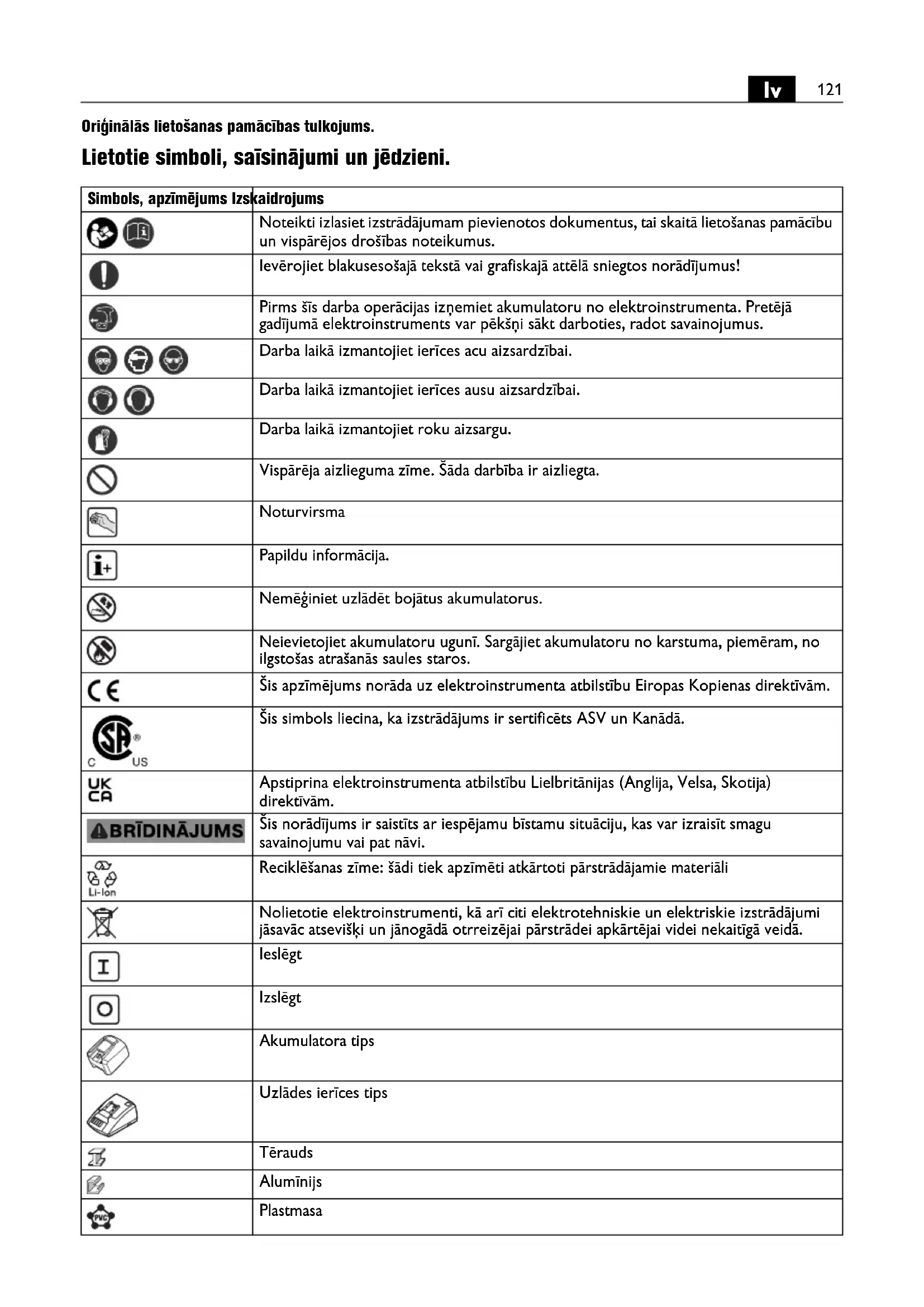 Oriģinālās lietošanas pamācības tulkojums. Lietotie simboli, saīsinājumi un jēdzieni. Simbols, apzīmējums Izskaidrojums Noteikti izlasiet izstrādājumam pievienotos dokumentus, tai skaitā lietošanas pamācību un vispārējos drošības noteikumus. Ievērojiet blakusesošajā tekstā vai grafiskajā attēlā sniegtos norādījumus! Pirms šīs darba operācijas izņemiet akumulatoru no elektroinstrumenta. Pretējā gadījumā elektroinstruments var pēkšņi sākt darboties, radot savainojumus. Darba laikā izmantojiet ierīces acu aizsardzībai. Darba laikā izmantojiet ierīces ausu aizsardzībai. Darba laikā izmantojiet roku aizsargu. Vispārēja aizlieguma zīme. Šāda darbība ir aizliegta. Noturvirsma Papildu informācija. Nemēģiniet uzlādēt bojātus akumulatorus. Neievietojiet akumulatoru ugunī . Sargājiet akumulatoru no karstuma, piemēram, no ilgstošas atrašanās saules staros. Šis apzīmējums norāda uz elektroinstrumenta atbilstību Eiropas Kopienas direktīvām. Šis simbols liecina, ka izstrādājums ir sertificēts ASV un Kanādā. Apstiprina elektroinstrumenta atbilstību Lielbritānijas (Anglija, Velsa, Skotija) direktīvām. Šis norādījums ir saistīts ar iespējamu bīstamu situāciju, kas var izraisīt smagu savainojumu vai pat nāvi. Reciklēšanas zīme: šādi tiek apzīmēti atkārtoti pārstrādājamie materiāli Nolietotie elektroinstrumenti, kā arī citi elektrotehniskie un elektriskie izstrādājumi jāsavāc atsevišķi un jānogād ā otrreizējai pārstrādei apkārtējai videi nekaitīgā veidā. Ieslēgt Izslēgt Akumulatora tips Uzlādes ierīces tips Tērauds Alumīnijs Plastmasa122