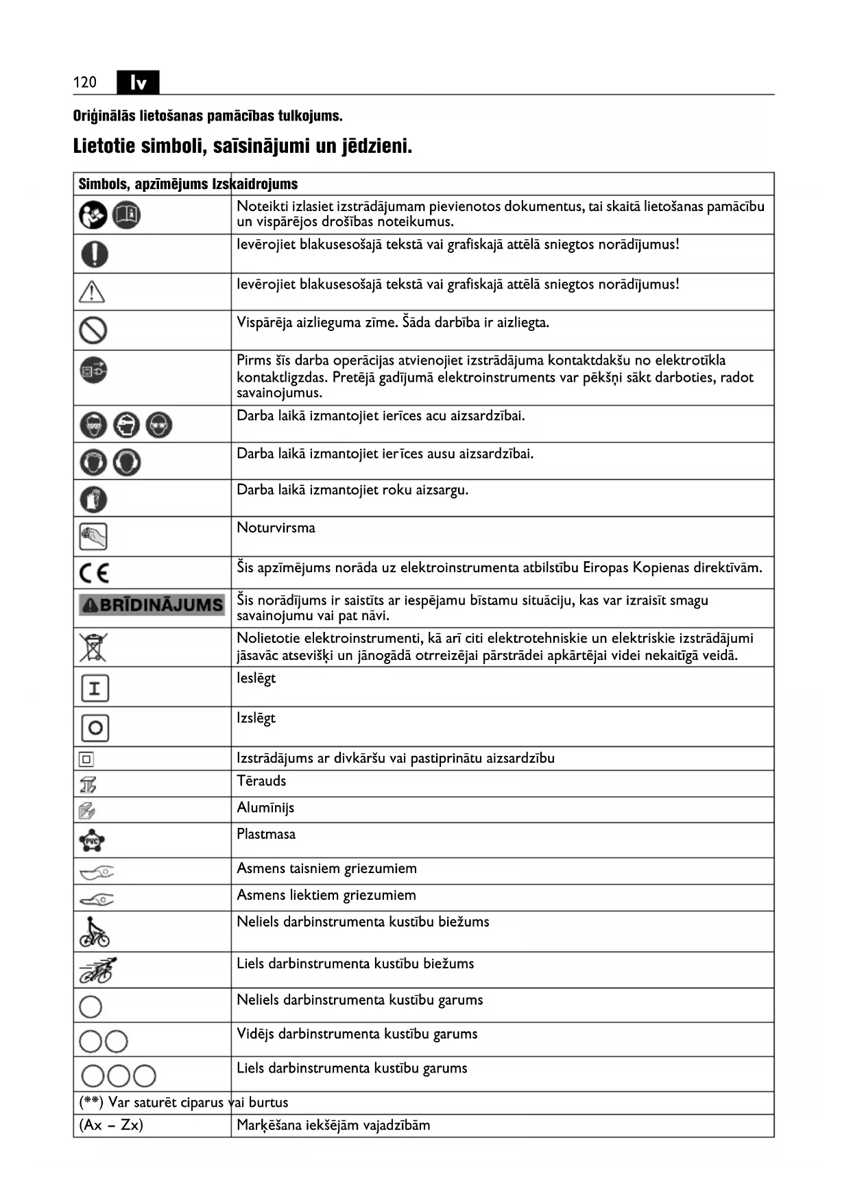 Oriģinālās lietošanas pamācības tulkojums. Lietotie simboli, saīsinājumi un jēdzieni. Simbols, apzīmējums Izskaidrojums Noteikti izlasiet izstrādājumam pievienotos dokumentus, tai skaitā lietošanas pamācību un vispārējos drošības noteikumus. Ievērojiet blakusesošajā tekstā vai grafiskajā attēlā sniegtos norādījumus! Ievērojiet blakusesošajā tekstā vai grafiskajā attēlā sniegtos norādījumus! Vispārēja aizlieguma zīme. Šāda darbība ir aizliegta. Pirms šīs darba operācijas atvienojiet izstrādājuma kontaktdakšu no elektrotīkla kontaktligzdas. Pretējā gadījumā elektroinstruments var pēkšņi sākt darboties, radot savainojumus. Darba laikā izmantojiet ierīces acu aizsardzībai. Darba laikā izmantojiet ier īces ausu aizsardzībai. Darba laikā izmantojiet roku aizsargu. Noturvirsma Šis apzīmējums norāda uz elektroinstrumenta atbilstību Eiropas Kopienas direktīvām. Šis norādījums ir saistīts ar iespējamu bīstamu situāciju, kas var izraisīt smagu savainojumu vai pat nāvi. Nolietotie elektroinstrumenti, kā arī citi elektrotehniskie un elektriskie izstrādājumi jāsavāc atsevišķi un jānogādā otrreizējai pārstrādei apkārtējai videi nekaitīgā veidā. Ieslēgt Izslēgt Izstrādājums ar divkāršu vai pastiprinātu aizsardzību Tērauds Alumīnijs Plastmasa Asmens taisniem griezumiem Asmens liektiem griezumiem Neliels darbinstrumenta kustību biežums Liels darbinstrumenta kustību biežums Neliels darbinstrumenta kustību garums Vidējs darbinstrumenta kustību garums Liels darbinstrumenta kustību garums (**) Var saturēt ciparus vai burtus (Ax – Zx) Marķēšana iekšējām vajadzībām121