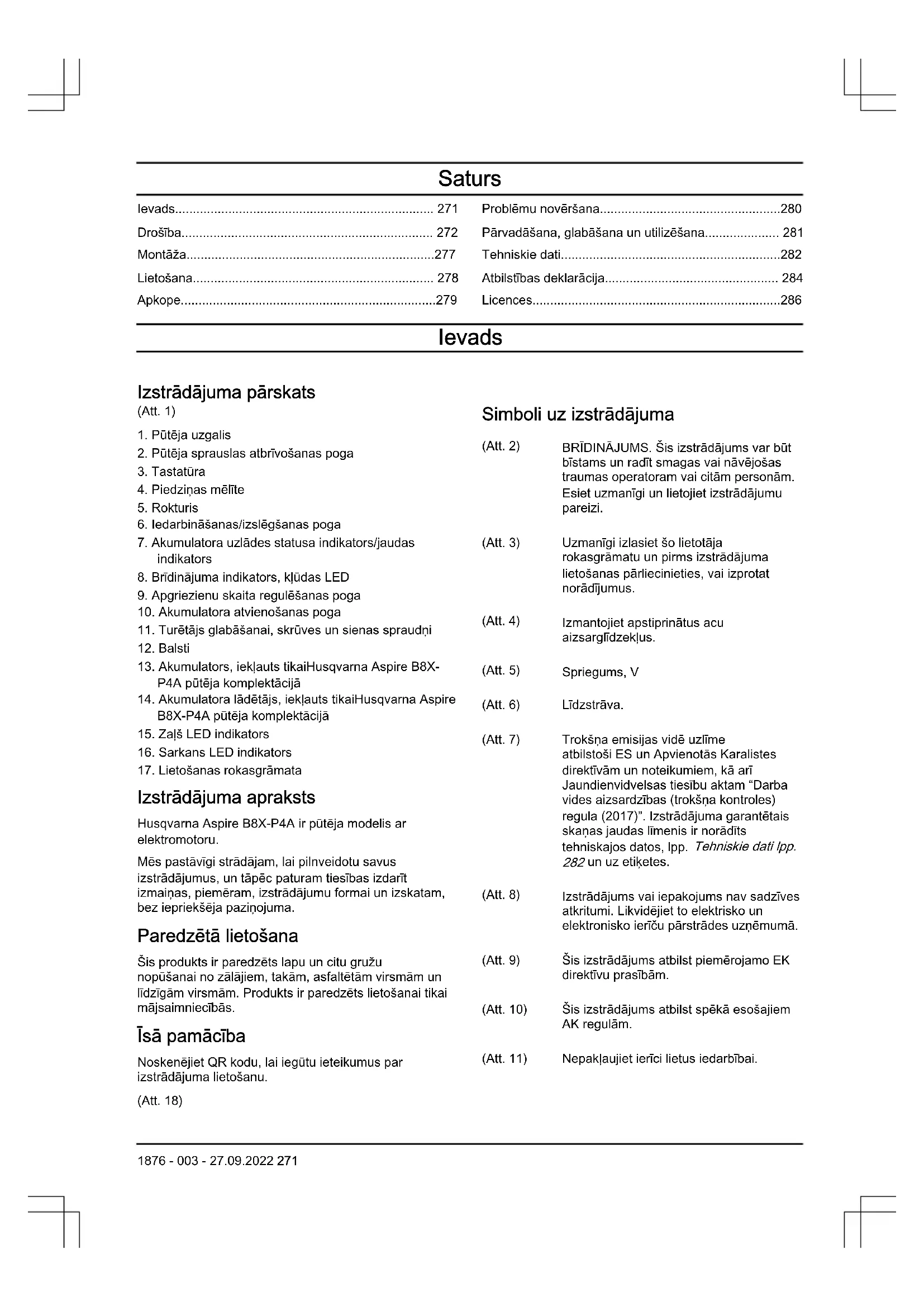 Izstrādājuma apraksts Husqvarna Aspire B8X-P4A ir pūtēja modelis ar elektromotoru. Mēs pastāvīgi strādājam, lai pilnveidotu savus izstrādājumus, un tāpēc paturam tiesības izdarīt izmaiņas, piemēram, izstrādājumu formai un izskatam, bez iepriekšēja paziņojuma. Paredzētā lietošana Šis produkts ir paredzēts lapu un citu gružu nopūšanai no zālājiem, takām, asfaltētām virsmām un līdzīgām virsmām. Produkts ir paredzēts lietošanai tikai mājsaimniecībās. Īsā pamācība Noskenējiet QR kodu, lai iegūtu ieteikumus par izstrādājuma lietošanu. (Att. 18) Simboli uz izstrādājuma (Att. 2) BRĪDINĀJUMS. Šis izstrādājums var būt bīstams un radīt smagas vai nāvējošas traumas operatoram vai citām personām. Esiet uzmanīgi un lietojiet izstrādājumu pareizi. (Att. 3) Uzmanīgi izlasiet šo lietotāja rokasgrāmatu un pirms izstrādājuma lietošanas pārliecinieties, vai izprotat norādījumus. (Att. 4) Izmantojiet apstiprinātus acu aizsarglīdzekļus. (Att. 5) Spriegums, V (Att. 6) Līdzstrāva. (Att. 7) Trokšņa emisijas vidē uzlīme atbilstoši ES un Apvienotās Karalistes direktīvām un noteikumiem, kā arī Jaundienvidvelsas tiesību aktam “Darba vides aizsardzības(trokšņa kontroles) regula(2017)”. Izstrādājuma garantētais skaņas jaudas līmenis ir norādīts tehniskajos datos, lpp. Tehniskie dati lpp.
