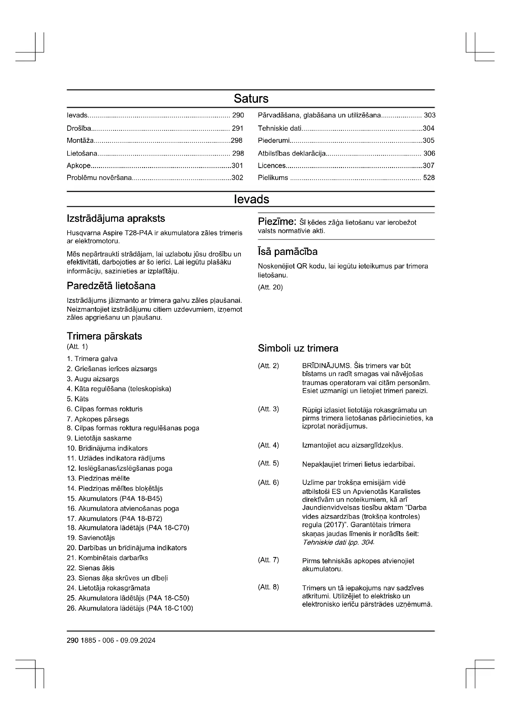 (Att. 7) Pirms tehniskās apkopes atvienojiet akumulatoru. (Att. 8) Trimers un tā iepakojums nav sadzīves atkritumi. Utilizējiet to elektrisko un elektronisko ierīču pārstrādes uzņēmumā. 290 1885 - 006 - 09.09.2024(Att. 9) Uzmanieties no priekšmetiem, kas tiek izsviesti. (Att. 10) Neizmantojiet metāla asmeņus. (Att. 11) Šis izstrādājums atbilst spēkā esošo ES direktīvu prasībām. (Att. 12) Šis izstrādājums atbilst spēkā esošajiem AK noteikumiem. (Att. 13) Līdzstrāva. (Att. 17) Attālumam no iekārtas līdz ap- kārtējiem cilvēkiem jābūt vismaz 15 m (50 pēdas). yyyywwxxxxx Datu plāksnītē vai lāzera izdrukā ir norādīts sērijas numurs. yyyy ir ražošanas gads, un ww ir ražo- šanas nedēļa. Simboli uz akumulatora un/vai akumulatoru lādētāja (Att. 18) Utilizējiet šo izstrādā- jumu elektrisko un elektronisko ierīču pārstrādes uzņēmu- mā. (Attiecas vienīgi uz Eiropu) (Att. 19) Akumulatoru izmanto- jiet tikai POWER FOR ALL sistēmas partneru izstrādāju- mos. (Att. 14) Bezatteices transformators. (Att. 15) Lietojiet un uzglabājiet akumulatoru lādētāju tikai iekštelpās. (Att. 16) Dubultā izolācija. Produkta bojājumi Mēs neatbildam par mūsu produkta bojājumiem, ja: