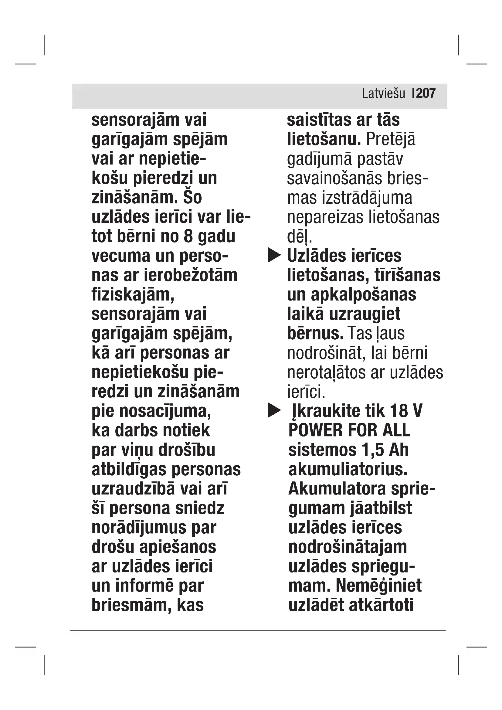 ALL sistemos akumuliatoriai 1,5 Ah ≈24 ≈33 2,0 Ah ≈32 ≈45 2,5 Ah ≈40 ≈60 3,0 Ah ≈48 ≈72 4,0 Ah ≈64 ≈95 4,0 Ah Power Plus ≈69 ≈88 5,0 Ah ≈80 ≈105 6,0 Ah ≈96 ≈130 atbilst uzlādes pakāpei apm. ≈ 80 % atbilst pilnas uzlādes pakāpei Indikācijas elementu nozīme Ātri mirgo zaļš uzlādes pakāpes indikators Par ātro uzlādi signalizē mirgojošs zaļais akumulatora uzlādes indikators (2). Akumulatoru var jebkurā brīdī izņemt un sākt lietot. Latviešu212 | Kad akumulatora ietilpība sas- niedz aptuveni 80 %, zaļā uzlādes indikatora mirgošana palēninās. Tādējādi ir noslēdzies akumula- tora ātrais uzlādes process. Ja akumulators tiek atstāts uzlādes ierīcē, uzlādes process tiek pa- beigts ar mazāku ātrumu. Lēni mirgo zaļš uzlādes pakāpes indikators Pie apmēram 80 % akumulatora uzlādes pakāpes mirgo zaļais uzlādes pakāpes indikators (2) lēnām. Akumulatoru var izņemt un nekavējoties uzsākt tā lietošanu. Akumulatora uzlādes zaļais indikators deg pastāvīgi Pastāvīgi degošs zaļš uzlādes indikators (2) signalizē, ka aku- mulators ir pilnībā uzlādēts. Pēc tam akumulatoru var izņemt no uzlādes ierīces un uzreiz sākt lietot. Ja akumulators nav ievietots, pastāvīgi degošs uzlādes in- dikators (2), signalizē, ka tīkla kontaktdakša ir iesprausta kontaktligzdā un uzlādes ierīce ir gatava darbam. Pastāvīgi degošs sar- kans indikators parāda temperatūras kontroli Pastāvīgi degošs sarkans indikators (1) signalizē, ka akumulatora temperatūra neiekļaujas pieļaujamajā uzlādes temperatūras diapazonā (0–45 °C). Uzlādes process sākas, tiklīdz temperatūra atgriežas pieļaujamo uzlādes temperatūras vērtību diapazonā. Mirgojošs sarkans kļūmes indikators Mirgojošs sarkans indikators (1) signalizē par citiem traucējumiem uzlādes procesā (skatīt „Akumulators netiek lādēts“, Lappuse 213). Latviešu| 213 Kļūdu novēršana Akumulators netiek lādēts Akumulators netiek lādēts, un sarkanais indikators (1) mirgo un uzlādes pakāpes indikators (2) deg pastāvīgi. Cēlonis: uzlādes ierīcē ir konstatēta iekšējā kļūme Novēršana: pārliecinieties, vai visi akumulatori ir pilnībā iesprausti. Izvelciet un no jauna iespraudiet tīkla kontaktdakšu. Atjunkite maitinimo kištuką ir jį vėl prijunkite. Jei klaida vėl įvyksta, atiduokite kroviklį patikrinti į įgaliotąjį „Husqvarna“ gaminių garantinių paslaugų centrą. Cēlonis: akumulators nav pareizi ievietots Novēršana: pareizi ievietojiet akumulatoru uzlādes ierīcē. Cēlonis: akumulators un uzlādes kontakti ir netīri Novēršana: notīriet akumulatoru un uzlādes kontaktus, piemēram, atkārtoti ievietojot un izņemot akumulatoru. Cēlonis: akumulators ir bojāts Novēršana: nomainiet akumu- latoru. Akumulators netiek lādēts, un uzlādes pakāpes indikators (1) deg sarkanā krāsā. Cēlonis: akumulatora temperatūra ir ārpus pieļaujamo uzlādes temperatūras vērtību diapazona robežām Novēršana: pagaidiet, līdz aku- mulatora temperatūra atgriežas pieļaujamajā uzlādes temperatūras vērtību diapazonā (0–45 °C). Indikatori nedeg Indikatori neizgaismojas, aku- mulators netiek lādēts. Cēlonis: bojāta kontaktligzda, elektrokabelis vai uzlādes ierīce Latviešu214 | Novēršana: pārbaudiet tīkla spriegumu. Lieciet uzlādes ierīci pārbaudīt autorizētā klientu apkalpošanas centrā. Cēlonis: uzlādes ierīces kontakt- dakša nav (pareizi) iesprausta elektrotīkla kontaktligzdā Novēršana: iespraudiet kontakt- dakšu (pilnībā) elektrotīkla kontaktligzdā. Atbrīvošanās no nolietotajiem izstrādājumiem Uzlādes ierīce, tās piederumi un iesaiņojuma materiāli jānodod otrreizējai pārstrādei apkārtējai videi nekaitīgā veidā. Neizmetiet nolietoto uzlādes ierīci sadzīves atkritumu tvertnē! Tikai EK valstīm. Saskaņā ar Eiropas Savienības Direktīvu 2012/19/ES par nolietotajām elektriskajām un elektroniskajām ierīcēm un šīs direktīvas transponēšanu valsts tiesību aktos lietošanai nolietotās uzlādes ierīces jāsavāc atsevišķi un jānogādā otrreizējai pārstrādei apkārtējai videi nekaitīgā veidā. Ja elektriskās un elektroniskās ierīces netiek atbilstoši utilizētas, tās var kaitēt videi un cilvēku veselībai iespējamās bīstamo vielu klātbūtnes dēļ. Lietuvių k. Saugos nuorodos Pers- kaity- kite visas šias saugos nuorodas ir reikalavi- mus. Nesilaikant saugos nuorodų ir reikalavimų Lietuvių k.| 215 gali trenkti elektros smūgis, kilti gaisras, ga- lima smarkiai susižaloti ir sužaloti kitus asmenis. Išsaugokite šią instrukciją. Kroviklį naudokite tik tada, jei susipažinote su visomis jo funkcijomis ir esate jį visiškai įvaldę arba buvote atitinkamai apmokyti. u Šis kroviklis nėra skirtas, kad juo naudotųsi vai- kai ar asmenys su fizinėmis, jutiminėmis ir dvasinėmis negalio- mis arba asmenys, kuriems trūksta pa- tirties arba žinių. Šį kroviklį gali naudoti 8 metų ir vyresni vaikai bei asme- nys su fizinėmis, jutiminėmis ir dvasinėmis negalio- mis arba asmenys, kuriems trūksta patirties ar žinių, jei juos prižiūri ir už jų saugumą atsako atsakingas asmuo arba jei jie buvo instruktuoti, kaip saugiai naudoti kroviklį ir žino apie gresiančius pavo- jus. Priešingu atveju įrankis gali būti val- domas netinkamai ir kyla sužeidimų pavo- jus. u Stebėkite vaikus prietaisą naudojant, valant ir atliekant jo techninę priežiūra. Taip bus užtikrinta, kad vaikai su krovikliu nežaistų. u Uzlādējiet tikai 18 Lietuvių k.216 |
