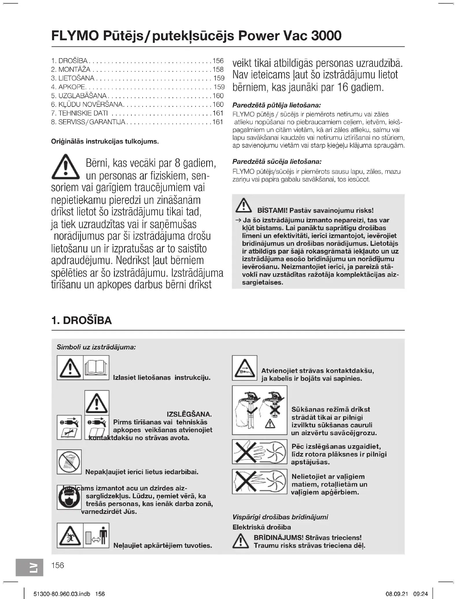 Izlasiet lietošanas instrukciju. IZSLĒGŠANA. Pirms tīrīšanas vai tehniskās apkopes veikšanas atvienojiet kontaktdakšu no strāvas avota. Nepakļaujiet ierīci lietus iedarbībai. Ieteicams izmantot acu un dzirdes aiz- sarglīdzekļus. Lūdzu, ņemiet vērā, ka trešās personas, kas ienāk darba zonā, var nedzirdēt Jūs. Neļaujiet apkārtējiem tuvoties. Atvienojiet strāvas kontaktdakšu, ja kabelis ir bojāts vai sapinies. Sūkšanas režīmā drīkst strādāt tikai ar pilnīgi izvilktu sūkšanas cauruli un aiz vērtu savācējgrozu. Pē c izslēgšanas uzgaidiet, līdz rotora plāksnes ir pilnīgi apstājušas. Nelietojiet ar vaļīgiem matiem, rotaļlietām un vaļīgiem apģērbiem. Vispārīgi drošības brīdinājumi Elektriskā drošība BRĪDINĀJUMS! Strāvas trieciens! Traumu risks strāvas trieciena dēļ. Simboli uz izstrādājuma: