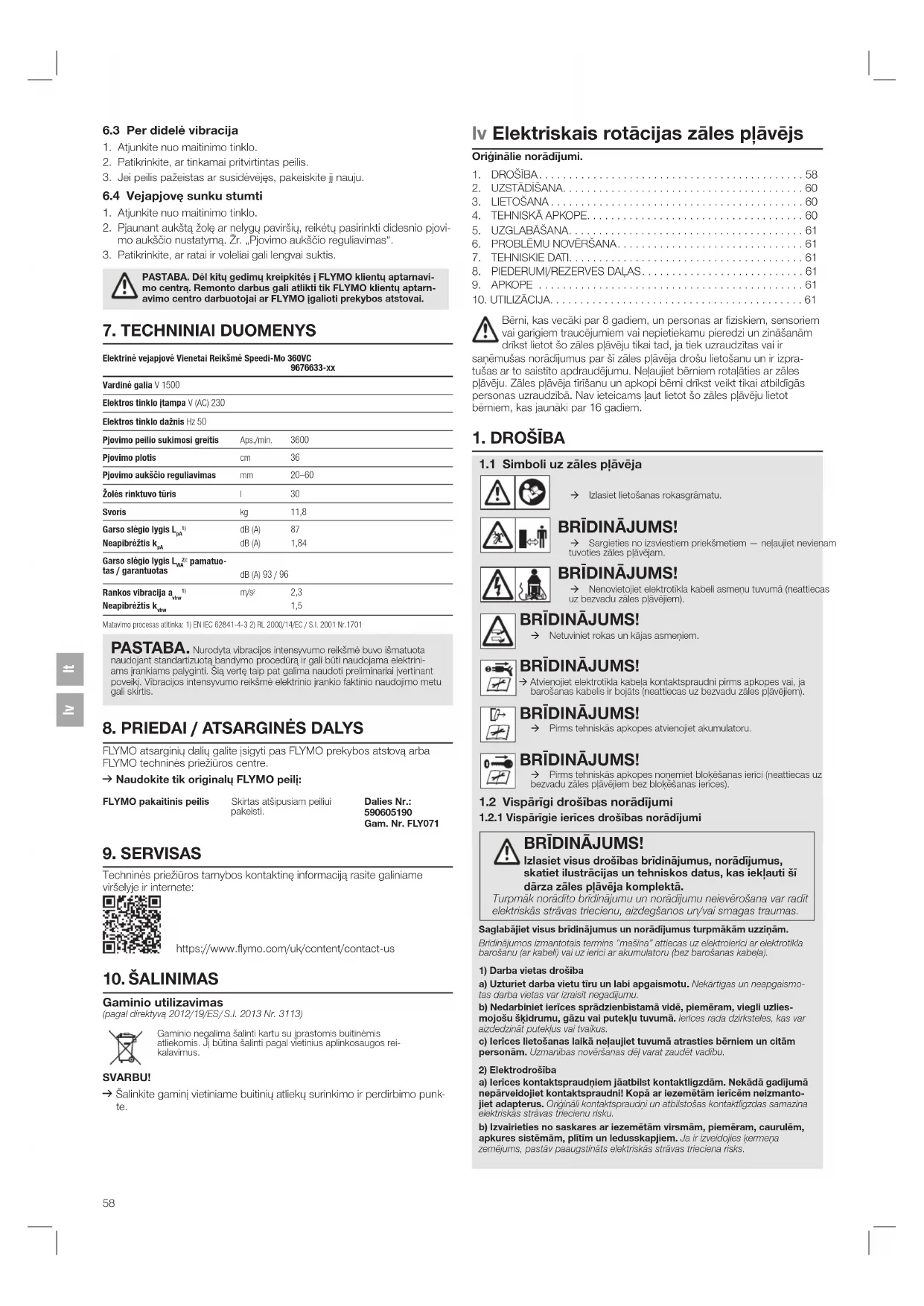 PIEZĪME. Citu darbības traucējumu gadījumā sazinieties ar FLYMO klientu apkalpošanas dienestu. Remontu drīkst veikt tikai FLYMO apkopes dienests vai specializēti izplatītāji, ko apstiprinājis uzņēmums FLYMO.