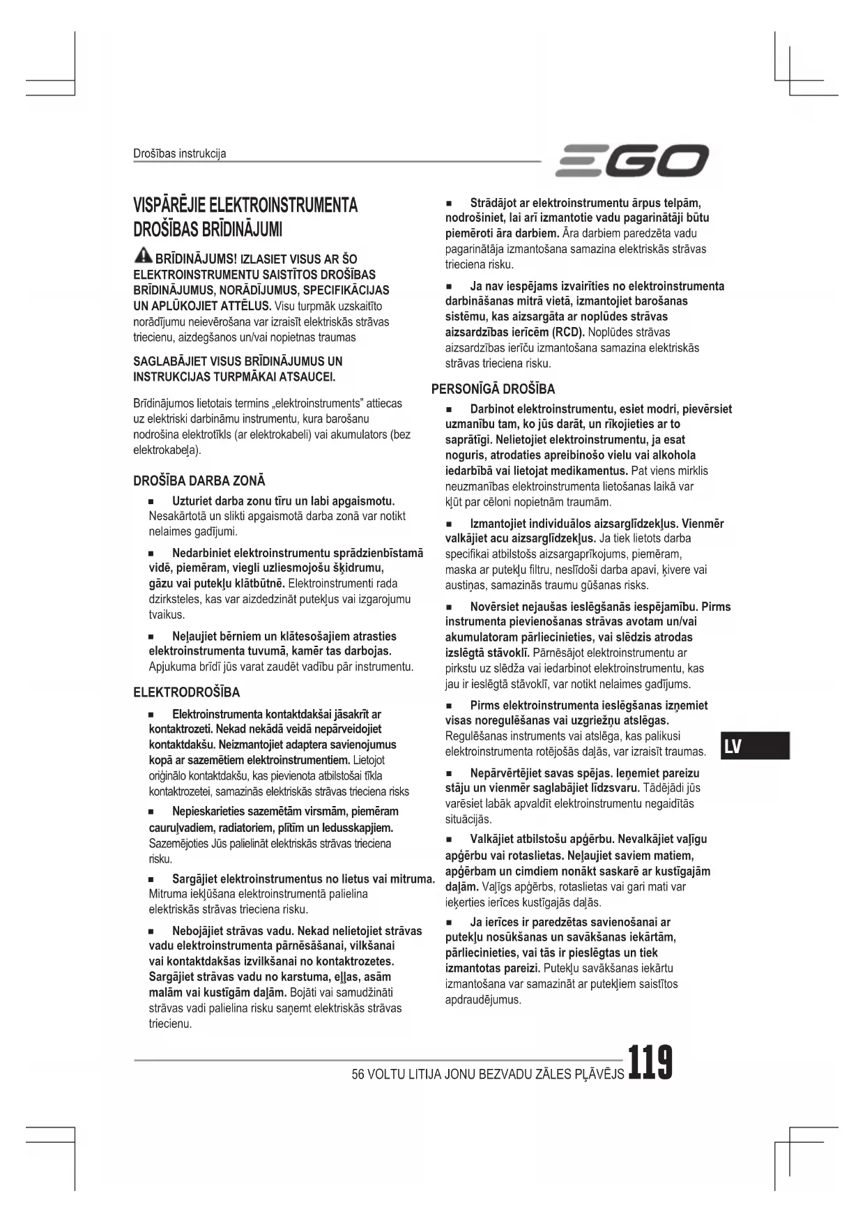 ◾ Darbinot elektroinstrumentu, esiet modri, pievērsiet uzmanību tam, ko jūs darāt, un rīkojieties ar to saprātīgi. Nelietojiet elektroinstrumentu, ja esat noguris, atrodaties apreibinošo vielu vai alkohola iedarbībā vai lietojat medikamentus. Pat viens mirklis neuzmanības elektroinstrumenta lietošanas laikā var kļūt par cēloni nopietnām traumām. ◾ Izmantojiet individuālos aizsarglīdzekļus. Vienmēr valkājiet acu aizsarglīdzekļus. Ja tiek lietots darba specikai atbilstošs aizsargaprīkojums, piemēram, maska ar putekļu ltru, neslīdoši darba apavi, ķivere vai austiņas, samazinās traumu gūšanas risks. ◾ Novērsiet nejaušas ieslēgšanās iespējamību. Pirms instrumenta pievienošanas strāvas avotam un/vai akumulatoram pārliecinieties, vai slēdzis atrodas izslēgtā stāvoklī. Pārnēsājot elektroinstrumentu ar pirkstu uz slēdža vai iedarbinot elektroinstrumentu, kas jau ir ieslēgtā stāvoklī, var notikt nelaimes gadījums. ◾ Pirms elektroinstrumenta ieslēgšanas izņemiet visas noregulēšanas vai uzgriežņu atslēgas. Regulēšanas instruments vai atslēga, kas palikusi elektroinstrumenta rotējošās daļās, var izraisīt traumas. ◾ Nepārvērtējiet savas spējas. Ieņemiet pareizu stāju un vienmēr saglabājiet līdzsvaru. Tādējādi jūs varēsiet labāk apvaldīt elektroinstrumentu negaidītās situācijās. ◾ Valkājiet atbilstošu apģērbu. Nevalkājiet vaļīgu apģērbu vai rotaslietas. Neļaujiet saviem matiem, apģērbam un cimdiem nonākt saskarē ar kustīgajām daļām. Vaļīgs apģērbs, rotaslietas vai gari mati var ieķerties ierīces kustīgajās daļās. ◾ Ja ierīces ir paredzētas savienošanai ar putekļu nosūkšanas un savākšanas iekārtām, pārliecinieties, vai tās ir pieslēgtas un tiek izmantotas pareizi. Putekļu savākšanas iekārtu izmantošana var samazināt ar putekļiem saistītos apdraudējumus.Drošības instrukcija56 VOLTU LITIJA JONU BEZVADU ZĀLES PĻĀVĒJS120