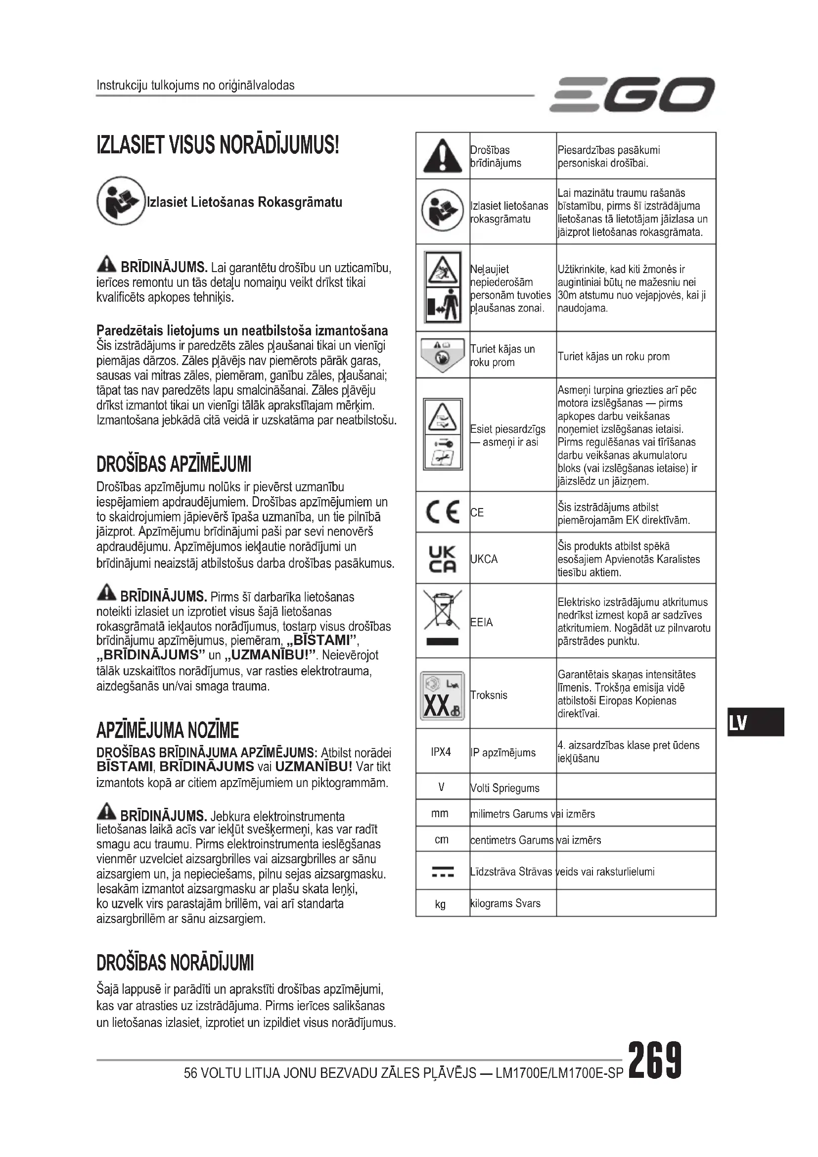 ◾ Pļaušanas laikā, kā arī, veicot regulēšanas vai remontdarbus, vienmēr valkājiet aizsargbrilles vai drošības brilles, lai aizsargātu acis. Izmesti priekšmeti, kas atlec atpakaļ, var izraisīt nopietnas acu traumas. Ja darba vide ir putekļaina, lietojiet sejas vai putekļu masku. ◾ Ģērbieties atbilstoši — nevalkājiet vaļīgas drēbes un rotaslietas. Tās var tikt ierautas kustīgajās daļās. Strādājot ārpus telpām, ieteicams valkāt gumijas cimdus un apavus. Valkājiet izturīgus darba apavus ar biezu zoli un cieši piegulošas bikses un kreklu. Ieteicams valkāt kreklus un bikses, kas piekļaujas rokām un kājām, kā arī apavus ar tērauda purngalu. Nedarbiniet pļaujmašīnu, ja jums ir basas kājas vai kājās ir sandales vai vieglas (piemēram, brezenta auduma) kurpes. ◾ Nelieciet rokas vai kājas pie rotējošajām daļām vai zem pļaušanas bloka. Nonākot saskarē ar asmeni, varat sagriezt rokas un kājas. ◾ Ja nav uzlikts izlādes pārsegs vai tas ir bojāts, varat nonākt saskarē ar asmeņiem vai gūt traumas no izsviestiem priekšmetiem. ◾ Vairums traumu rodas, kad zāles pļāvējs pārbrauc pāri pēdām kritiena laikā, ko izraisa paslīdēšana vai paklupšana. Ja krītat zemē, neturieties pie zāles pļāvēja, nekavējoties atlaidiet rokturi. ◾ Pārvietošanās laikā nekad nevelciet pļāvēju atpakaļvirzienā uz sevi. Ja zāles pļāvējs ir jānostumj nost no sienas vai kāda šķēršļa, vispirms paskatieties uz leju un aiz sevis, lai nepakluptu, un pēc tam rīkojieties šādi: ◾ solis atpakaļ no zāles pļāvēja, lai varētu pilnībā izstiept rokas; ◾ saglabājiet līdzsvaru un ieņemiet drošu stāju; ◾ lēnām velciet zāles pļāvēju atpakaļgaitā, bet ne vairāk kā pusceļu no sevis; ◾ ja nepieciešams, atkārtojiet šīs darbības. ◾ Nedarbiniet pļaujmašīnu, ja esat alkohola vai apreibinošu vielu ietekmē. ◾ Saglabājiet modrību — sekojiet līdzi visam, ko darāt. Rīkojieties saprātīgi. Nedarbiniet zāles pļāvēju, ja jūtat nogurumu. ◾ Motora/asmens vadības rokturis ir drošības ierīce. Nekad nemēģiniet izmainīt tā darbību. Pretējā gadījumā drošības ierīce var nedarboties un izraisīt traumas, kuras rodas, saskaroties ar rotējošo asmeni. Motora/ asmens vadības rokturim jābūt viegli darbināmam abos virzienos un, to atlaižot, automātiski jāatgriežas nesaslēgtā stāvoklī. ◾ Izvairieties no bīstamas vides — nelietojiet zāles pļāvēju mitrās vietās. ◾ Nelietojiet lietū. ◾ Vienmēr ieturiet stabilu stāju. Paslīdēšana un paklupšana var izraisīt nopietnas traumas. Ja jūtat, ka varat paslīdēt vai paklupt, nekavējoties atlaidiet motora/ asmens vadības rokturi, un asmens pārstās griezties trīs sekunžu laikā. ◾ Apturiet asmeni, šķērsojot grants celiņus, gājēju celiņus vai ceļu. ◾ Ja pļaujmašīna sāk neierasti vibrēt, apturiet motoru un nekavējoties nosakiet cēloni. Vibrēšana parasti brīdina par kļūmi: ◾ pārbaudiet, vai pļaujmašīnai nav radušies bojājumi; ◾ nomainiet vai salabojiet visas bojātās daļas, kuras drīkst mainīt vai labot lietotājs; ◾ pārbaudiet un pievelciet visas atskrūvējušās detaļas; ◾ nekādā gadījumā nedarbiniet zāles pļāvēju, ja nav uzstādīts atbilstošs aizmugurējais aizsargs, izlādes pārsegs, zāles savācējgrozs, mulčēšanas ieliktnis, sānu izlādes tekne, motora/asmens vadības rokturis vai cita drošības ierīce. Nekad nedarbiniet zāles pļāvēju ar bojātām drošības ierīcēm. Pretējā gadījumā tas var radīt miesas bojājumus. ◾ Gadījumos, kas nav aprakstīti šajā rokasgrāmatā, esiet uzmanīgi un rīkojieties prātīgi. Lai saņemtu palīdzību, sazinieties ar EGO klientu apkalpošanas centru. ◾ Izmantojiet tikai A attēlā uzskaitītos akumulatora blokus un lādētājus. ◾ Pirms nododat ierīci uz atkritumu savākšanas punktu, izņemiet no tās akumulatoru bloku. ◾ No akumulatora jāatbrīvojas drošā veidā. PĻAUŠANA SLĪPUMĀ: Nogāzes ir galvenais faktors, kas saistīts ar paslīdēšanas un paklupšanas negadījumiem, kas var novest pie smagu traumu gūšanas. Vienmēr pārliecinieties, vai jums, atrodoties slīpumā, zem kājām ir drošs pamats. Pļaujot slīpumā ir nepieciešama papildus piesardzība. Ja jūtaties neomulīgi, pļaujot nogāzēs, nepļaujiet.56 VOLTU LITIJA JONU BEZVADU ZĀLES PĻĀVĒJS — LM1700E/LM1700E-SP 275