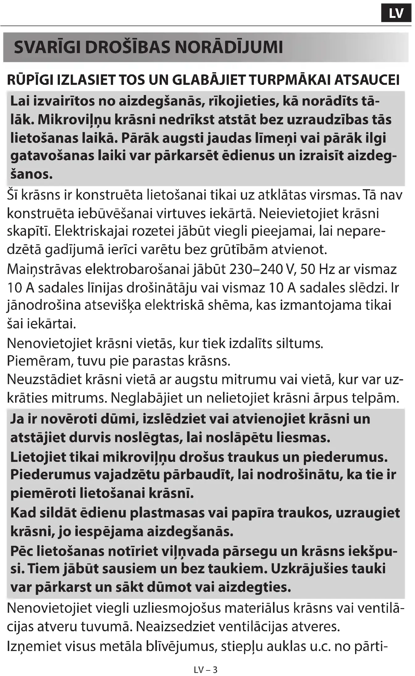 - Nodrošiniet, ka bērni netuvojas durvīm, lai viņi neapdedzi- nātos. BRĪDINĀJUMS! Ļaujiet bērniem no 8gadu vecuma lietot krāsni bez uzraudzības tikai tad, kad viņiem ir sniegti at- bilstoši norādījumi tā, ka bērns ir spējīgs izmantot krāsni droši un saprot nepareizas lietošanas risku. Kad ierīce darbojas režīmā GRILL, MIX GRILL, CONVEC- TION, MIX CONVECTION un AUTO MENU (režīms pieejams atkarībā no modeļa), bērni drīkst izmantot krāsni tikai pieaugušo uzraudzībā radītās temperatūras dēļ.LV – 9LV – 9 uzsildīšanas laiku nedrīkst pārsniegt. Nelietojiet metāla piederumus, kuri atstaro mikroviļņus un var izraisīt elektrisko dzirksteļošanu. Neievietojiet krāsnī skārda kārbas. Lai novērstu rotējošā diska vai pamatnes salūšanu, rīkojieties, kā norādīts tālāk. a) Pirms tīrīšanas ar ūdeni ļaujiet atdzist. b) Nenovietojiet karstus vai aukstus ēdienus vai karstus pied- erumus uz aukstas krāsns pamatnes. c) Krāsns lietošanas laikā nenovietojiet neko uz ārējā korpusa. PIEZĪME. Nelietojiet plastmasas traukus sildīšanai ar mikroviļņiem, ja krāsns joprojām ir karsta pēc kombinētā režīma izmantošanas (atkarībā no krāsns modeļa), jo tas var sakust. Ja vien plastmasas trauku ražotājs nenorāda to piemērotību izmantošanai iepriekš minētajiem režīmiem, nelietojiet tos. Ja neesat pārliecināts, kā pieslēgt savu krāsni, lūdzu, konsultē- jieties ar pilnvarotu un kvali cētu elektriķi. Ne ražotājs, ne izplatītājs nevar uzņemties nekādu atbildību par krāsns bojājumiem vai traumām, kas radušās, neņemot vērā pareizo elektrisko savienojumu. Dažreiz uz krāsns sienām vai ap durvju blīvēm un blīvējuma virsmām var veidoties ūdens tvaiki vai pilieni. Tā ir normāla pa- rādība un nenorāda uz mikroviļņu krāsns noplūdēm vai nepa- reizu darbību. Šī ierīce paredzēta izmantošanai mājsaimniecībās un līdzīgās vietās, piemēram; veikalos personāla virtuvēs, birojos un citās darba vietās / zemnieku saimniecībās / klientu izmantošanai viesnīcās, moteļos un citās apdzīvojamās vietās / gultasvietas un brokastu tipa vietās. Šis simbols nozīmē, ka lietošanas laikā virsmas var sakarst. LV – 8 LV – 8 Šī ierīce nav paredzēta lietošanai cilvēkiem (tai skaitā bēr- niem) ar samazinātām ziskajām, jutīguma vai garīgajām spējām vai ar pieredzes un zināšanu trūkumu, ja vien vi- ņiem nav nodrošināta persona, kura atbild par viņu drošī- bu, uzraudzība, vai norādījumi par to, kā izmantot iekārtu. Bērni jāuzrauga, lai nodrošinātu, ka viņi nespēlējas ar ierī- ci. Bērni jāuzrauga, kad tie veic ierīces tīrīšanu. Modeļiem ar elektronisko skārienpaneli ir iespējots bērnu bloķēšanas režīms. Neatbalstieties un nešūpojieties uz krāsns durvīm. Nespēlējie- ties ar krāsni un neizmantojiet to kā rotaļlietu. Bērniem ir jāiemāca visas svarīgās drošības instrukcijas: trau- ku turētāju lietošana, rūpīga pārtikas pārklājumu noņemšana, pievēršot īpašu uzmanību iepakojumam (piemēram, paškarsē- jošajiem materiāliem), kas izstrādāts, lai padarītu ēdienu krauk- šķīgu, jo tas var būt ļoti karsts. Citi brīdinājumi Nekad nekādā veidā nepārveidojiet krāsni. Nepārvietojiet krāsni, kad tā darbojas. Šī ierīce paredzēta izmantošanai mājsaimniecībās. Šī krāsns ir paredzēta tikai pārtikas produktu gatavošanai mājas apstākļos, un to var izmantot tikai ēdiena gatavošanai. Pārtikas produktu un apģērba žāvēšana un sildošo paliktņu, čību, sūkļu, mitru drēbju un līdzīgu lietu sildīšana var radīt traumu, aizdegšanās vai ugunsgrēka risku. Tā nav piemērota lietošanai komerciālos vai laboratorijas nolūkos. Lai krāsns darbotos bez traucējumiem un izvairītos no bo- jājumiem, ņemiet vērā tālāk minēto. Nekad nedarbiniet krāsni, kad tā ir tukša. Kad lietojat apbrū- nināšanas trauku vai pašsasilstošu materiālu, vienmēr zem tā novietojiet siltumizturīgu izolatoru, piemēram, porcelāna šķīvi, lai novērstu krāsns pamatnes bojājumus siltuma spriegumu rezultātā. Trauku lietošanas norādījumos noteikto iepriekšējasLV LV – 9 LV – 9 uzsildīšanas laiku nedrīkst pārsniegt. Nelietojiet metāla piederumus, kuri atstaro mikroviļņus un var izraisīt elektrisko dzirksteļošanu. Neievietojiet krāsnī skārda kārbas. Lai novērstu rotējošā diska vai pamatnes salūšanu, rīkojieties, kā norādīts tālāk. a) Pirms tīrīšanas ar ūdeni ļaujiet atdzist. b) Nenovietojiet karstus vai aukstus ēdienus vai karstus pied- erumus uz aukstas krāsns pamatnes. c) Krāsns lietošanas laikā nenovietojiet neko uz ārējā korpusa. PIEZĪME. Nelietojiet plastmasas traukus sildīšanai ar mikroviļņiem, ja krāsns joprojām ir karsta pēc kombinētā režīma izmantošanas (atkarībā no krāsns modeļa), jo tas var sakust. Ja vien plastmasas trauku ražotājs nenorāda to piemērotību izmantošanai iepriekš minētajiem režīmiem, nelietojiet tos. Ja neesat pārliecināts, kā pieslēgt savu krāsni, lūdzu, konsultē- jieties ar pilnvarotu un kvali cētu elektriķi. Ne ražotājs, ne izplatītājs nevar uzņemties nekādu atbildību par krāsns bojājumiem vai traumām, kas radušās, neņemot vērā pareizo elektrisko savienojumu. Dažreiz uz krāsns sienām vai ap durvju blīvēm un blīvējuma virsmām var veidoties ūdens tvaiki vai pilieni. Tā ir normāla pa- rādība un nenorāda uz mikroviļņu krāsns noplūdēm vai nepa- reizu darbību. Šī ierīce paredzēta izmantošanai mājsaimniecībās un līdzīgās vietās, piemēram; veikalos personāla virtuvēs, birojos un citās darba vietās / zemnieku saimniecībās / klientu izmantošanai viesnīcās, moteļos un citās apdzīvojamās vietās / gultasvietas un brokastu tipa vietās. Šis simbols nozīmē, ka lietošanas laikā virsmas var sakarst. LV – 8LV – 8 Šī ierī