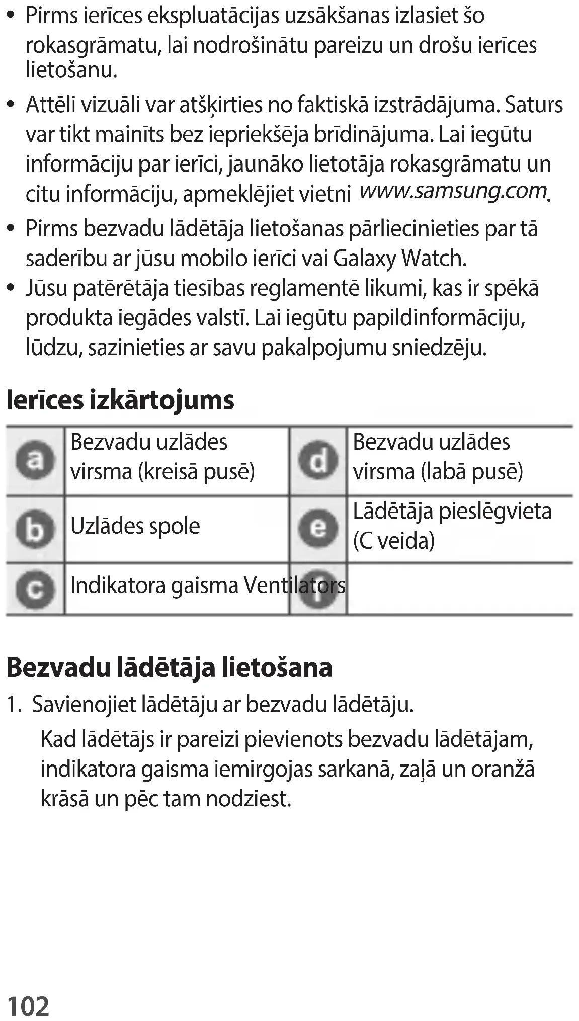 Nelieciet mobilo ierīci vai Galaxy Watch lādēties pie bezvadu lādētāja, ja starp mobilo ierīci vai Galaxy Watch un bezvadu lādētāju atrodas tādi vadoši materiāli kā metāla priekšmeti un magnēti. Mobilā ierīce vai Galaxy Watch, iespējams, netiks pareizi uzlādēta vai varētu pārkarst, kā arī mobilā ierīce, Galaxy Watch vai tuvumā esošās kartes varētu tikt sabojātas.105 Latviešu
