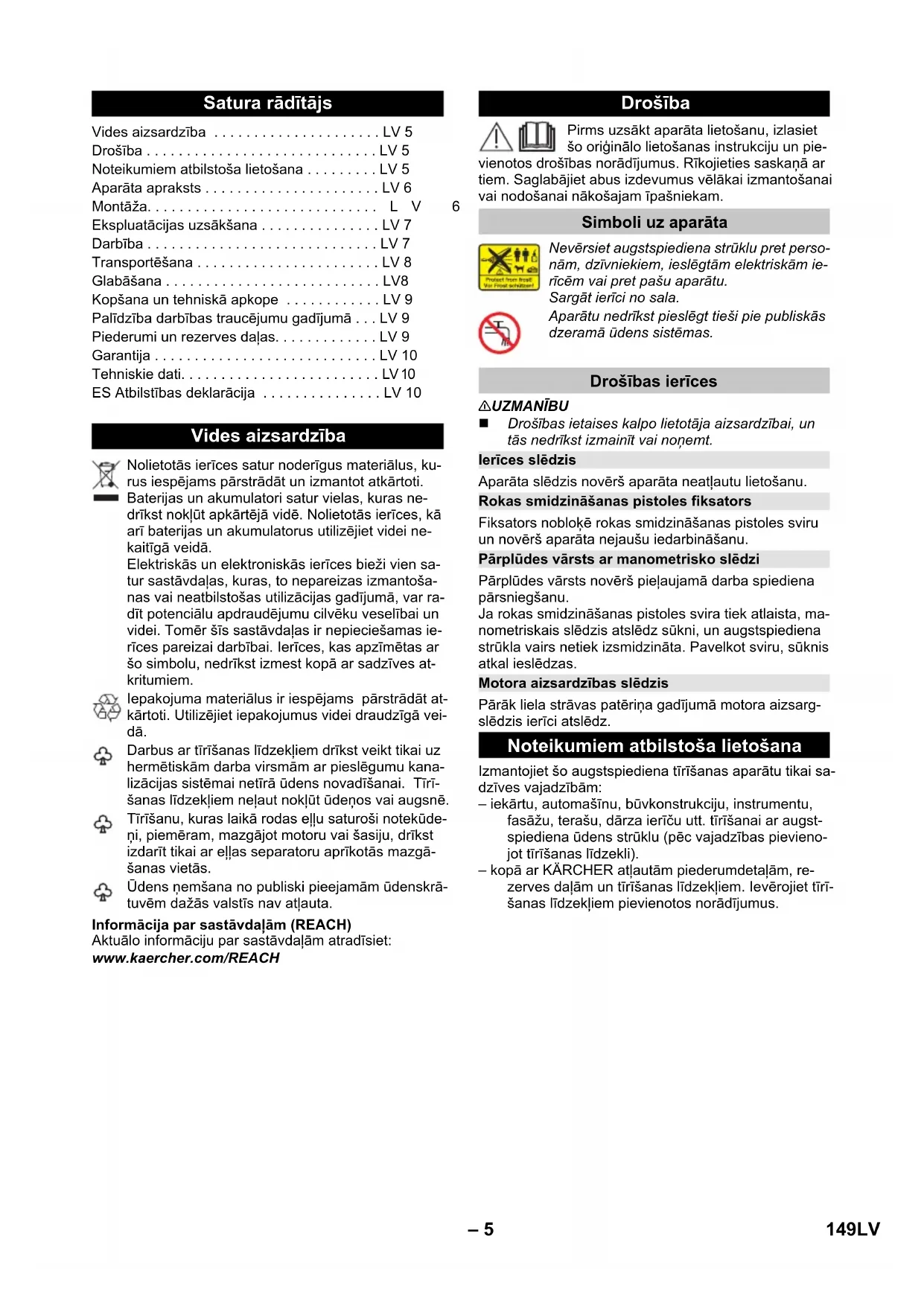 90 dB(A) Jäetakse õigus teha tehnilisi muudatusi. ELi vastavusdeklaratsioon Toode: Kõrgsurvepesur Tüüp: 1.324-xxx Asjakohased EL direktiivid: 2006/42/EU (+2009/127/EU) 2014/30/EL 2011/65/EL 2000/14/EÜ Kohaldatud ühtlustatud standardid: EN 50581 EN 55014–1: 2006+A1: 2009+A2: 2011 EN 55014–2: 2015 EN 60335–1 EN 60335–2–79 EN 61000–3–2: 2014 EN 61000–3–3: 2013 EN 62233: 2008 Järgitud vastavushindamise protseduur: 2000/14/EÜ: Lisa V Helivõimsuse tase dB(A) Mõõdetud: 88 Garanteeritud: 90 Winnenden, 2018/10/01 Chairman of the Board of Management Director Regulatory Affairs & Certification 148 ET– 5 Informācija par sastāvdaļām (REACH) Aktuālo informāciju par sastāvdaļām atradīsiet: www.kaercher.com/REACH Pirms uzsākt aparāta lietošanu, izlasiet šo oriģinālo lietošanas instrukciju un pie- vienotos drošības norādījumus. Rīkojieties saskaņā ar tiem. Saglabājiet abus izdevumus vēlākai izmantošanai vai nodošanai nākošajam īpašniekam. 몇 UZMANĪBU Drošības ietaises kalpo lietotāja aizsardzībai, un tās nedrīkst izmainīt vai noņemt. Aparāta slēdzis novērš aparāta neatļautu lietošanu. Fiksators nobloķē rokas smidzināšanas pistoles sviru un novērš aparāta nejaušu iedarbināšanu. Pārplūdes vārsts novērš pieļaujamā darba spiediena pārsniegšanu. Ja rokas smidzināšanas pistoles svira tiek atlaista, ma- nometriskais slēdzis atslēdz sūkni, un augstspiediena strūkla vairs netiek izsmidzināta. Pavelkot sviru, sūknis atkal ieslēdzas. Pārāk liela strāvas patēriņa gadījumā motora aizsarg- slēdzis ierīci atslēdz. Izmantojiet šo augstspiediena tīrīšanas aparātu tikai sa- dzīves vajadzībām: – iekārtu, automašīnu, būvkonstrukciju, instrumentu, fasāžu, terašu, dārza ierīču utt. tīrīšanai ar augst- spiediena ūdens strūklu (pēc vajadzības pievieno- jot tīrīšanas līdzekli). – kopā ar KÄRCHER atļautām piederumdetaļām, re- zerves daļām un tīrīšanas līdzekļiem. Ievērojiet tīrī- šanas līdzekļiem pievienotos norādījumus. Satura rādītājs Vides aizsardzība . . . . . . . . . . . . . . . . . . . . . LV 5 Drošība . . . . . . . . . . . . . . . . . . . . . . . . . . . . . LV 5 Noteikumiem atbilstoša lietošana . . . . . . . . . LV 5 Aparāta apraksts . . . . . . . . . . . . . . . . . . . . . . LV 6 Montāža. . . . . . . . . . . . . . . . . . . . . . . . . . . . .LV 6 Ekspluatācijas uzsākšana . . . . . . . . . . . . . . . LV 7 Darbība . . . . . . . . . . . . . . . . . . . . . . . . . . . . . LV 7 Transportēšana . . . . . . . . . . . . . . . . . . . . . . . LV 8 Glabāšana . . . . . . . . . . . . . . . . . . . . . . . . . . . LV8 Kopšana un tehniskā apkope . . . . . . . . . . . . LV 9 Palīdzība darbības traucējumu gadījumā . . . LV 9 Piederumi un rezerves daļas. . . . . . . . . . . . . LV 9 Garantija . . . . . . . . . . . . . . . . . . . . . . . . . . . . LV 10 Tehniskie dati. . . . . . . . . . . . . . . . . . . . . . . . . LV 10 ES Atbilstības deklarācija . . . . . . . . . . . . . . . LV 10 Vides aizsardzība Nolietotās ierīces satur noderīgus materiālus, ku- rus iespējams pārstrādāt un izmantot atkārtoti. Baterijas un akumulatori satur vielas, kuras ne- drīkst nokļūt apkārtējā vidē. Nolietotās ierīces, kā arī baterijas un akumulatorus utilizējiet videi ne- kaitīgā veidā. Elektriskās un elektroniskās ierīces bieži vien sa- tur sastāvdaļas, kuras, to nepareizas izmantoša- nas vai neatbilstošas utilizācijas gadījumā, var ra- dīt potenciālu apdraudējumu cilvēku veselībai un videi. Tomēr šīs sastāvdaļas ir nepieciešamas ie- rīces pareizai darbībai. Ierīces, kas apzīmētas ar šo simbolu, nedrīkst izmest kopā ar sadzīves at- kritumiem. Iepakojuma materiālus ir iespējams pārstrādāt at- kārtoti. Utilizējiet iepakojumus videi draudzīgā vei- dā. Darbus ar tīrīšanas līdzekļiem drīkst veikt tikai uz hermētiskām darba virsmām ar pieslēgumu kana- lizācijas sistēmai netīrā ūdens novadīšanai. Tīrī- šanas līdzekļiem neļaut nokļūt ūdeņos vai augsnē. Tīrīšanu, kuras laikā rodas eļļu saturoši notekūde- ņi, piemēram, mazgājot motoru vai šasiju, drīkst izdarīt tikai ar eļļas separatoru aprīkotās mazgā- šanas vietās. Ūdens ņemšana no publiski pieejamām ūdenskrā- tuvēm dažās valstīs nav atļauta. Drošība Simboli uz aparāta Nevērsiet augstspiediena strūklu pret perso- nām, dzīvniekiem, ieslēgtām elektriskām ie- rīcēm vai pret pašu aparātu. Sargāt ierīci no sala. Aparātu nedrīkst pieslēgt tieši pie publiskās dzeramā ūdens sistēmas. Drošības ierīces Ierīces slēdzis Rokas smidzināšanas pistoles fiksators Pārplūdes vārsts ar manometrisko slēdzi Motora aizsardzības slēdzis Noteikumiem atbilstoša lietošana 149LV– 6 Aparāta piegādes komplekts (atkarībā no modeļa) ir at- tēlots uz iepakojuma. Šajā lietošanas instrukcijā ir ap- rakstīti visi iespējamie varianti. Ja trūkst piederumi vai transportēšanas laikā radušies bojājumi, lūdzu, informējiet tirgotāju. Attēlus skatiet 3. atlokāmajā lapā 1 Savienojuma detaļa ūdens pieslēgumam 2 Ūdens pieslēgums ar iebūvētu sietu 3 Augstspiediena šļūtene 4 Šļūtenes vadīkla 5 Smidzināšanas cauruļu glabāšanas nodalījums 6 Rokas smidzināšanas pistoles uzglabāšanas / stā- vēšanas pozīcija 7 Plug 'n' Clean tīrīšanas līdzekļa pieslēgums 8 Nešanas rokturis 9 Transportēšanas rokturis, izvelkams 10 Šļūtenes turētājs 11 Augstspiediena padeve 12 Aparāta slēdzis „0/OFF“ / „I/ON“ 13 Tīkla pieslēguma kabelis ar kontaktdakšu 14 Datu plāksnīte 15 Piederumu nodalījums 16 Āķi tīkla nostiprināšanai 17 Piederumu nodalījuma tīkls 18 Ritentiņš aparāta pārvietošanai 19 Kāja ar rokturi pārnēsāšanai 20 Full Control rokas smidzināšanas pistole 21 Bateriju nodalījums 22 LED spiediena indikators MIX / 1 - 