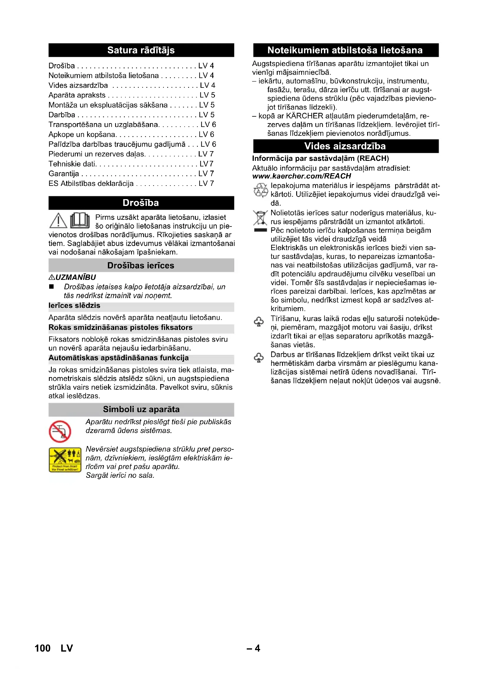 88 dB(A) Jäetakse õigus teha tehnilisi muudatusi. Garantii ELi vastavusdeklaratsioon Toode: Kõrgsurvepesur Tüüp: 1.676-xxx Asjakohased EL direktiivid: 2000/14/EÜ 2014/30/EL 2006/42/EU (+2009/127/EU) 2011/65/EL Kohaldatud ühtlustatud standardid: EN 50581 EN 55014–1: 2006+A1: 2009+A2: 2011 EN 55014–2: 2015 EN 60335–1 EN 60335–2–79 EN 61000–3–2: 2014 EN 61000–3–3: 2013 EN 62233: 2008 Järgitud vastavushindamise protseduur: 2000/14/EÜ: Lisa V Helivõimsuse tase dB(A) Mõõdetud: 85 Garanteeritud: 88 Winnenden, 2018/08/01 Chairman of the Board of Management Director Regulatory Affairs & Certification 99ET– 4 Pirms uzsākt aparāta lietošanu, izlasiet šo oriģinālo lietošanas instrukciju un pie- vienotos drošības norādījumus. Rīkojieties saskaņā ar tiem. Saglabājiet abus izdevumus vēlākai izmantošanai vai nodošanai nākošajam īpašniekam. 몇 UZMANĪBU Drošības ietaises kalpo lietotāja aizsardzībai, un tās nedrīkst izmainīt vai noņemt. Aparāta slēdzis novērš aparāta neatļautu lietošanu. Fiksators nobloķē rokas smidzināšanas pistoles sviru un novērš aparāta nejaušu iedarbināšanu. Ja rokas smidzināšanas pistoles svira tiek atlaista, ma- nometriskais slēdzis atslēdz sūkni, un augstspiediena strūkla vairs netiek izsmidzināta. Pavelkot sviru, sūknis atkal ieslēdzas. Augstspiediena tīrīšanas aparātu izmantojiet tikai un vienīgi mājsaimniecībā. – iekārtu, automašīnu, būvkonstrukciju, instrumentu, fasāžu, terašu, dārza ierīču utt. tīrīšanai ar augst- spiediena ūdens strūklu (pēc vajadzības pievieno- jot tīrīšanas līdzekli). – kopā ar KÄRCHER atļautām piederumdetaļām, re- zerves daļām un tīrīšanas līdzekļiem. Ievērojiet tīrī- šanas līdzekļiem pievienotos norādījumus. Informācija par sastāvdaļām (REACH) Aktuālo informāciju par sastāvdaļām atradīsiet: www.kaercher.com/REACH Satura rādītājs Drošība . . . . . . . . . . . . . . . . . . . . . . . . . . . . . LV 4 Noteikumiem atbilstoša lietošana . . . . . . . . . LV 4 Vides aizsardzība . . . . . . . . . . . . . . . . . . . . . LV 4 Aparāta apraksts . . . . . . . . . . . . . . . . . . . . . . LV 5 Montāža un ekspluatācijas sākšana . . . . . . . LV 5 Darbība . . . . . . . . . . . . . . . . . . . . . . . . . . . . . LV 5 Transportēšana un uzglabāšana. . . . . . . . . . LV 6 Apkope un kopšana. . . . . . . . . . . . . . . . . . . . LV 6 Palīdzība darbības traucējumu gadījumā . . . LV 6 Piederumi un rezerves daļas. . . . . . . . . . . . . LV 7 Tehniskie dati. . . . . . . . . . . . . . . . . . . . . . . . . LV 7 Garantija . . . . . . . . . . . . . . . . . . . . . . . . . . . . LV 7 ES Atbilstības deklarācija . . . . . . . . . . . . . . . LV 7 Drošība Drošības ierīces Ierīces slēdzis Rokas smidzināšanas pistoles fiksators Automātiskas apstādināšanas funkcija Simboli uz aparāta Aparātu nedrīkst pieslēgt tieši pie publiskās dzeramā ūdens sistēmas. Nevērsiet augstspiediena strūklu pret perso- nām, dzīvniekiem, ieslēgtām elektriskām ie- rīcēm vai pret pašu aparātu. Sargāt ierīci no sala. Noteikumiem atbilstoša lietošana Vides aizsardzība Iepakojuma materiālus ir iespējams pārstrādāt at- kārtoti. Utilizējiet iepakojumus videi draudzīgā vei- dā. Nolietotās ierīces satur noderīgus materiālus, ku- rus iespējams pārstrādāt un izmantot atkārtoti. Pēc nolietoto ierīču kalpošanas termiņa beigām utilizējiet tās videi draudzīgā veidā Elektriskās un elektroniskās ierīces bieži vien sa- tur sastāvdaļas, kuras, to nepareizas izmantoša- nas vai neatbilstošas utilizācijas gadījumā, var ra- dīt potenciālu apdraudējumu cilvēku veselībai un videi. Tomēr šīs sastāvdaļas ir nepieciešamas ie- rīces pareizai darbībai. Ierīces, kas apzīmētas ar šo simbolu, nedrīkst izmest kopā ar sadzīves at- kritumiem. Tīrīšanu, kuras laikā rodas eļļu saturoši notekūde- ņi, piemēram, mazgājot motoru vai šasiju, drīkst izdarīt tikai ar eļļas separatoru aprīkotās mazgā- šanas vietās. Darbus ar tīrīšanas līdzekļiem drīkst veikt tikai uz hermētiskām darba virsmām ar pieslēgumu kana- lizācijas sistēmai netīrā ūdens novadīšanai. Tīrī- šanas līdzekļiem neļaut nokļūt ūdeņos vai augsnē. 100 LV– 5 Aparāta piegādes komplekts (atkarībā no modeļa) ir at- tēlots uz iepakojuma. Šajā lietošanas instrukcijā ir ap- rakstīti visi iespējamie varianti. Attēlus skatīt grafiskajās lapās 1 Augstspiediena padeve 2 Aparāta slēdzis „0/OFF“ / „I/ON“ 3 Uzglabāšanas āķis 4 Nešanas rokturis 5 Transportēšanas rokturis, izvelkams 6 Tīrīšanas līdzekļa šļūtene ar tīrīšanas līdzekļa filtru un vāciņu 7 Tīrīšanas līdzekļa tvertne 8 Savienojuma detaļa ūdens pieslēgumam 9 Ūdens pieslēgums ar iebūvētu sietu 10 Uzgaļa glabāšanas nodalījums 11 Rokas smidzināšanas pistoles uzglabāšana 12 Tīkla pieslēguma kabelis ar kontaktdakšu 13 Ritentiņš aparāta pārvietošanai 14 Full Control rokas smidzināšanas pistole 15 Spiediena indikators