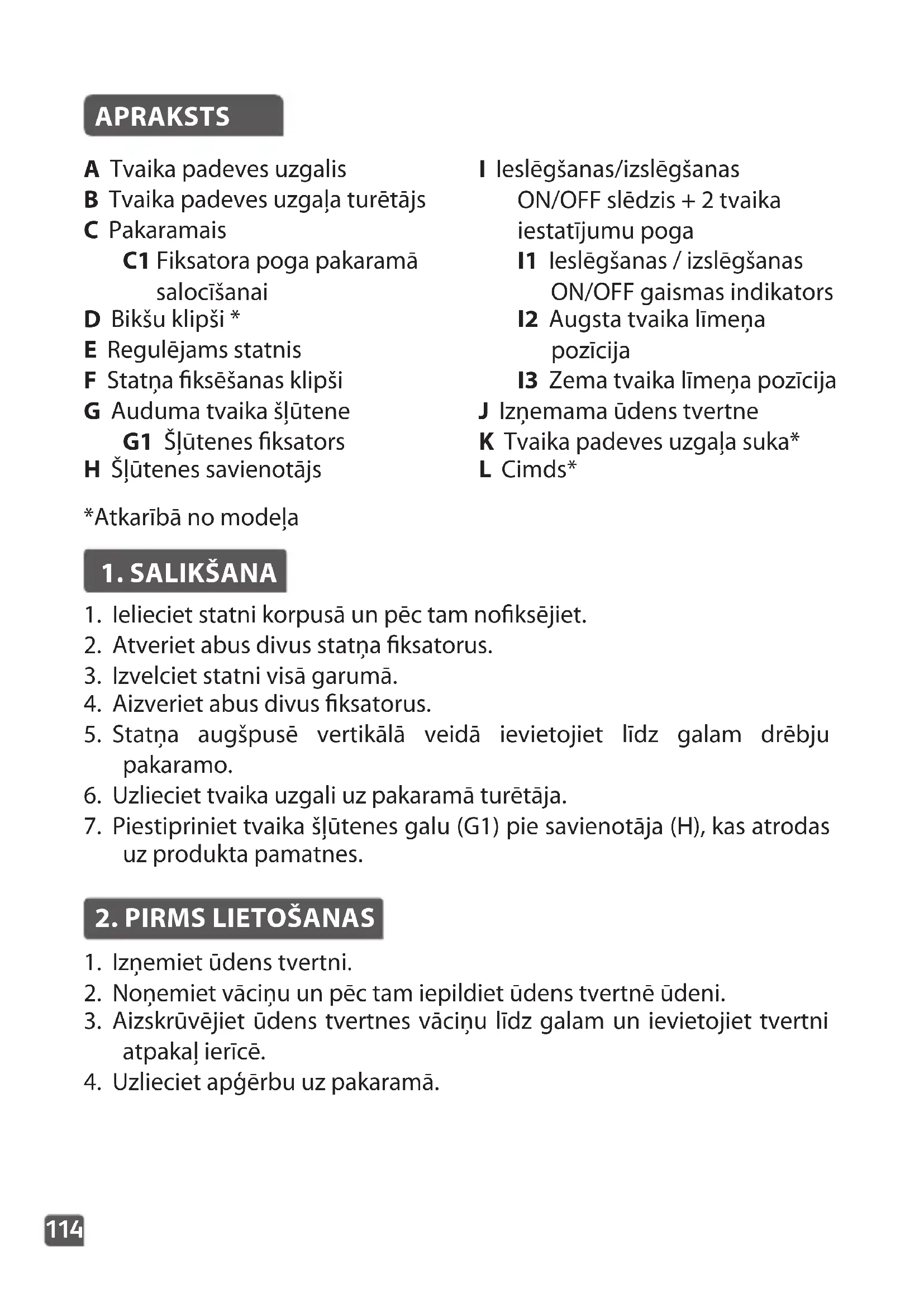 - Ärge kunagi peske ega loputage seadet otse valamu kohal.114 APRAKSTS A Tvaika padeves uzgalis B Tvaika padeves uzgaļa turētājs C Pakaramais C1 Fiksatora poga pakaramā salocīšanai D Bikšu klipši * E Regulējams statnis F Statņa fiksēšanas klipši G Auduma tvaika šļūtene G1 Šļūtenes fiksators H Šļūtenes savienotājs I Ieslēgšanas/izslēgšanas ON/OFF slēdzis + 2 tvaika iestatījumu poga I1 Ieslēgšanas / izslēgšanas ON/OFF gaismas indikators I2 Augsta tvaika līmeņa pozīcija I3 Zema tvaika līmeņa pozīcija J Izņemama ūdens tvertne K Tvaika padeves uzgaļa suka* L Cimds*