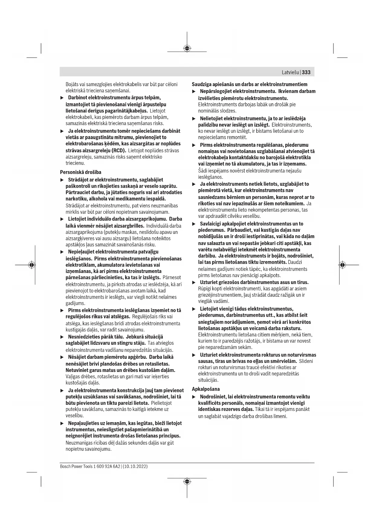 Norādītās griešanās ātruma priekšizvēles pakāpēm atbilstošās griešanās ātruma vērtības ir aptuvenas. Montāža Aizsargierīces montāža u Pirms elektroinstrumenta apkopes vai apkalpošanas izvelciet tā elektrokabeļa kontaktdakšu no barojošā elektrotīkla kontaktligzdas. Piezīme. Ja darba laikā salūzt slīpēšanas disks vai tiek bojātas aizsargpārsega/elektroinstrumenta stiprināšanas ierīces, elektroinstruments nekavējoties jānosūta uz klientu apkalpošanas remonta darbnīcu, kuras adrese ir sniegta sadaļā „Klientu apkalpošanas dienests un konsultācijas par lietošanu“. Slīpēšanas aizsargpārsegs Novietojiet aizsargpārsegu (11) uz elektroinstrumenta stiprinājuma tā, lai pārsega kodēšanas izciļņi sakristu ar stiprinājuma gropēm. Nospiediet un turiet nospiestu atbloķēšanas sviru (1). Spiediet aizsargpārsegu (11) uz darbvārpstas aptveres, līdz aizsargpārsega apcilnis piekļaujas pie elektroinstrumenta atloka, un grieziet aizsargpārsegu, līdz tas dzirdami fiksējas. Pielāgojiet aizsargpārsega pozīciju (11) darba vajadzībām. Lai to izdarītu, spiediet atbloķēšanas sviru (1) uz augšu un grieziet aizsargpārsegu (11) vēlamajā pozīcijā. u Vienmēr noregulējiet aizsargpārsegu(11) tā, lai visi atbloķēšanas sviras (1) izciļņi ieķertos atbilstošajās aizsargpārsega (11) atverēs. u Pagrieziet aizsargpārsegu (11) tā, lai tiktu novērsta dzirksteļu lidošana elektroinstrumenta lietotāja virzienā. u Aizsargpārsegs(11) drīkst būt pagriežams tikai tad, kad darbina atbloķēšanas sviru(1) ! Citādi elektroinstrumenta lietošanu nekādā gadījumā nedrīkst turpināt un tas ir jānogādā klientu apkalpošanas dienestā. Norāde: aizsargpārsega (11) kodēšanas izciļņi nodrošina, ka var montēt tikai vienu elektroinstrumentam piemērotu aizsargpārsegu. Aizsargpārsegs griešanai u Griešanai vienmēr izmantojiet griešanas aizsargpārsegu(13) vai slīpēšanas aizsargpārsegu (11) kopā ar griešanas aizsargpārsegu (15). u Veicot akmens griešanu, nodrošiniet pietiekošu putekļu uzsūkšanu. Bosch Power Tools 1 609 92A 6A2 | (10.10.2022)340 | Latviešu Griešanas aizsargpārsegs(13) ir nostiprināms līdzīgi kā slīpēšanas aizsargpārsegs(11). Griešanas aizsargpārsegs no metāla Samontējiet metāla griešanas aizsargpārsegu(15) uz slīpēšanas aizsargpārsega(11) (skatīt attēlu A): Pagrieziet fiksēšanas loku atpakaļ (➊). Uzlieciet aizsargpārsegu(15) uz slīpēšanas aizsargpārsega(11) (➋). Piespiediet fiksēšanas loku cieši pie aizsargpārsega(11) (➌). Lai veiktu demontāžu (skatīt attēluB) nospiediet pogu uz fiksēšanas loka (➊) un pagrieziet to atpakaļ (➋). Novelciet pārsegu (15) no aizsargpārsega (11) (➌). Plastmasas griešanas aizsargpārsegs Uzlieciet plastmasas griešanas aizsargpārsegu(15) uz slīpēšanas aizsargpārsega(11) (skatīt attēluC). Pārsegs(15) dzirdami un redzami nofiksējas uz aizsargpārsega(11). Lai veiktu demontāžu (skatīt attēluD) atbrīvojiet pārsegu(15) uz aizsargpārsega(11) (➊) kreisajā vai labajā pusē un novelciet pārsegu (➋). Uzsūkšanas pārsegs darbam ar griešanas vadotni Griešanā ar vadotni izmantojamo nosūkšanas pārsegu(27) nostiprina līdzīgi kā slīpēšanas aizsargpārsegu. Nostiprinot papildrokturi(9)/(10) caur loku pie nosūkšanas pārsega pie visa korpusa, elektroinstruments tiek cieši savienots ar nosūkšanas pārsegu. Pie nosūkšanas pārsega ar griešanas vadotni(27) var pieslēgt piemērotu Bosch vakuumsūcēju. Šim nolūkam ievietojiet uzsūkšanas šļūteni ar uzsūkšanas adapteri tam paredzētajā nosūkšanas pārsega uzgalī. Norādījums: berze, kuru rada putekļi uzsūkšanas šļūtenē un piederumā uzsūkšanas laikā, izraisa elektrostatisko lādiņu, kuru lietotājs var sajust kā elektrostatiskā lādiņa izlādi (atkarībā no apkārtējās vides faktoriem un viņa fizioloģiskā stāvokļa). Smalko putekļu un sausu materiālu uzsūkšanai Bosch parasti rekomendē izmantot antistatisko uzsūkšanas šļūteni (Piederums). Roku aizsargs u Darbam ar gumijas slīpēšanas pamatni(20) vai ar kausveida/konisko suku/dimanta kroņurbi vienmēr samontējiet uz instrumenta roku aizsargu (19). Roku aizsargs (19) ir nostiprināms kopā ar papildrokturi (9). Standarta papildrokturis/pretvibrācijas papildrokturis Atbilstīgi veicamajam darbam ieskrūvējiet papildrokturi(9)/ (10) reduktora galvas labajā vai kreisajā pusē. u Lietojiet elektroinstrumentu tikai ar nostiprinātu papildrokturi (9)/(10). u Neizmantojiet elektroinstrumentu, ja tā papildrokturis (9)/(10) ir bojāts. Ir aizliegts veikt izmaiņas papildroktura konstrukcijā(9)/(10). Vibrācijas slāpējošā papildroktura izmantošana(10) nodrošina samazinātu vibrāciju apjomu un līdz ar to patīkamāku un drošāku darba vidi. Slīpēšanas darbinstrumenta montāža un demontāža Lūdzu ievērojiet īpašos X-LOCK darbinstrumentu montāžas norādījumus. u Pirms elektroinstrumenta apkopes vai apkalpošanas izvelciet tā elektrokabeļa kontaktdakšu no barojošā elektrotīkla kontaktligzdas. u Nepieskarieties slīpēšanas un griešanas diskiem, pirms tie nav atdzisuši. Darba laikā diski stipri sakarst. u Lietojiet vienīgi oriģinālos X-LOCK nomaināmos darbinstrumentus, kas ir apzīmēti ar logotipu X-LOCK. Vienīgi, X-LOCK nomaināmie darbinstrumenti ļauj nodrošināt, lai skaidas biezums nepārsniegtu 1,6mm. Ja skaidas biezums ir lielāks, var kļūt nedrošs iestiprinājums, kā rezultātā var atvērties iestiprināšanas ierīce. u Lietojot X-LOCK nomaināmos darbinstrumentus, nav jālieto ne piespiedējpaplāksne, ne arī balstpaplāksne. u Pārliecinieties, ka iestiprināmais darbinstruments un tā stiprinājums nav deformēti un uz tiem nav netīrumu un apstrādājamā materiāla daļiņu. Ievērojiet slīpēšanas darbinstrumentu izmērus. Pirms X-LOCK nomaināmā darbinstrumenta montāžas pārliecinieti