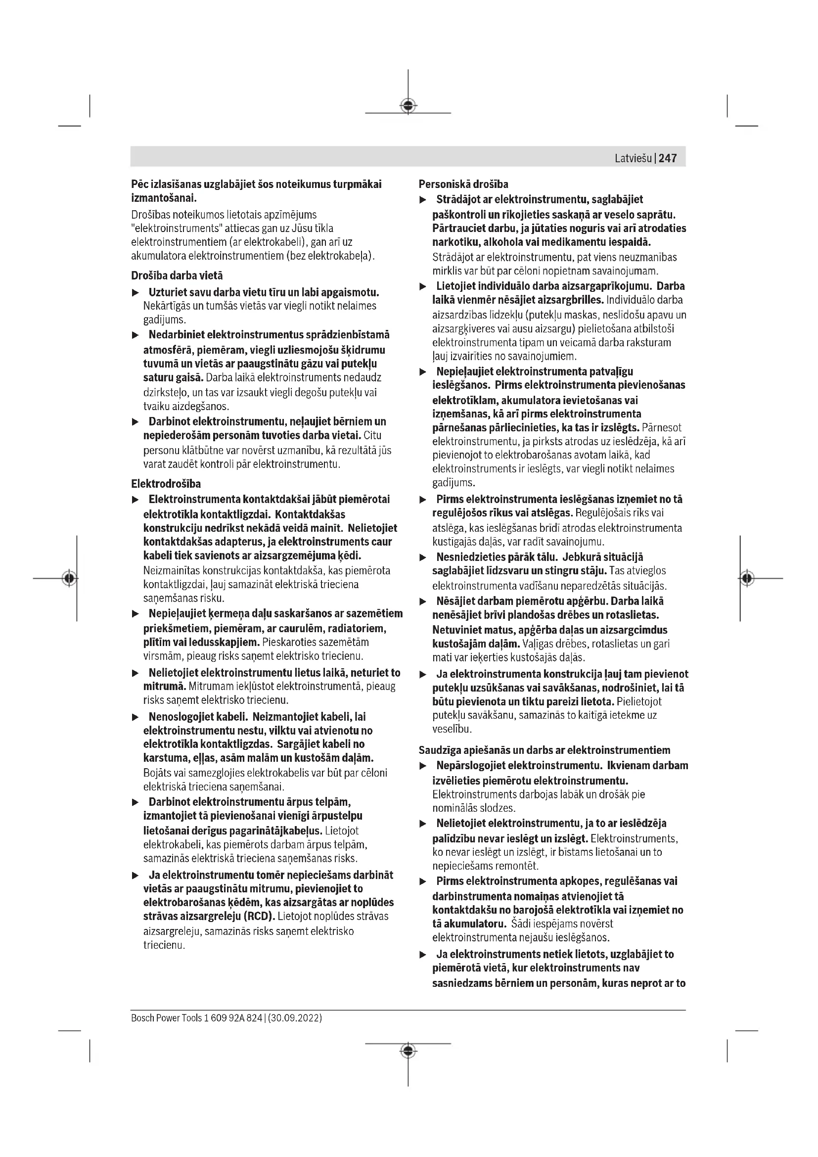 ] [m/s] 230 8 22,2 6500 80 180 – – 6500 80 100 30 M14 8500 45 Tolmu/saepuru äratõmme Pliisisaldusega värvide, teatud puiduliikide, mineraalide ja metalli tolm võib kahjustada tervist. Tolmuga kokkupuude ja tolmu sissehingamine võib põhjustada seadme kasutajal või läheduses viibivatel inimestel allergilisi reaktsioone ja/või 1 609 92A 824 | (30.09.2022) Bosch Power ToolsEesti | 245 hingamisteede haigusi. Teatud tolm, näiteks tamme- ja pöögitolm, on vähkitekitava toimega, iseäranis kombinatsioonis puidutöötlemisel kasutatavate lisaainetega (kromaadid, puidukaitsevahendid). Asbesti sisaldavat materjali tohivad töödelda üksnes vastava ala asjatundjad. – Kasutage konkreetse materjali eemaldamiseks sobivat tolmuimejat. – Tagage töökohas hea ventilatsioon. – Soovitav on kasutada hingamisteede kaitsemaski filtriga P2. Pidage kinni töödeldavate materjalide suhtes Teie riigis kehtivatest eeskirjadest. u Vältige tolmu kogunemist töökohta. Tolm võib kergesti süttida. Kasutus Kasutuselevõtt u Pöörake tähelepanu võrgupingele! Vooluallika pinge peab ühtima elektrilise tööriista andmesildil märgitud pingega. Andmesildil toodud 230V seadmeid võib kasutada ka 220V võrgupinge korral. Kui elektriline tööriist saab toite mobiilsetest vooluallikatest (generaatorid), mille võimsusreservid ei ole piisavad või millel puudub sobiv käivitusvoolupiirajaga pingeregulaator, võib võimsus sisselülitamisel väheneda või tööriist võib käituda ebaharilikult. Veenduge, et kasutatud toiteallikas, eelkõige võrgupinge ja - sagedus on piisavad. Sisse-/väljalülitamine Elektrilise tööriista sisselülitamiseks lükake lüliti (sisse/ välja) (2) ette ja seejärel vajutage see alla. Selleks et lukustada lülitit (sisse/välja) (2), lükake lülitit (sisse/välja) (2) veel rohkem ettepoole. Elektrilise tööriista väljalülitamiseks vabastage lüliti (sisse/ välja) (2) või juhul, kui see on lukustatud, vajutage korraks lülitile (sisse/välja) (2) ja vabastage see siis. Ilma lukustuseta lüliti (olenevalt kasutusriigist): Elektrilise tööriista sisselülitamiseks lükake lüliti (sisse/ välja) (2) ette ja seejärel vajutage see alla. Elektrilise tööriista väljalülitamiseks vabastage lüliti (sisse/ välja) (2). u Enne kasutamist kontrollige lihvimistarvikud üle. Lihvimistarvik peab olema nõuetekohaselt paigaldatud ja saama vabalt pöörelda. Katsetage tööriista vähemalt 1 minuti jooksul tühikäigul. Ärge kasutage lihvimistarvikuid, mis on vigastada saanud, deformeerunud või vibreerivad. Vigastada saanud lihvimistarvikud võivad puruneda ja tekitada kehavigastusi. Taaskäivitumiskaitse (GWS2000J/GWS2200J/GWS2400J) Taaskäivitumiskaitse hoiab ära elektrilise tööriista kontrollimatu käivitumise pärast voolukatkestust. Taaskasutuselevõtuks viige sisse-/väljalüliti (2) väljalülitatud asendisse ja lülitage elektriline tööriist uuesti sisse. Sujuvkäivitus (GWS2000J/GWS2200J/GWS2400J) Elektroooniline sujuvkäivitus piirab sisselülitamisel pöördemomenti ja võimaldab elektrilise tööriista väheste nõksatustega käivitumist. Märkus: kui elektriline tööriist töötab kohe sisselülitamise järel täis pöörlemiskiirusega, on sujuvkäivitus ja taaskäivituskaitse välja langenud. Saatke elektriline tööriist viivitamatult klienditeenindusse (aadresse vaata lõigust «Klienditeenindus ja kasutaja nõustamine»). Töösuunised u Enne mistahes tööde teostamist elektrilise tööriista kallal tõmmake pistik pistikupesast välja. u Ettevaatust kandvate seinte lõikamisel, vt jaotist "Märkused staatika kohta". u Kui töödeldava detaili omakaal ei taga stabiilset asendit, siis kinnitage see kinnitusvahendite abil. u Ärge rakendage elektrilisele tööriistale sellist koormust, et see seiskub. u Elektrilise tööriista jahutamiseks laske tööriistal pärast suure koormuse all töötamist veel mõned minutid tühikäigul töötada. u Ärge kasutage elektrilist tööriista ketaslõikuri rakises. u Ärge puudutage lihv- ja lõikekettaid enne, kui need on jahtunud. Kettad lähevad töötamisel väga kuumaks. Käiamine u Ärge kunagi kasutage lõikekettaid käiamiseks. Käiamisel saavutate parimad töötulemused 30° kuni 40° nurga all töötades. Juhtige elektrilist tööriista mõõduka survega edasi-tagasi. Nii ei lähe toorik liiga kuumaks, ei muuda värvi ega teki vagusid. Lamell-lihvketas Lamell-lihvkettaga (lisavarustus) saab töödelda ka kumeraid pindu ja profiile. Lamell-lihvketastel on tunduvalt pikem eluiga, madalam müratase ja madalam lihvimistemperatuur kui tavalistel lihvketastel. Metalli lõikamine u Seotud lihvimistarvikutega lõikamiseks kasutage alati lõikamiseks ette nähtud kaitsekatet (14). Lõikamisel töötage mõõduka ja töödeldava materjali jaoks sobiva ettenihkega. Ärge avaldage lõikekettale survet, ärge kallutage ega võngutage lõikeketast. Järelpöörlevaid lõikekettaid ärge pidurdage külgsurve avaldamisega. Bosch Power Tools 1 609 92A 824 | (30.09.2022)246 | Latviešu Elektrilise tööriista ettenihke suund peab alati olema vastupidine liikumissuunale. Vastasel korral tekib oht, et tööriist surutakse kontrollimatult lõikejoonest välja. Profiilide ja nelikanttorude lõikamist alustage väikseimast ristlõikest. Kivi lõikamine u Kivi lõikamisel tuleb tagada piisavalt tõhus tolmuimemine. u Kandke tolmukaitsemaski.u Elektrilist tööriista tohib kasutada üksnes kuivlõikamiseks/kuivlihvimiseks. Kivi lõikamiseks on soovitav kasutada teemantlõikeketast. Juhtkelguga lõikamise tolmueemalduskatte(23) kasutamisel peab tolmuimejal olema kivitolmu eemaldamise kasutusluba. Bosch pakub sobivaid tolmuimejaid. Lülitage elektriline tööriist sisse ja asetage see juhtkelgu esiosaga toorikule. Juhtige elektrilist tööriista töödeldavale materjalile vastava mõõduka ettenihkega. Eriti kõva materjali, nt suure ränisisaldusega betooni lõikamisel võib teemantlõikeketas üle kuumeneda ja seeläbi kahju