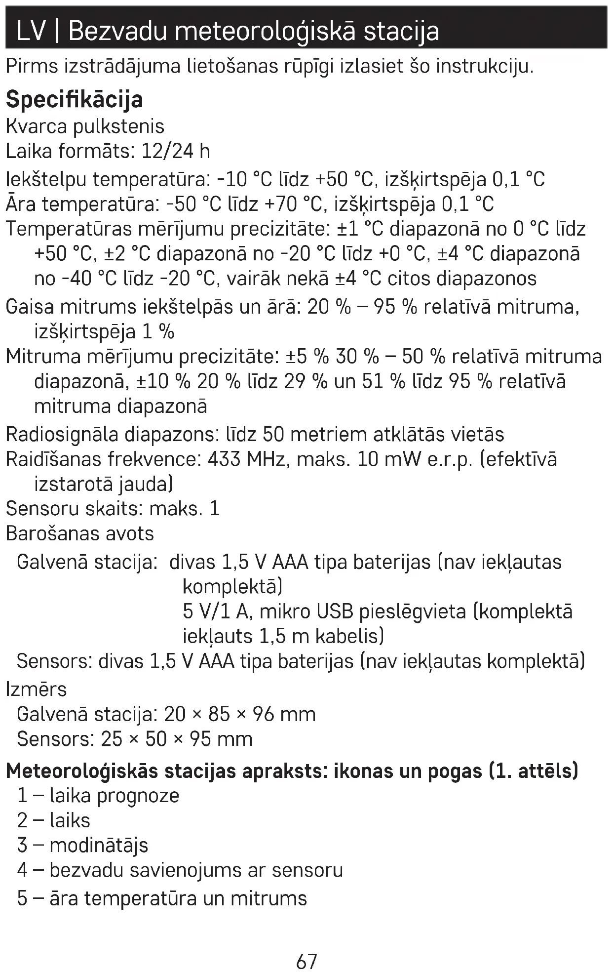 diapazons var būtiski mazināties teritorijās ar daudziem šķērš- ļiem. Sensors ir izturīgs pret ūdens lāsēm, taču to nevajadzētu ilgstoši pakļaut lietus iedarbībai. Nenovietojiet sensoru uz metāla priekšmetiem, jo tie mazina raidīšanas attālumu. Izmantojiet sensoru tikai vertikālā stāvoklī. Ja meteoroloģiskās stacijas ekrāns rāda izlādējušās baterijas ikonu āra temperatūras laukā, nomainiet sensora baterijas.