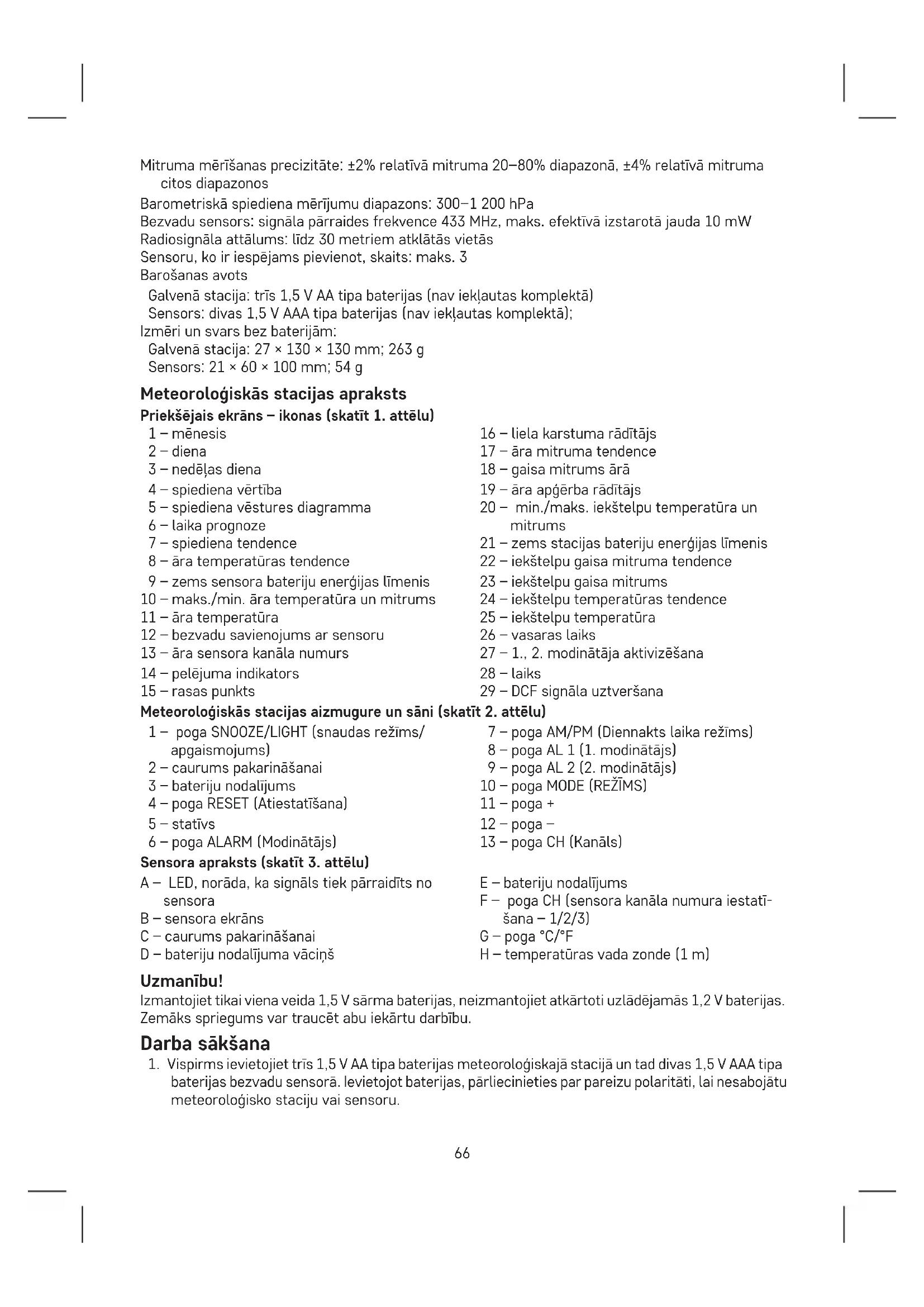 baterijas bezvadu sensorā. Ievietojot baterijas, pārliecinieties par pareizu polaritāti, lai nesabojātu meteoroloģisko staciju vai sensoru.67
