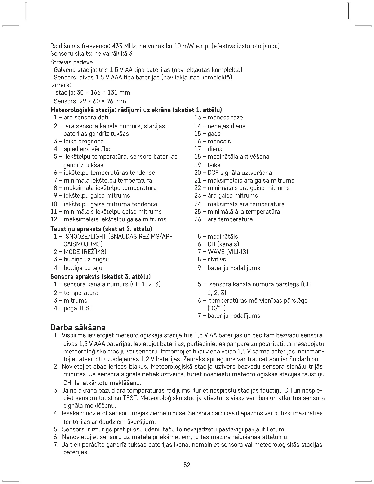 divas 1,5 V AAA baterijas. Ievietojot baterijas, pārliecinieties par pareizu polaritāti, lai nesabojātu meteoroloģisko staciju vai sensoru. Izmantojiet tikai viena veida 1,5 V sārma baterijas, neizman- tojiet atkārtoti uzlādējamās 1,2 V baterijas. Zemāks spriegums var traucēt abu ierīču darbību.