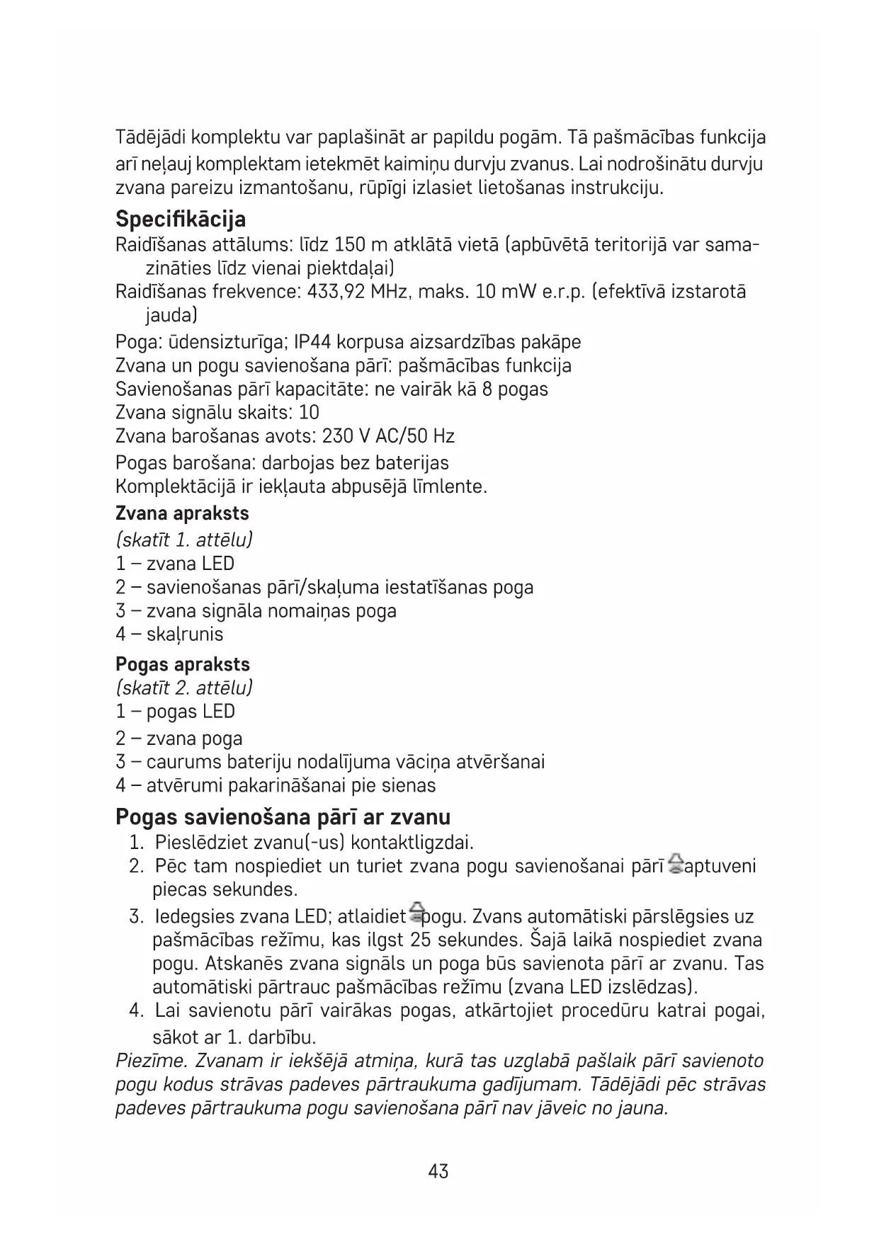 - Periodiski pārbaudiet durvju zvana pogas funkcionalitāti un laikus no- mainiet bateriju.