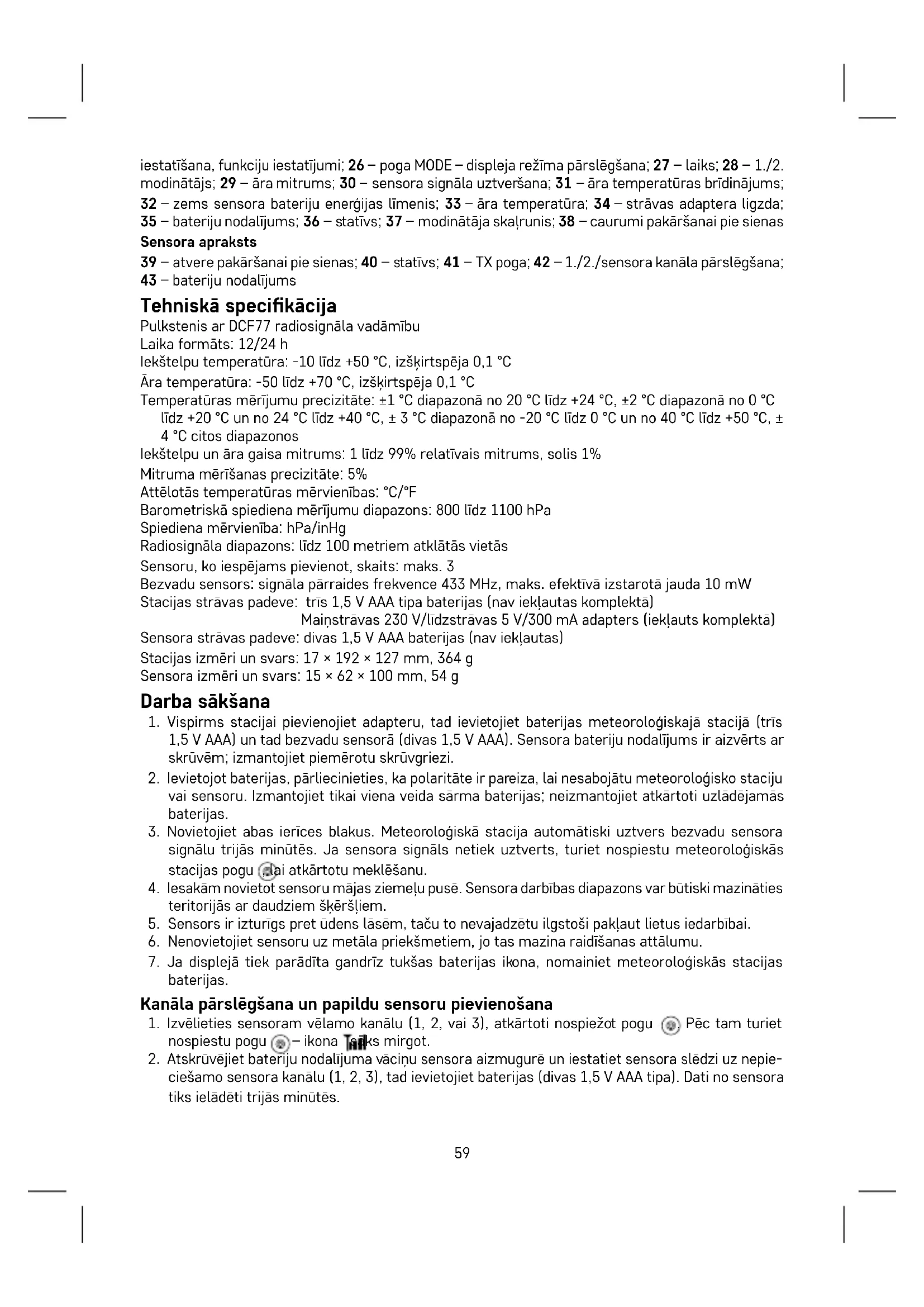 - atmosfēras traucējumi, pērkona negaiss, elektroierīces bez iejaukšanās novēršanas, televizori un datori, kas atrodas DCF uztvērēja tuvumā. Manuālie iestatījumi Vērtības var izmainīt, izmantojot pogas un . Pēc nepieciešamās vērtības iestatīšanas un, nepiespiežot nevienu citu pogu, iestatītās vērtības tiks automātiski saglabātas un displejs pārslēgsies uz galveno ekrānu. Laika, datuma un laika zonas iestatīšana Nospiediet pogu . Nospiediet pogu trīs sekundes un izmantojiet pogas un , lai iestatītu šādas vērtības: laika josla, kalendāra valoda (ENG, GER, FRE, ITA, DUT, SPA, DAN), gads, datuma formāts, mēnesis, diena, 12/24 h laika formāts, stunda, minūte, sekunde. Apstipriniet iestatīto vērtību, nospiežot pogu ; turot nospiestus bulttaustiņus, iestatījumu pārs- lēgšana notiek paātrināti. Modinātāja iestatījumi Meteoroloģiskajā stacijā ir iespējams iestatīt divus modinātājus.61