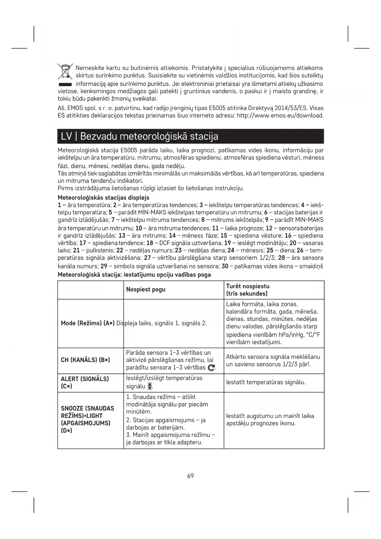 - Jokios instrukcijų dalies negalima atkurti be raštiško gamintojo sutikimo.69 Nemeskite kartu su buitinėmis atliekomis. Pristatykite į specialius rūšiuojamoms atliekoms skirtus surinkimo punktus. Susisiekite su vietinėmis valdžios institucijomis, kad šios suteiktų informaciją apie surinkimo punktus. Jei elektroniniai prietaisai yra išmetami atliekų užkasimo vietose, kenksmingos medžiagos gali patekti į gruntinius vandenis, o paskui ir į maisto grandinę, ir tokiu būdu pakenkti žmonių sveikatai. Aš, EMOS spol. s r. o. patvirtinu, kad radijo įrenginių tipas E5005 atitinka Direktyvą 2014/53/ES. Visas ES atitikties deklaracijos tekstas prieinamas šiuo interneto adresu: http://www.emos.eu/download. LV | Bezvadu meteoroloģiskā stacija Meteoroloģiskā stacija E5005 parāda laiku, laika prognozi, patīkamas vides ikonu, informāciju par iekštelpu un āra temperatūru, mitrumu, atmosfēras spiedienu, atmosfēras spiediena vēsturi, mēness fāzi, dienu, mēnesi, nedēļas dienu, gada nedēļu. Tās atmiņā tiek saglabātas izmērītās minimālās un maksimālās vērtības, kā arī temperatūras, spiediena un mitruma tendenču indikatori. Pirms izstrādājuma lietošanas rūpīgi izlasiet šo lietošanas instrukciju. Meteoroloģiskās stacijas displejs 1 – āra temperatūra; 2 – āra temperatūras tendences; 3 – iekštelpu temperatūras tendences; 4 – iekš- telpu temperatūra; 5 – parādīt MIN-MAKS iekštelpas temperatūru un mitrumu; 6 – stacijas baterijas ir gandrīz izlādējušās; 7 – iekštelpu mitruma tendences; 8 – mitrums iekštelpās; 9 – parādīt MIN-MAKS āra temperatūru un mitrumu; 10 – āra mitruma tendences; 11 – laika prognoze; 12 – sensora baterijas ir gandrīz izlādējušās; 13 – āra mitrums; 14 – mēness fāze; 15 – spiediena vēsture; 16 – spiediena vērtība; 17 – spiediena tendence; 18 – DCF signāla uztveršana; 19 – ieslēgt modinātāju; 20 – vasaras laiks; 21 – pulkstenis; 22 – nedēļas numurs; 23 – nedēļas diena; 24 – mēnesis; 25 – diena; 26 – tem- peratūras signāla aktivizēšana; 27 – vērtību pārslēgšana starp sensoriem 1/2/3; 28 – āra sensora kanāla numurs; 29 – simbols signāla uztveršanai no sensora; 30 – patīkamas vides ikona – smaidiņš Meteoroloģiskā stacija: iestatījumu opciju vadības poga Nospiest pogu Turēt nospiestu (trīs sekundes) Mode (Režīms) (A*) Displeja laiks, signāls 1, signāls 2. Laika formāta, laika zonas, kalendāra formāta, gada, mēneša, dienas, stundas, minūtes, nedēļas dienu valodas, pārslēgšanās starp spiediena vienībām hPa/inHg, °C/°F vienībām iestatījumi. CH (KANĀLS) (B*) Parāda sensora 1–3 vērtības un aktivizē pārslēgšanas režīmu, lai parādītu sensora 1–3 vērtības