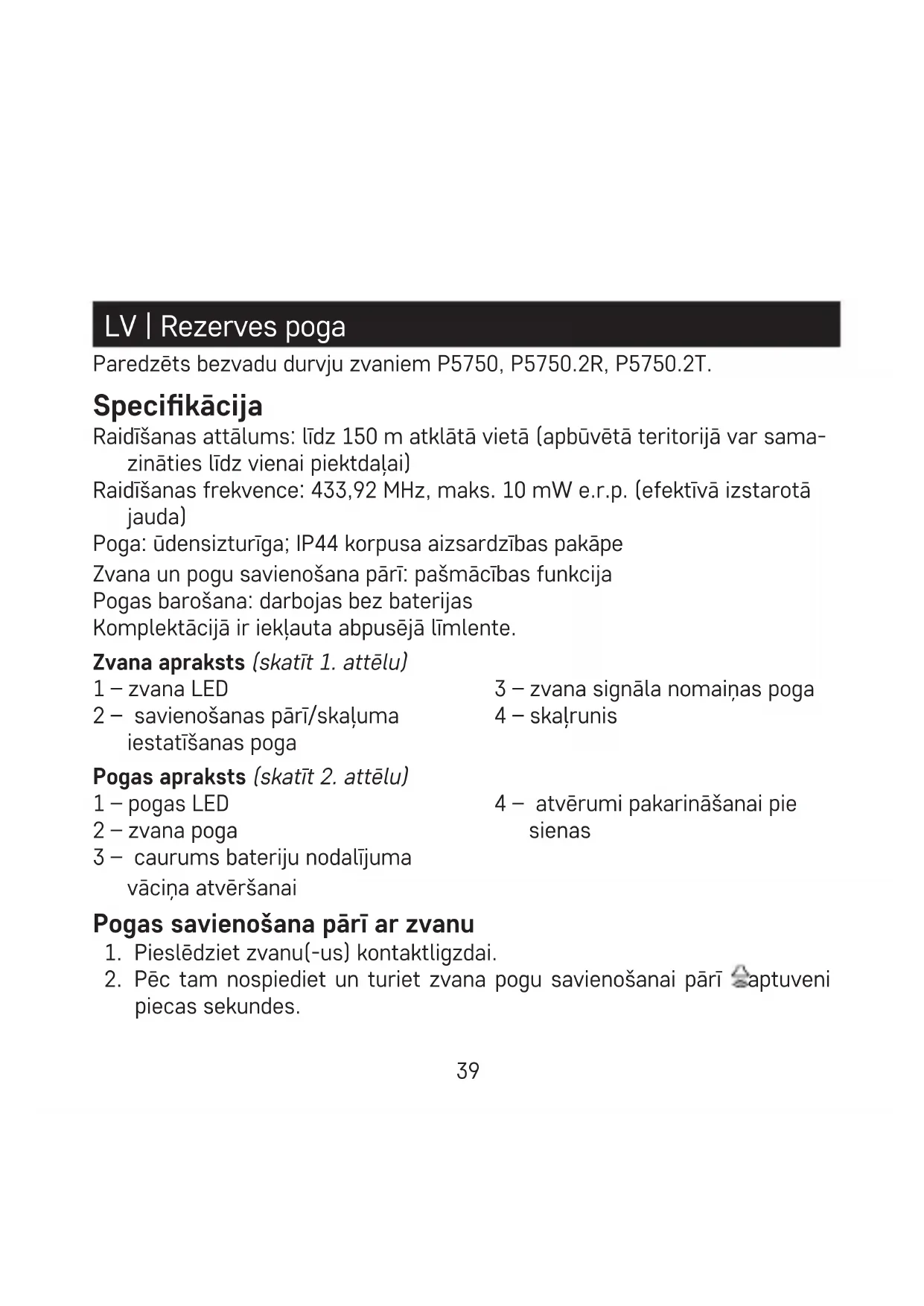 - Šis prietaisas nėra skirtas naudoti asmenims (įskaitant vaikus), turintiems zinę, jutiminę arba protinę negalią, taip pat neturintiems patirties ir žinių, kurios reikalingos saugiam naudojimui, nebent už tokių asmenų saugumą atsakingas asmuo juos prižiūri arba nurodo, kaip naudotis prietaisu. Visada prižiūrėkite vaikus ir užtikrinkite, kad jie nežaistų su prietaisu. Aš, EMOS spol. s r. o. patvirtinu, kad radijo įrenginių tipas P5750T atitinka Direktyvą 2014/53/ES. Visas ES atitikties deklaracijos tekstas prieinamas šiuo interneto adresu: http://www.emos.eu/download.39 LV | Rezerves poga Paredzēts bezvadu durvju zvaniem P5750, P5750.2R, P5750.2T. Specikācija Raidīšanas attālums: līdz 150 m atklātā vietā (apbūvētā teritorijā var sama- zināties līdz vienai piektdaļai) Raidīšanas frekvence: 433,92 MHz, maks. 10 mW e.r.p. (efektīvā izstarotā jauda) Poga: ūdensizturīga; IP44 korpusa aizsardzības pakāpe Zvana un pogu savienošana pārī: pašmācības funkcija Pogas barošana: darbojas bez baterijas Komplektācijā ir iekļauta abpusējā līmlente. Zvana apraksts (skatīt 1. attēlu) 1 – zvana LED 2 – savienošanas pārī/skaļuma iestatīšanas poga 3 – zvana signāla nomaiņas poga 4 – skaļrunis Pogas apraksts (skatīt 2. attēlu) 1 – pogas LED 2 – zvana poga 3 – caurums bateriju nodalījuma vāciņa atvēršanai 4 – atvērumi pakarināšanai pie sienas Pogas savienošana pārī ar zvanu